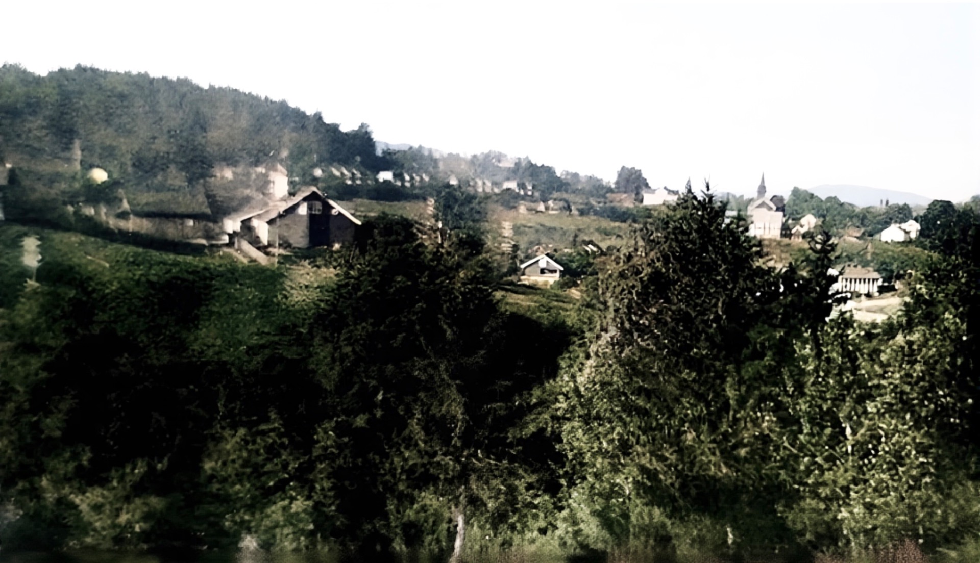 Bildet er tatt oppe i bakken mot hovedgården og er et utsnitt. Nærmast ser vi endeveggen på Kampen. Kamperhaug ligger midt i bildet mot toppen. Detta er ett av to bilder som fanger opp alle uthusa på plasssen (vagt).