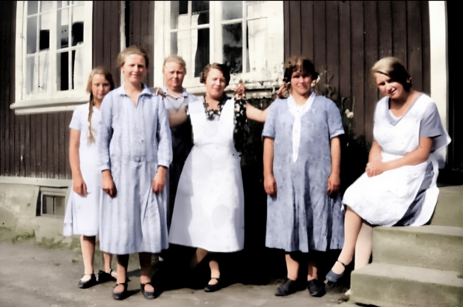 Ekornrød rundt 1930, fra venstre: Jonni Andrea Ingulstad, født 1915 - Karoline Jakobsen - Anne Ingulstad - ANNE BJERVAMOEN - Olette Moen - Esther Ingulstad.