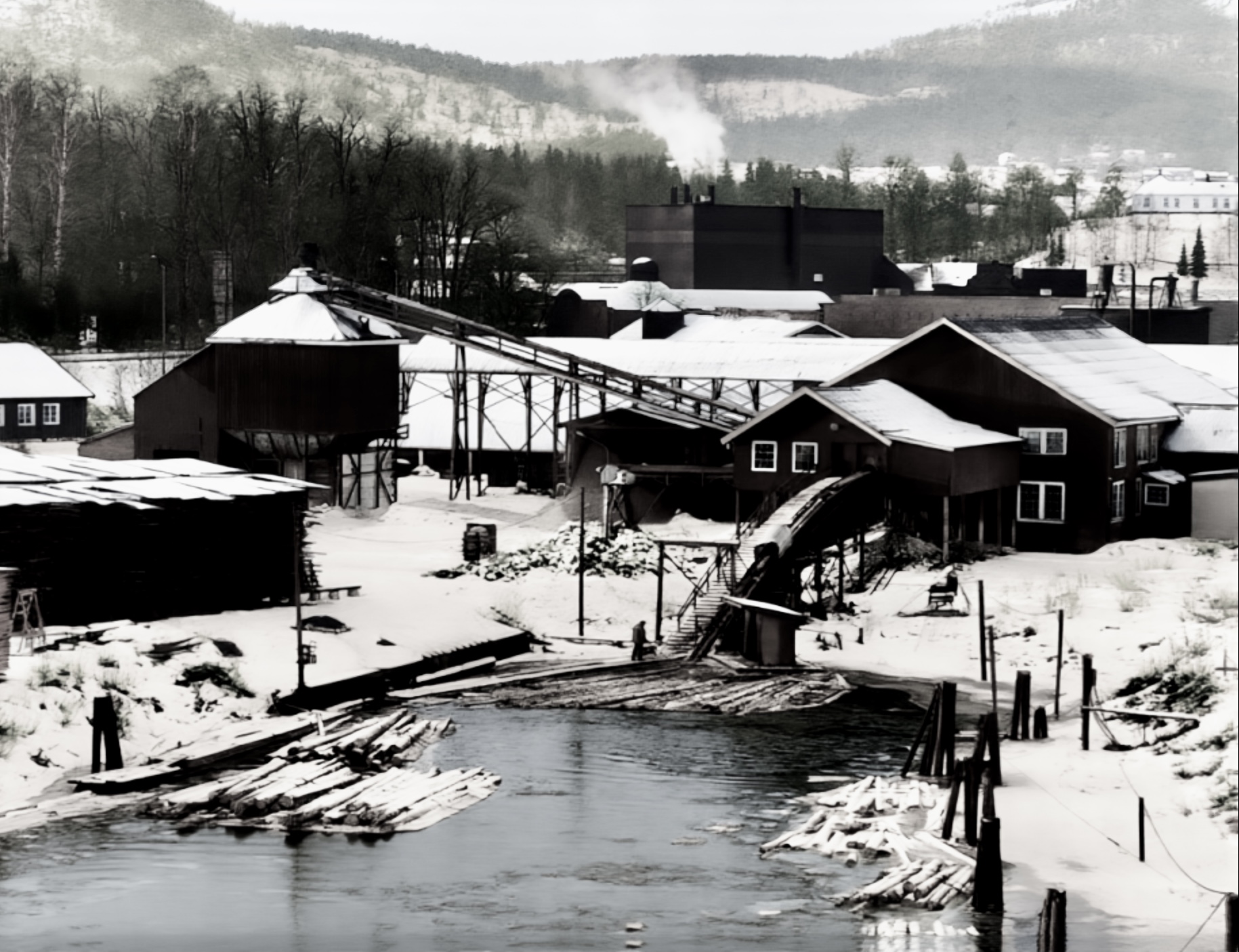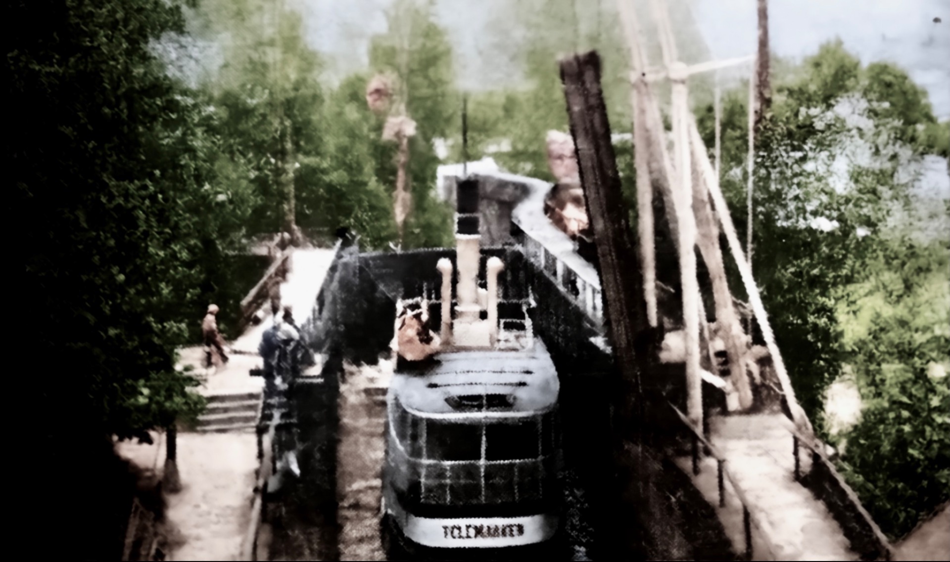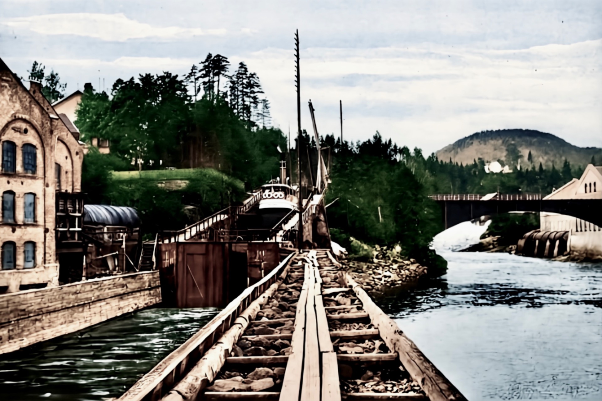 Før 1933. Victoria på Ulefoss og løfteanordningen på venstre side som kobla Sagene og verkssida sammen med hjølp av den gamle brua.