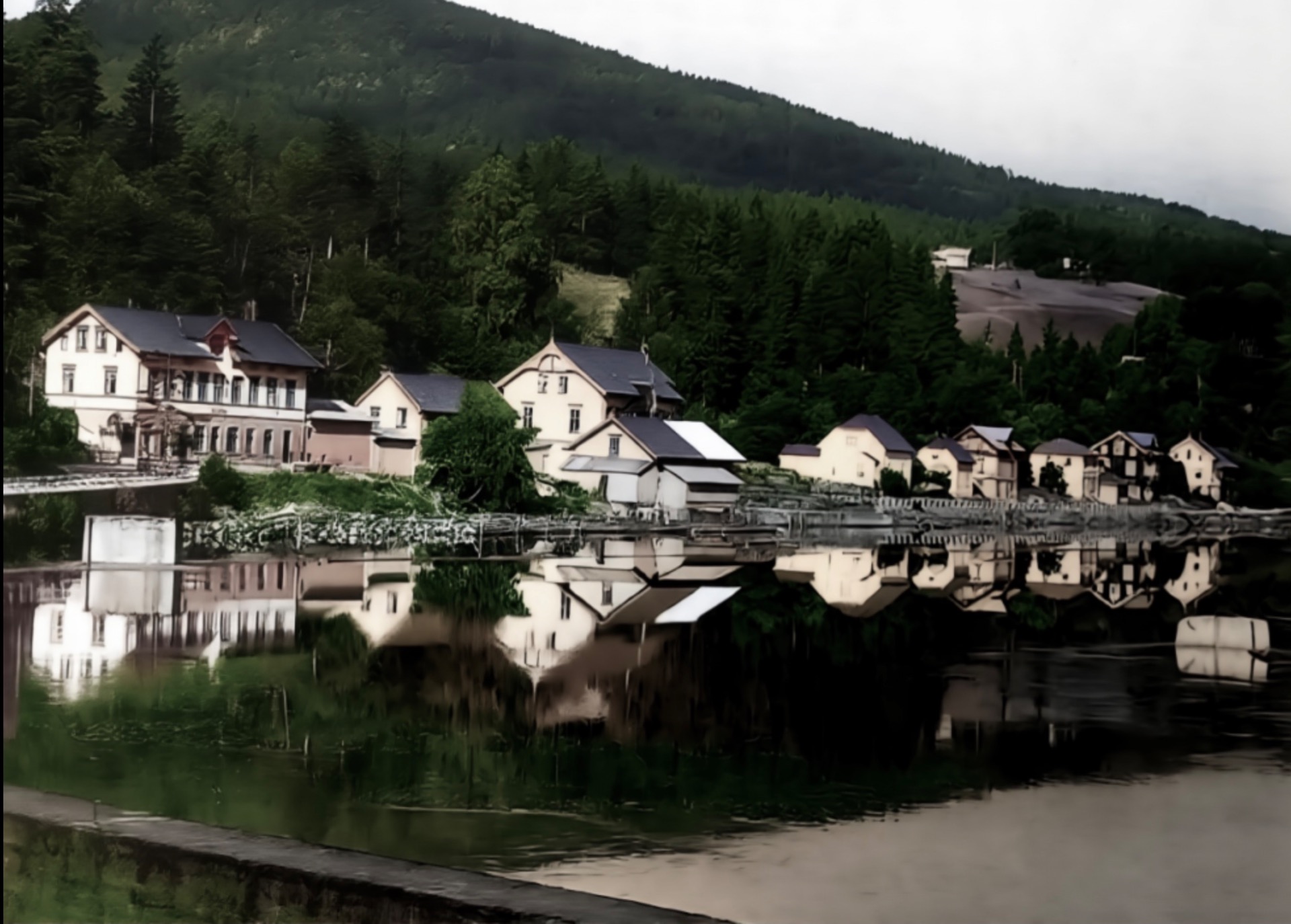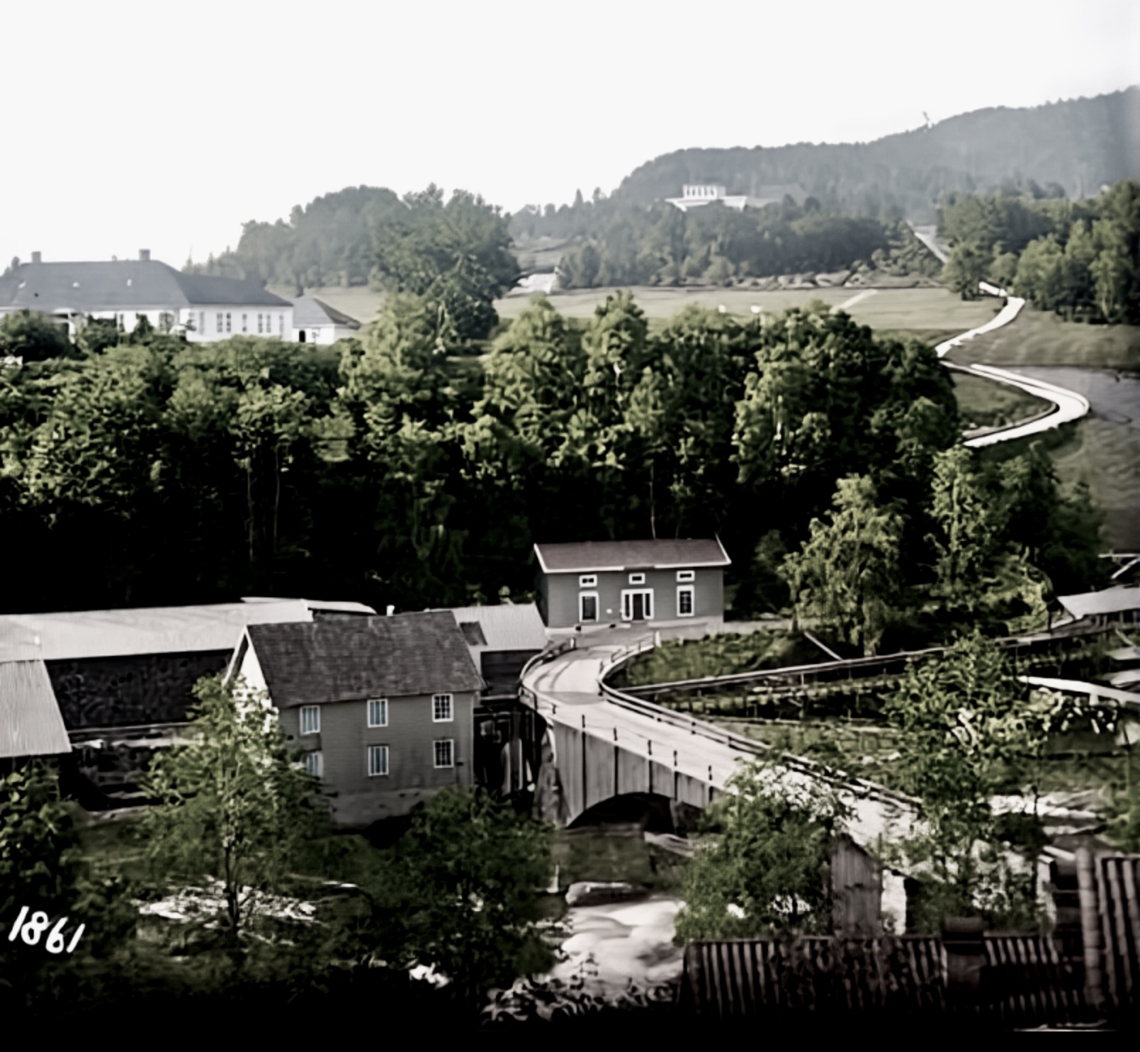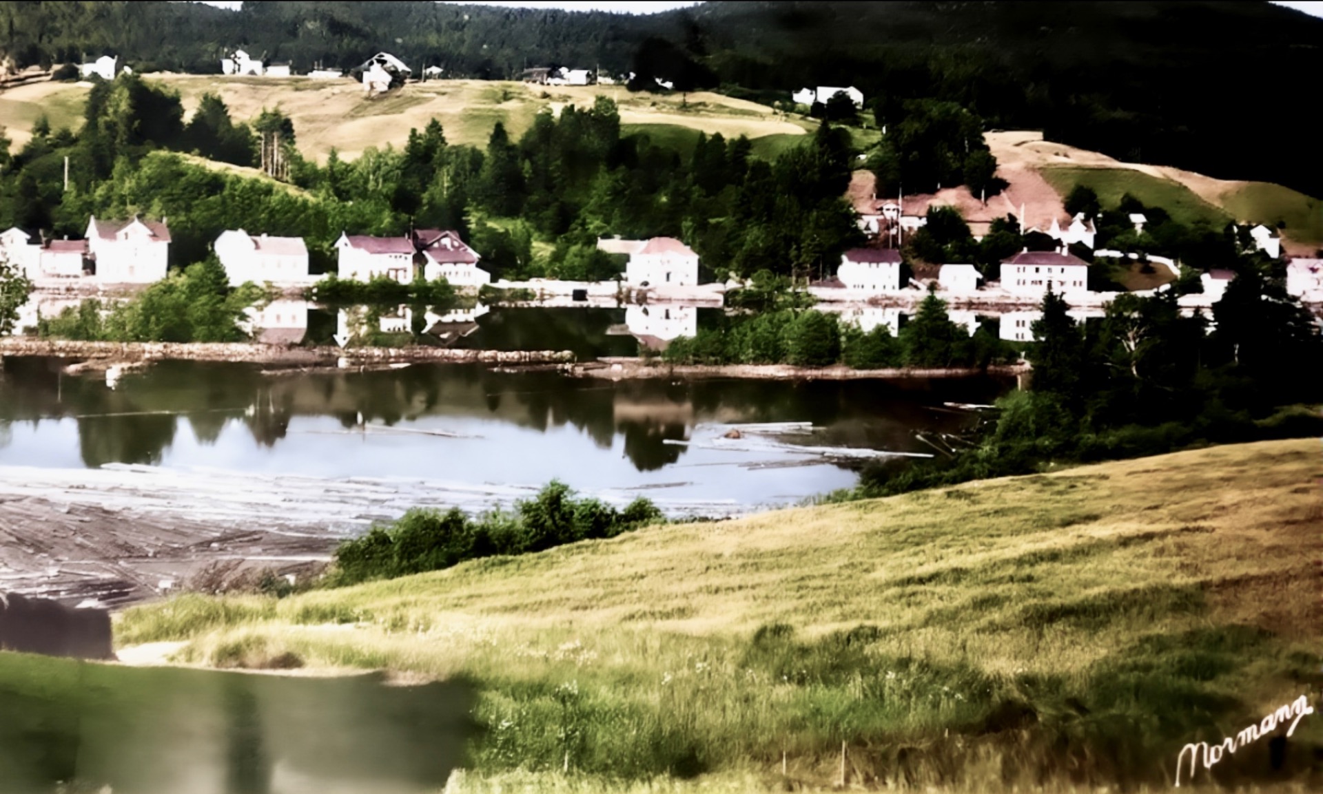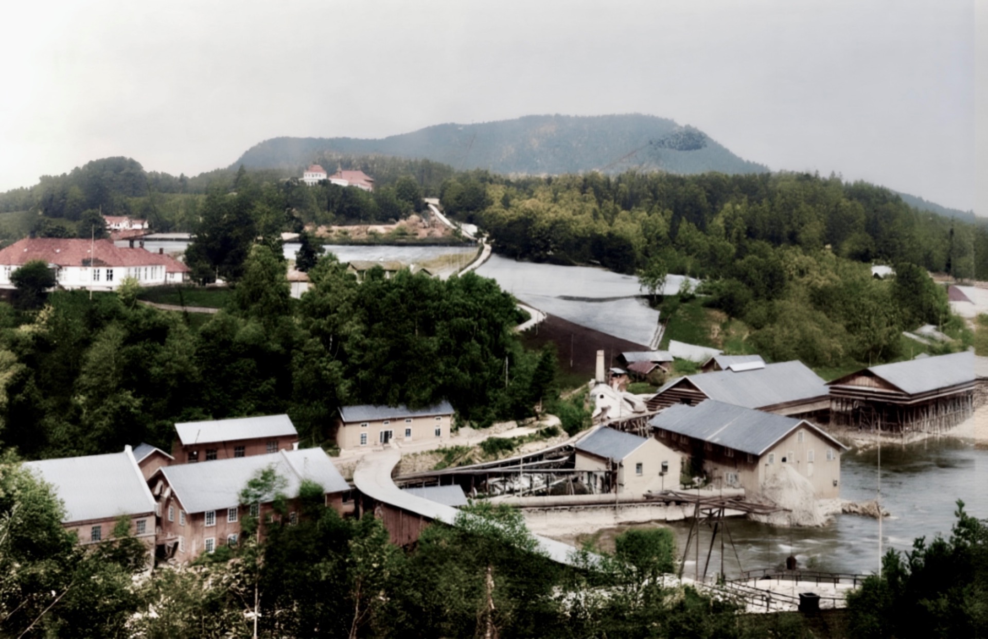 Håndkolorert fra rundt 1895? Fra venstre ser vi Kohinor, kjerka, husa på Pilerud så Finsrud, verksplassen Sverge, det store med uthus mot oss er verksplassen Svingen. Bak Svingen ser vi litt av øvre Verket. Lengst te høyre har vi verksplassen Sibirien. Ned mot brygga ser vi hus som i dag er borte.