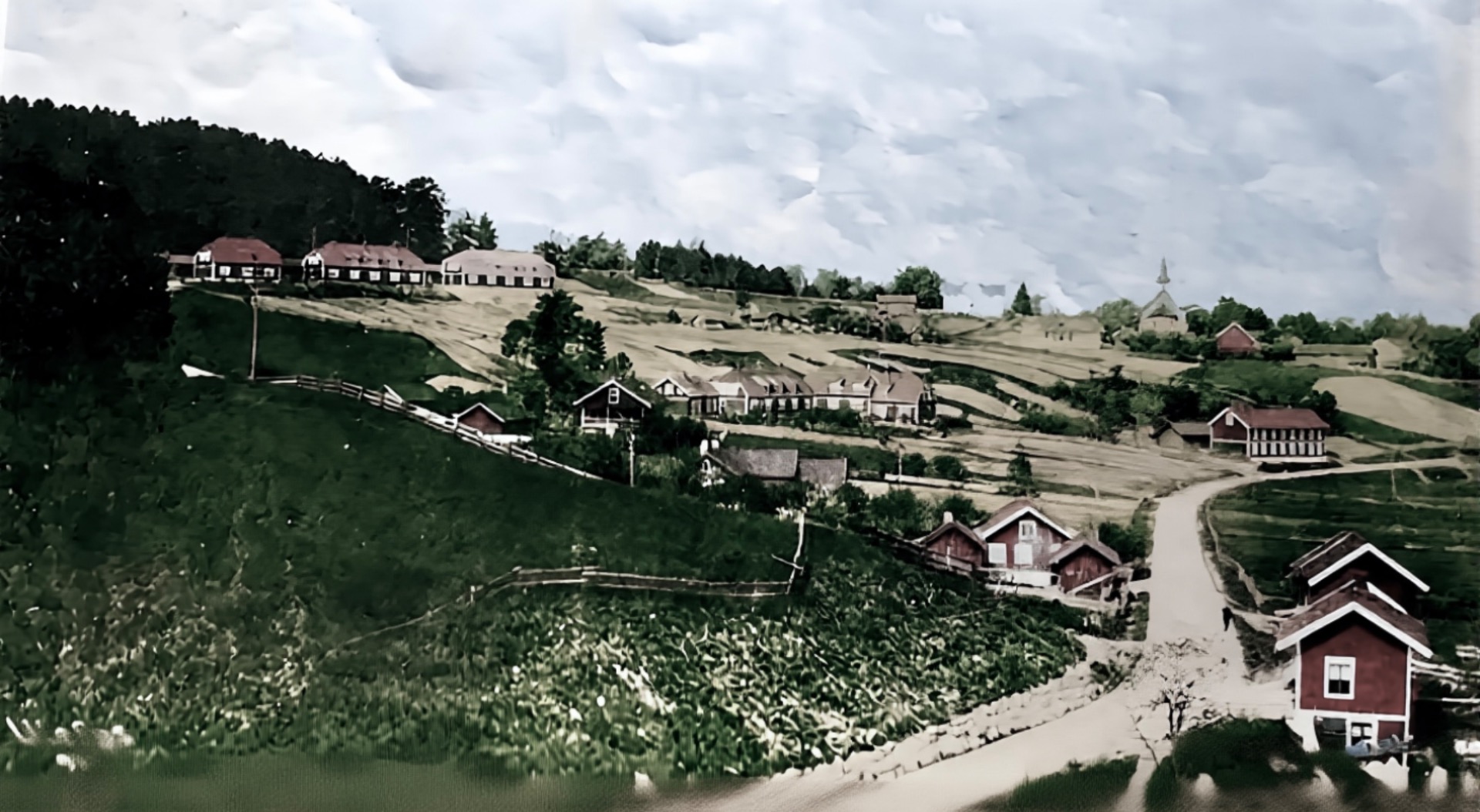 Maleri fra 1904 av Gunder Hansen Sandbakken. Han ser du meir av i bolken « Kunst i Holla». I detta maleriet er det fleire interessante ting å legge merke te. Skogen lengst te venstre er der dagens ungdomsskole har sin plen på nedsida av skolebygget. Helgas va her grått. Det hadde først vært sennepsgult. Rundt år 1900 va det her verksungane gjekk på skolen. Tidligare hadde den liggi i huset rett te høyre for Helgas. Der skulle den ha vært fra rundt 1780 te ca 1880. Så har vi det sennepsgule med et lite bislag ved inngangen og et rundt vindu i gavlen. Vi ser lengst te høyre litt av uthusa på Pilerud. Jeg har tidligare pekt på at plassen Kabbe lå i detta området. Kan det sennepsgule ha vært plassen Kabbe??? Huseplassen ligger der den nye store skolen blei bygd rundt 1921.