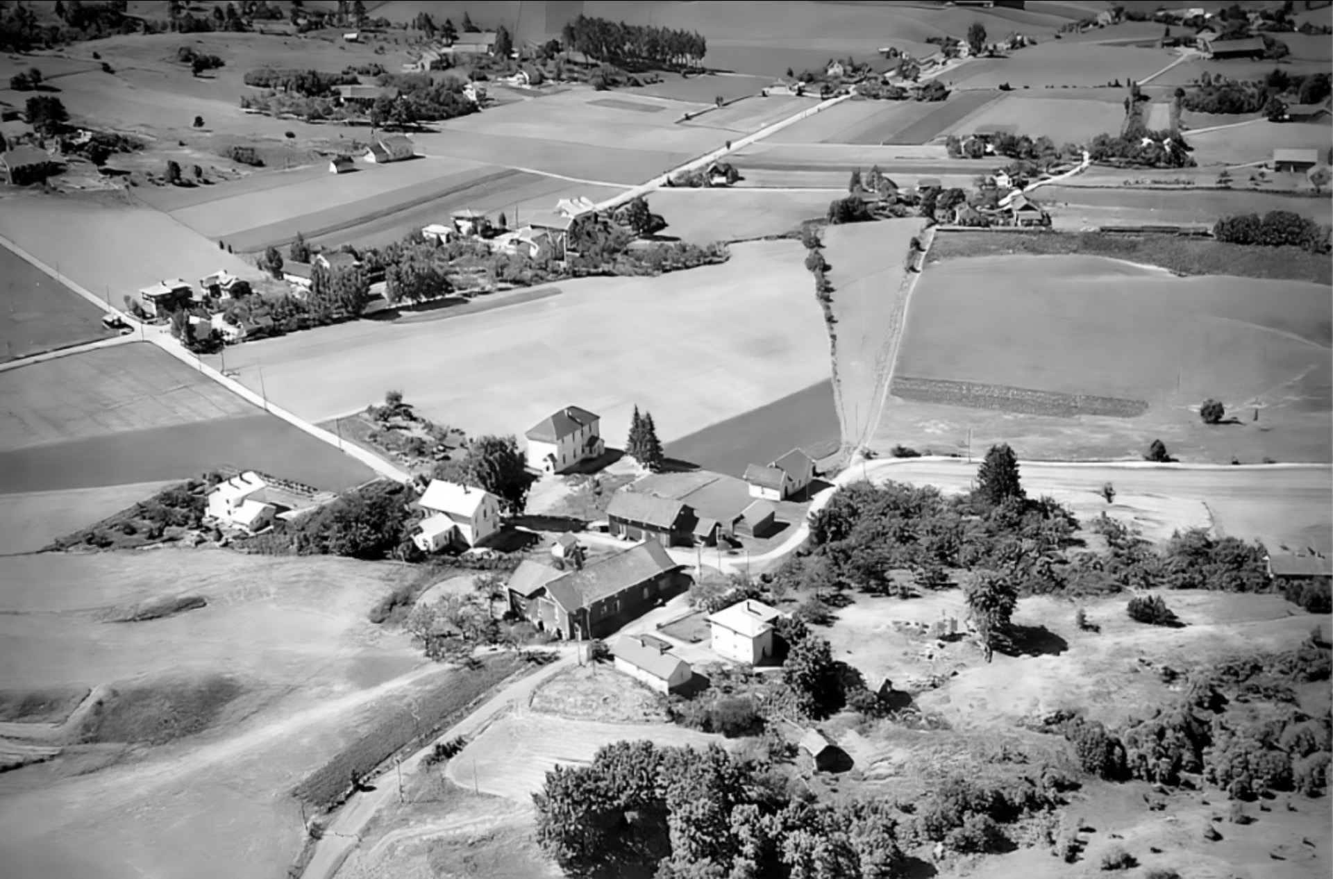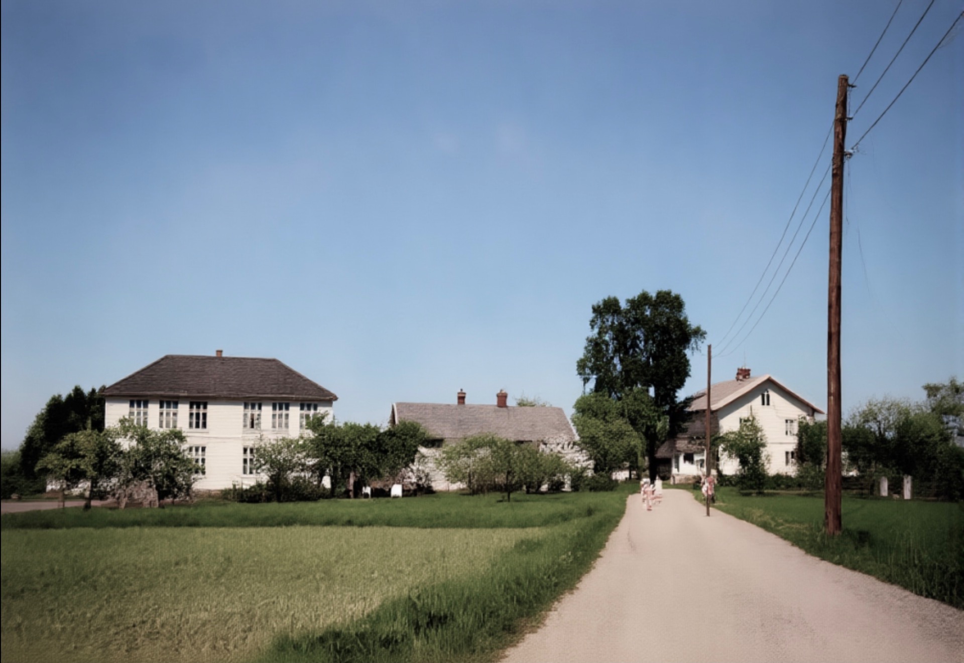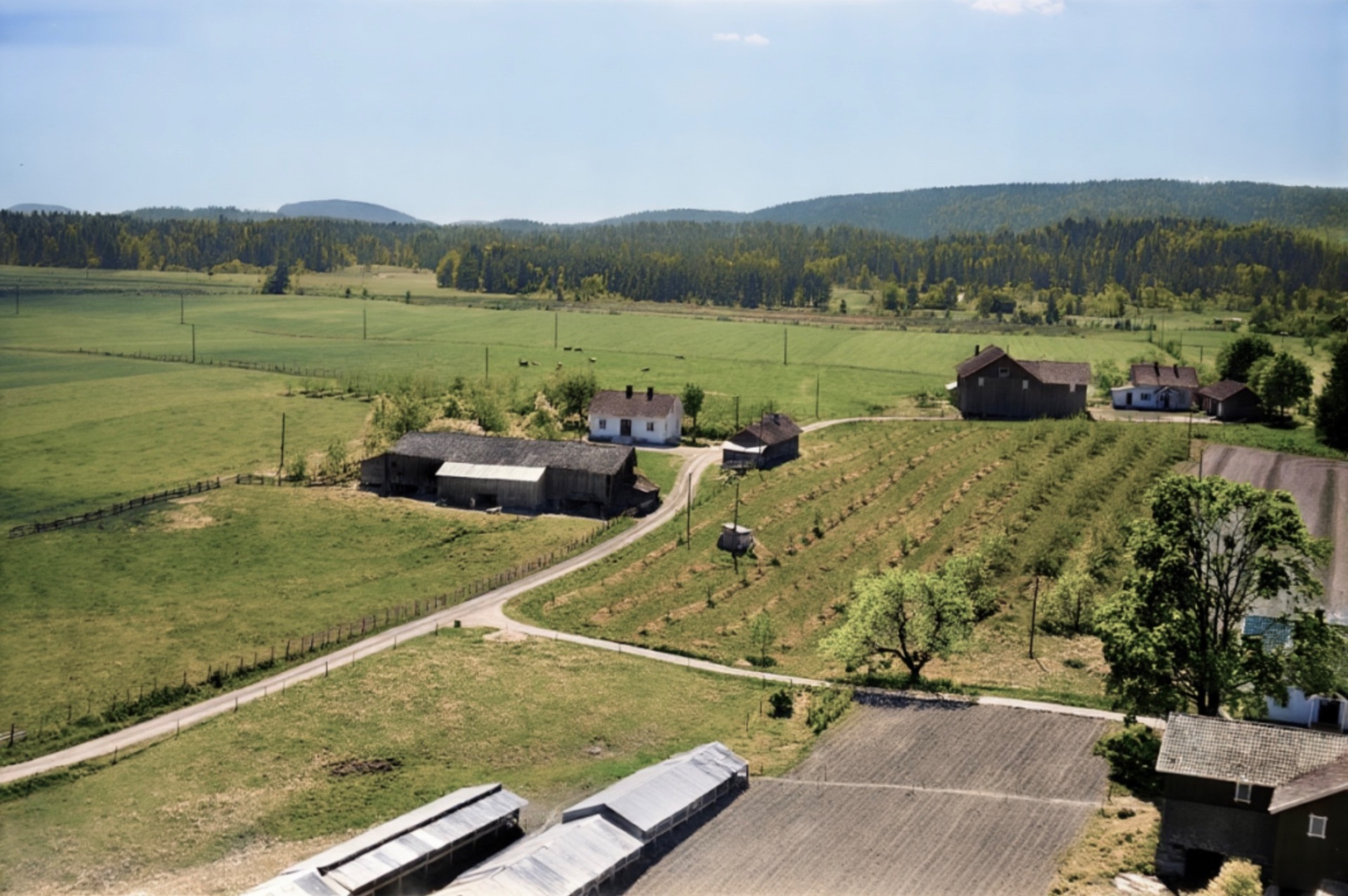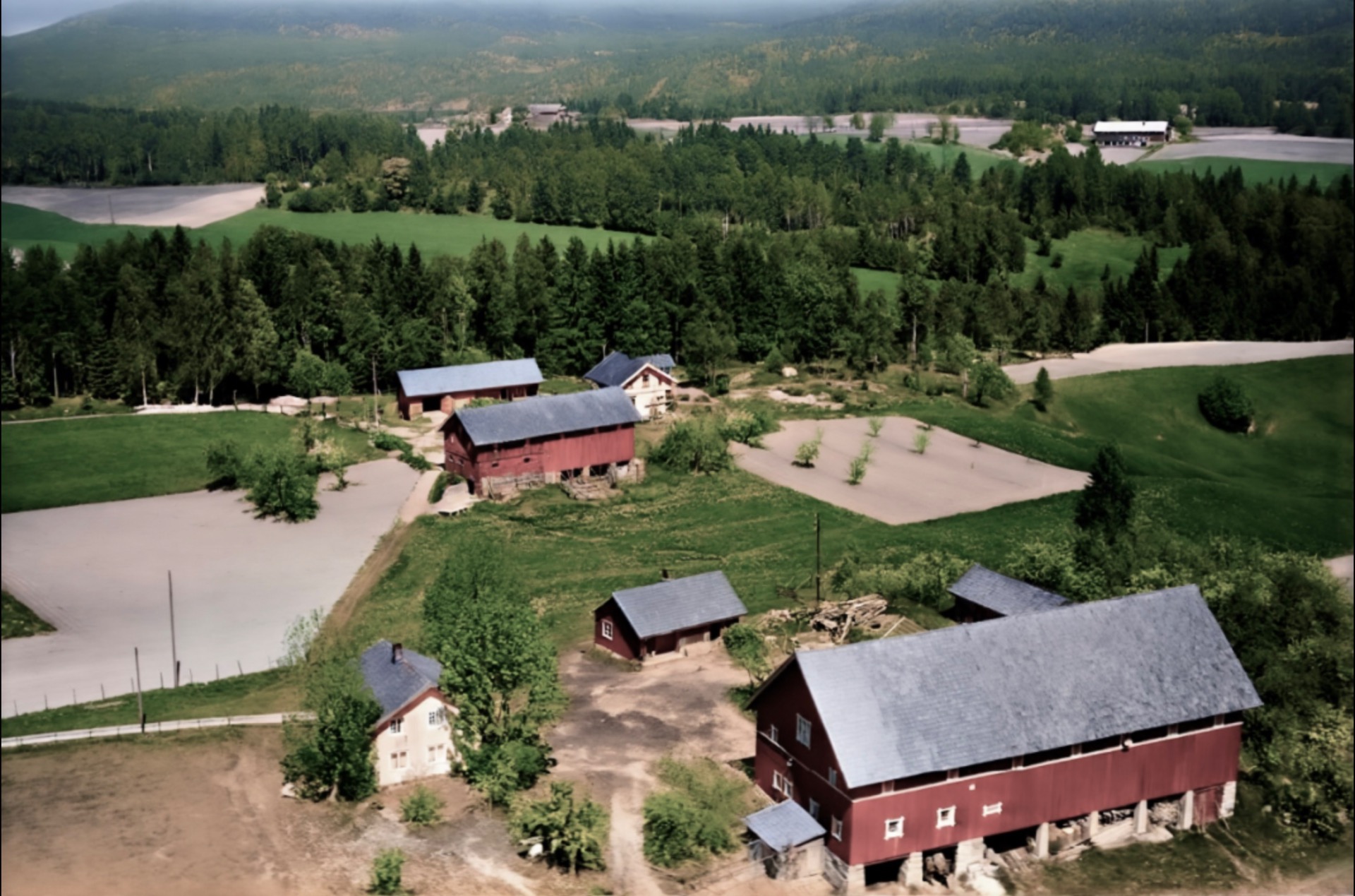 Artig med veien som slyngar seg gjennom gårdstunet på denna Håtveit-gården. Dagens vei går nå i den mørke stripa midt i jordet forbi det vesle sommarfjøset vi ser så vidt ved det store treet. Våningshuset lengst te venstre hørte te ein anna Håtveit-gård. Tømra va så oppspist av husbukk at den ikke kunne reddas. De få stokkane som kunne brukas, har i dag nytt liv heime hos meg.