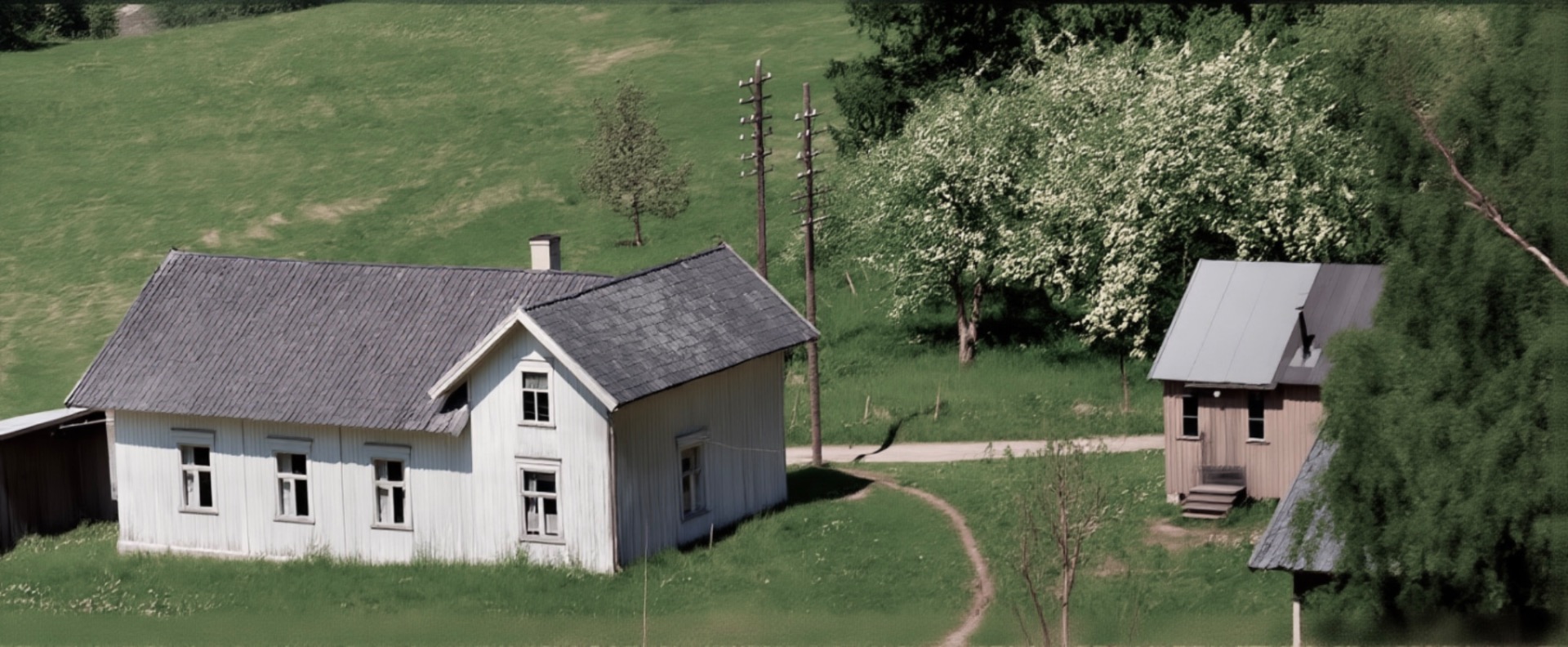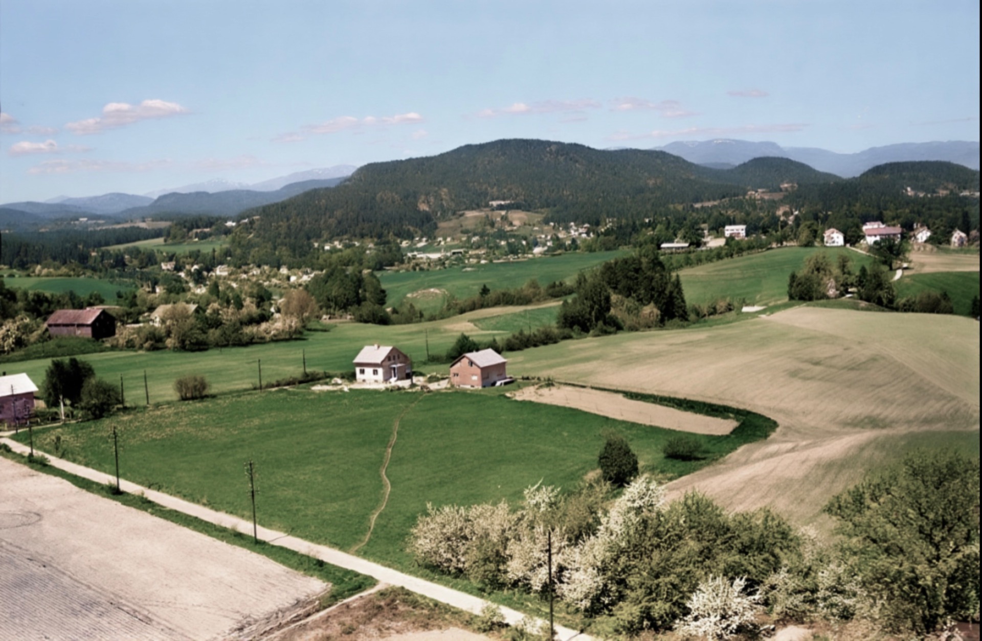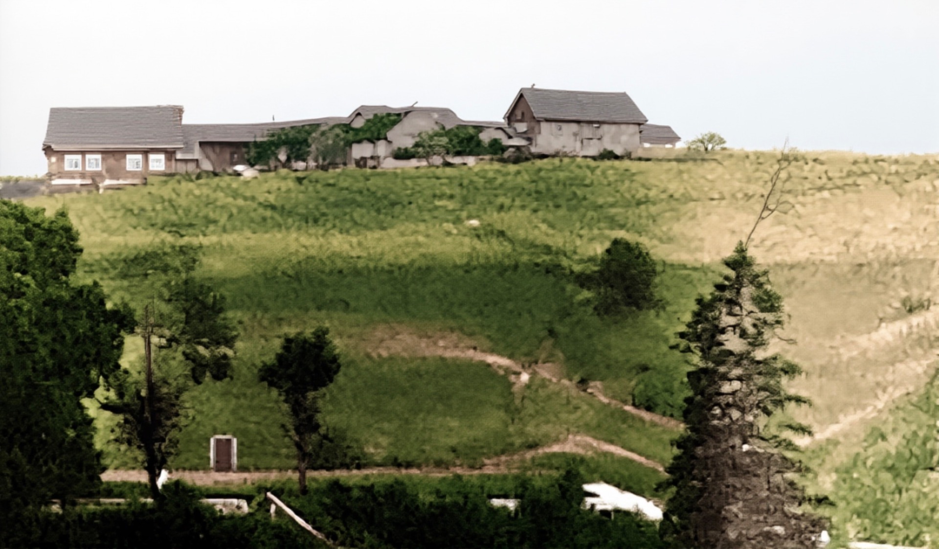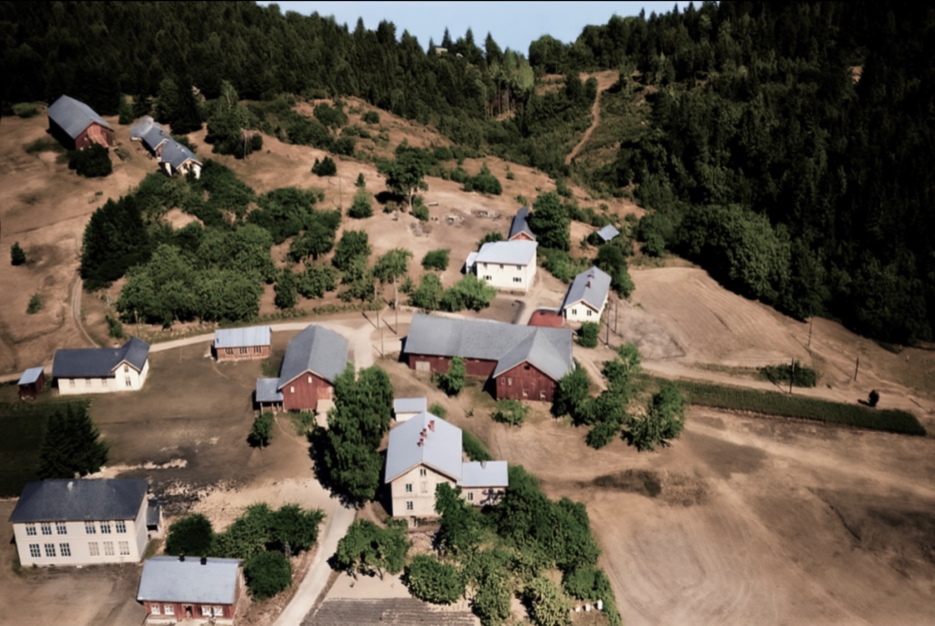 Artig med veien som slyngar seg gjennom gårdstunet på denna Håtveit-gården. Dagens vei går nå i den mørke stripa midt i jordet forbi det vesle sommarfjøset vi ser så vidt ved det store treet. Våningshuset lengst te venstre hørte te ein anna Håtveit-gård. Tømra va så oppspist av husbukk at den ikke kunne reddas. De få stokkane som kunne brukas, har i dag nytt liv heime hos meg.