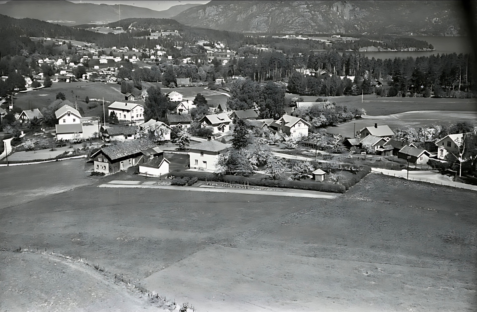 Deler av Haugjordet med Strandsplass oppe i høyre hjørne og verksplassen Hott bak.