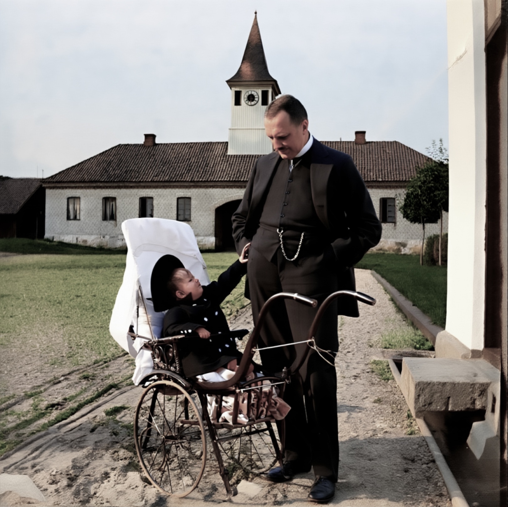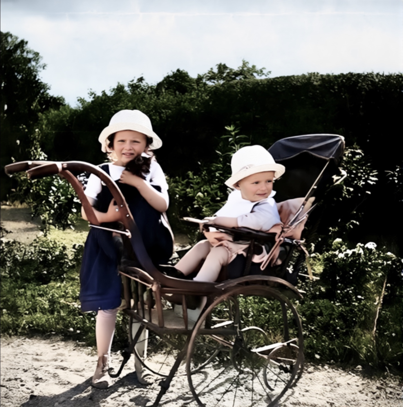 Cecilie Aall(1914-2003) og broren Hans Cato(1917-1979) i juli 1918. Barnevogna er sikkert siste mote. Katta heiter «lille Kisse».