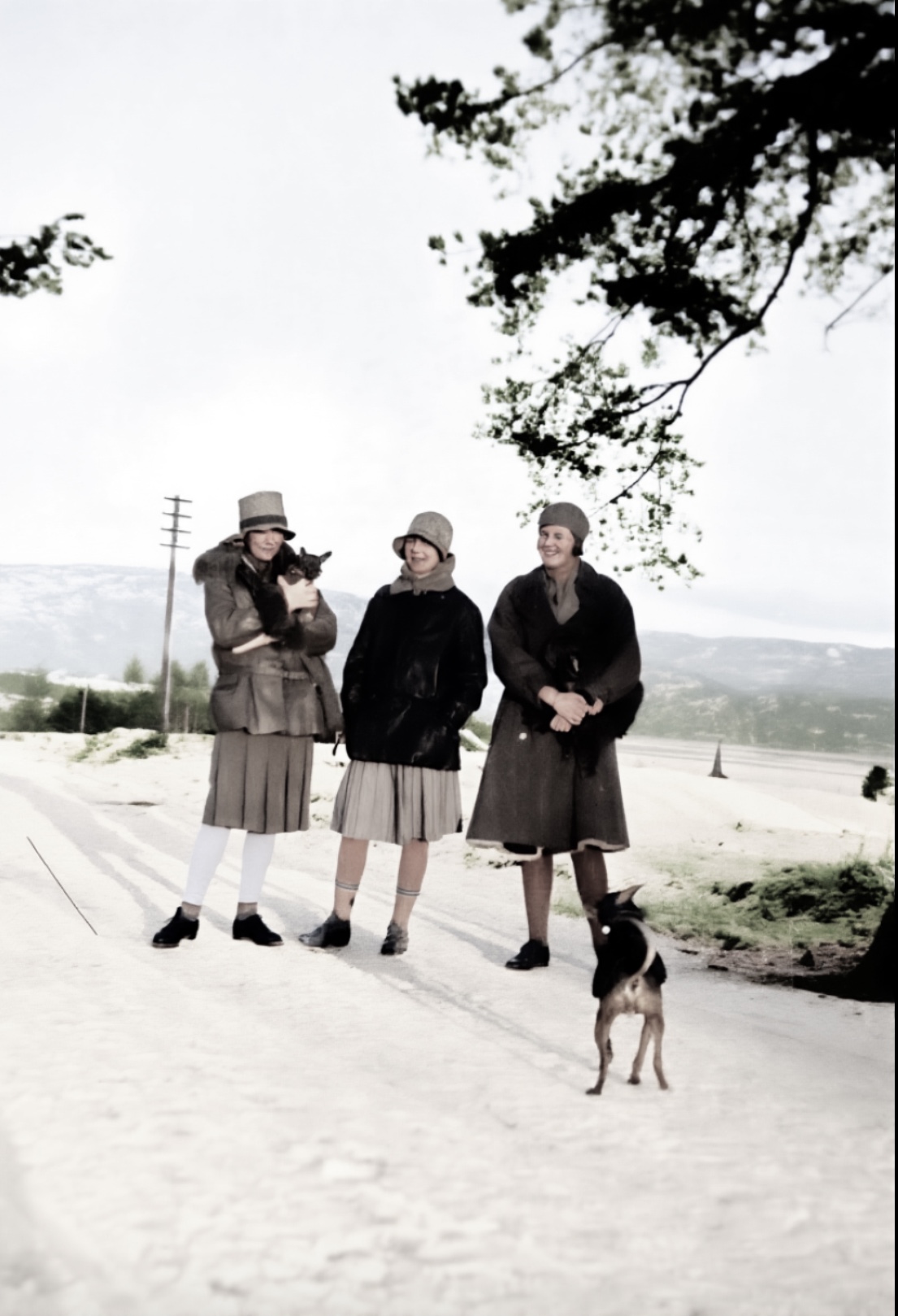 Cecilie Aall og to venninner. Vi ser kjerkespiret og taket på Strandsplass mellom jentene.