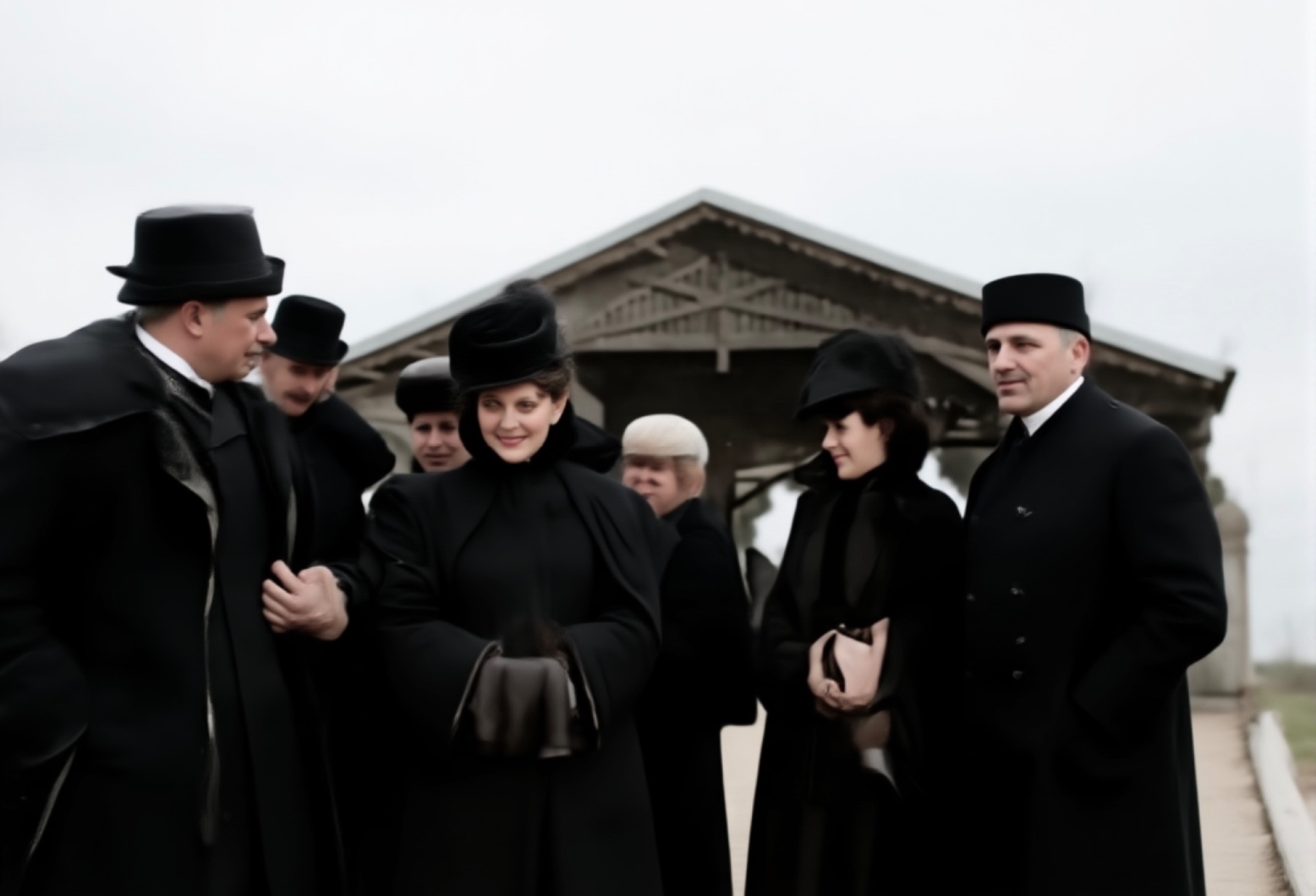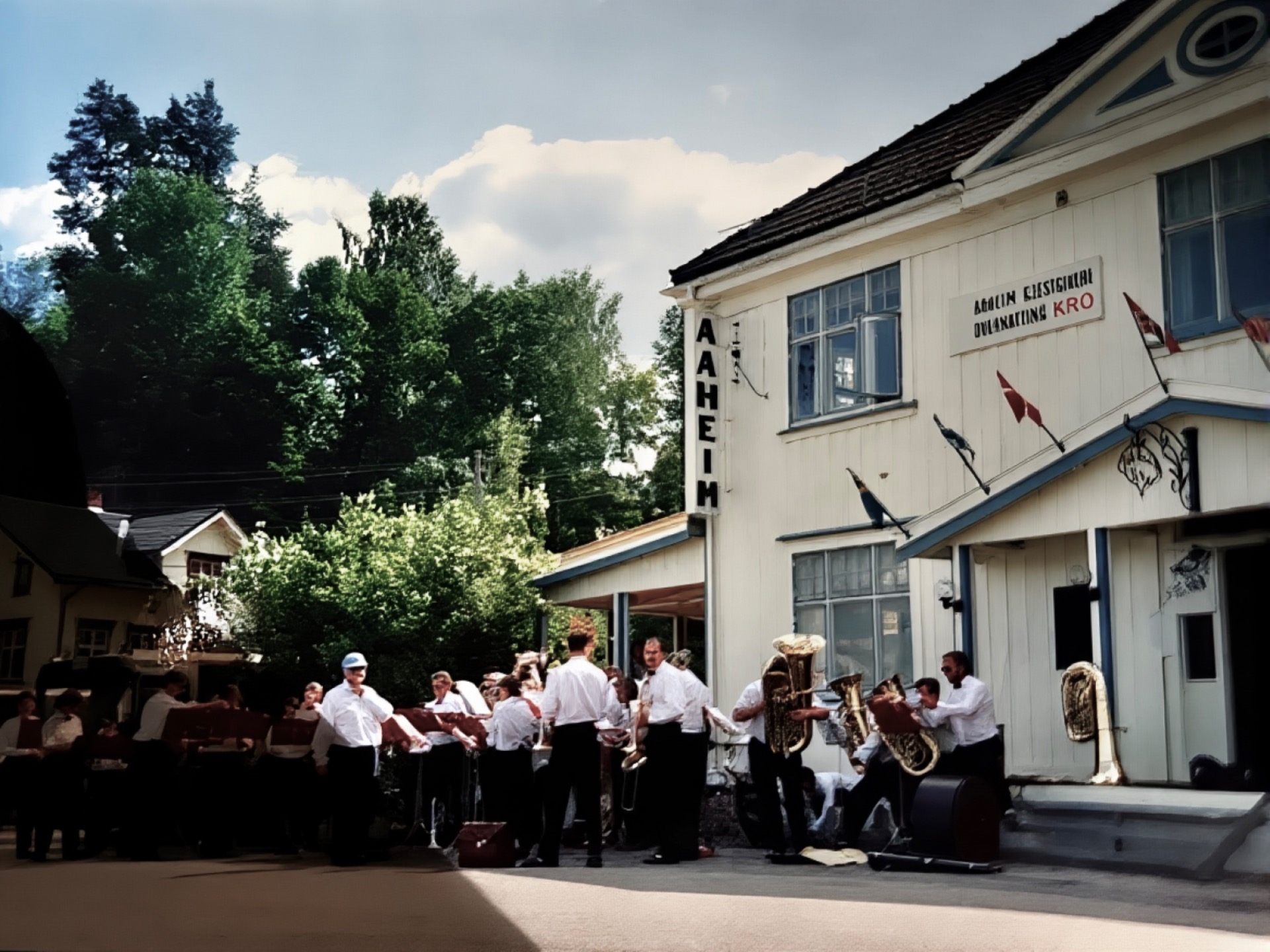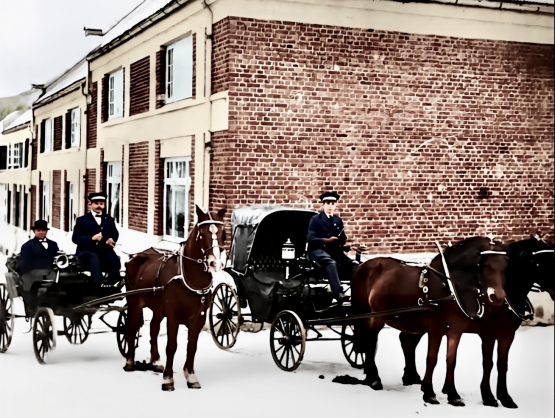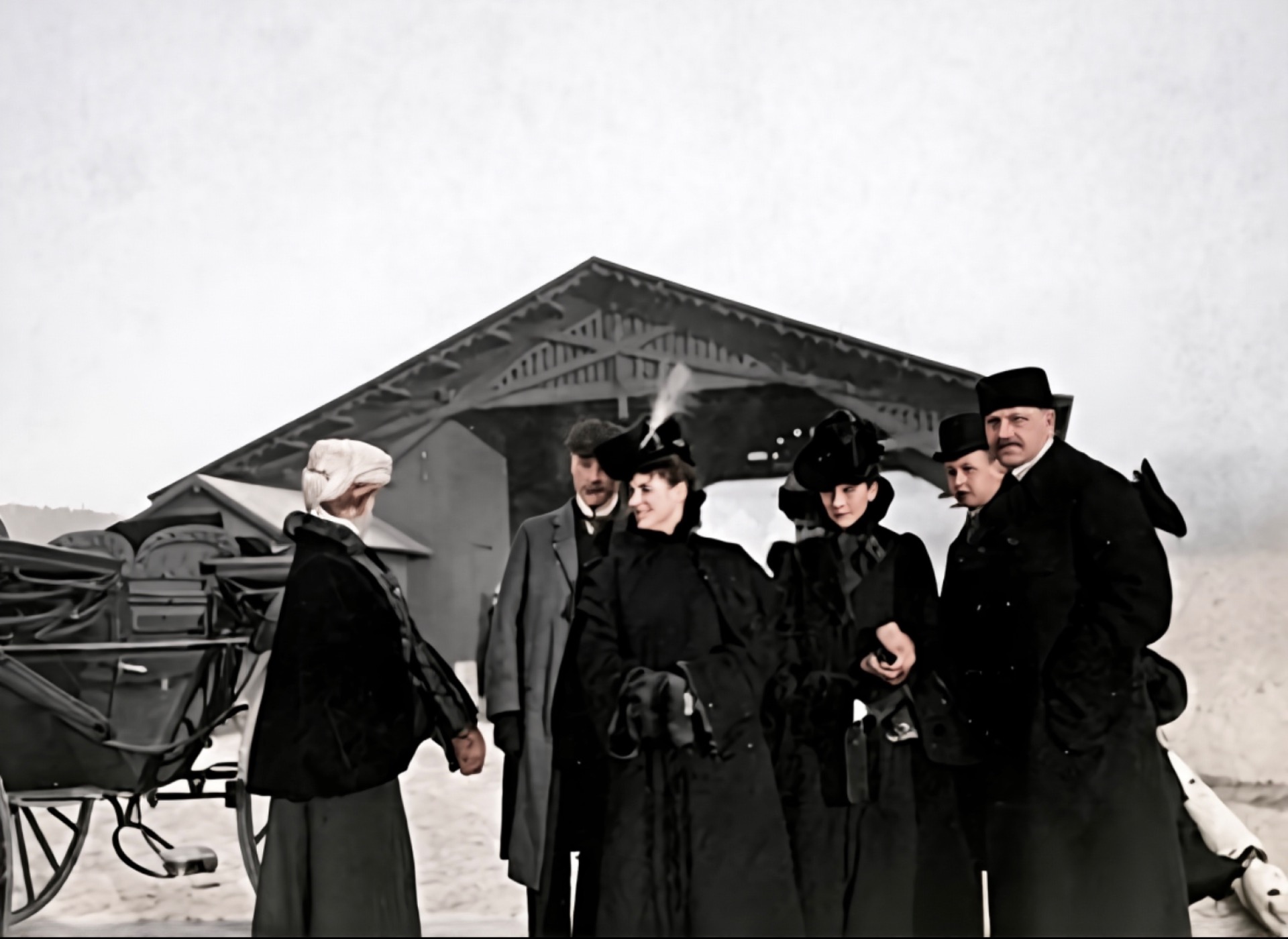 I 1905 er noen i Aall slekta nede på dampskipsbrygga og hentar gjester i sine karjolar. Kulda gjør at damene brukar sine muffer te å varme hendane sine på. Bak te venstre ser vi et lite påbygg som blei rivd etter flommen i 27.