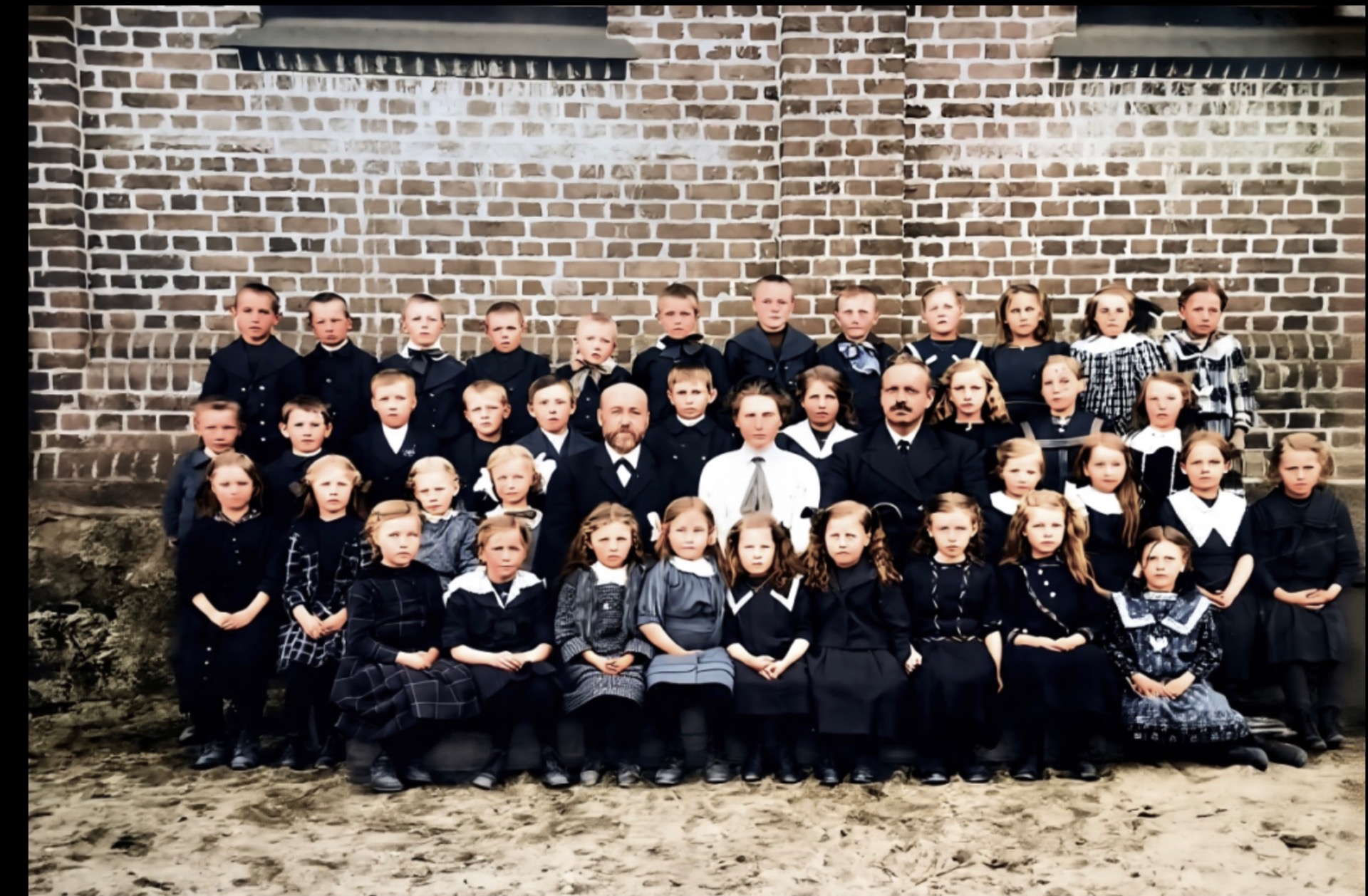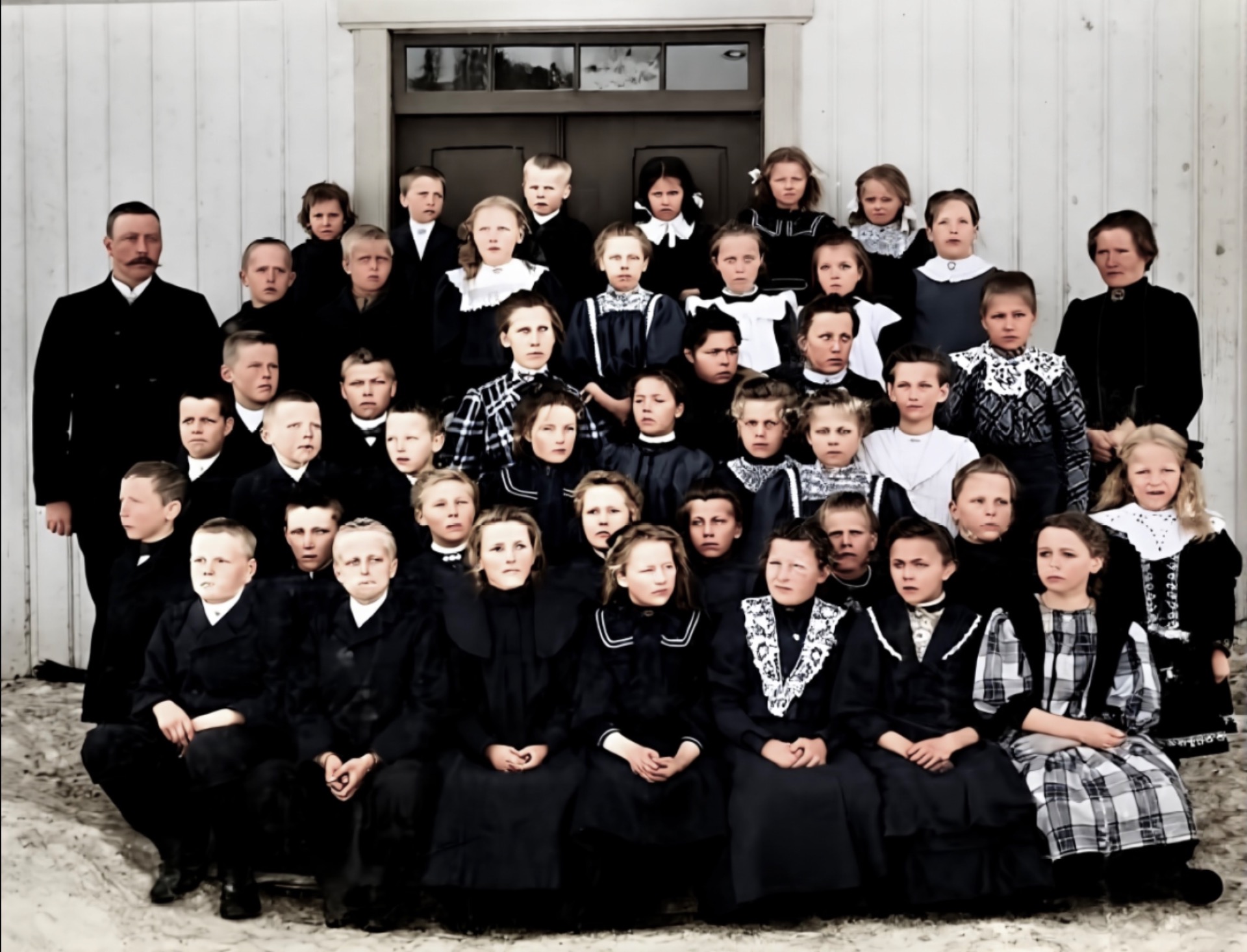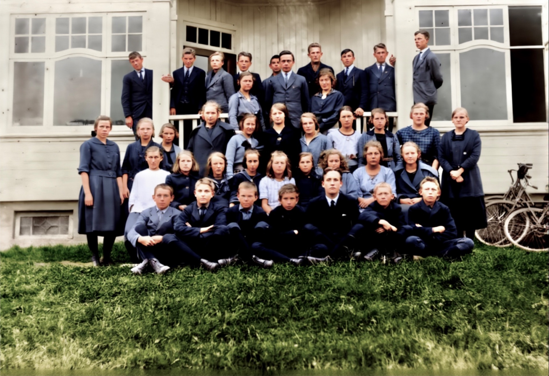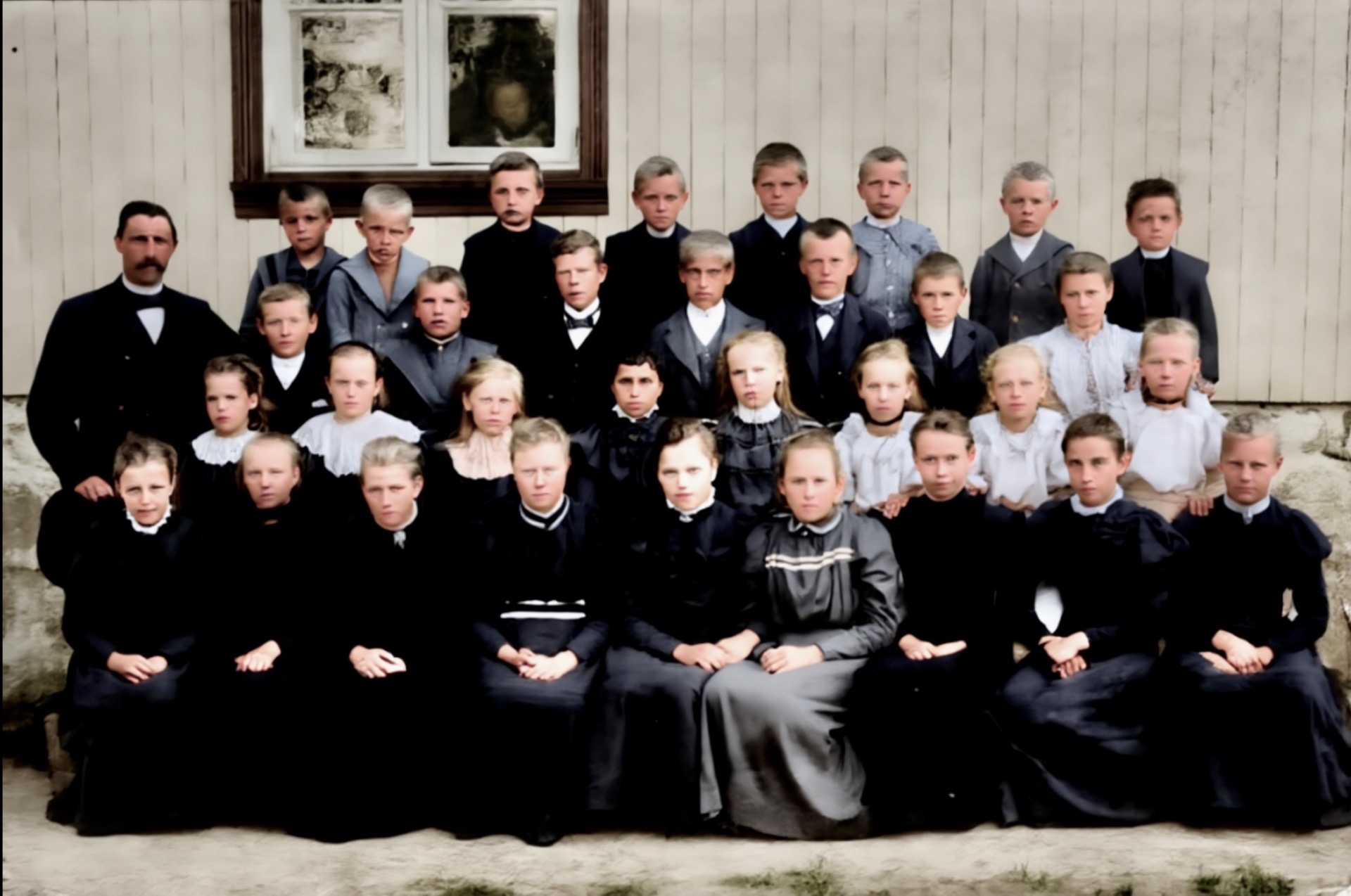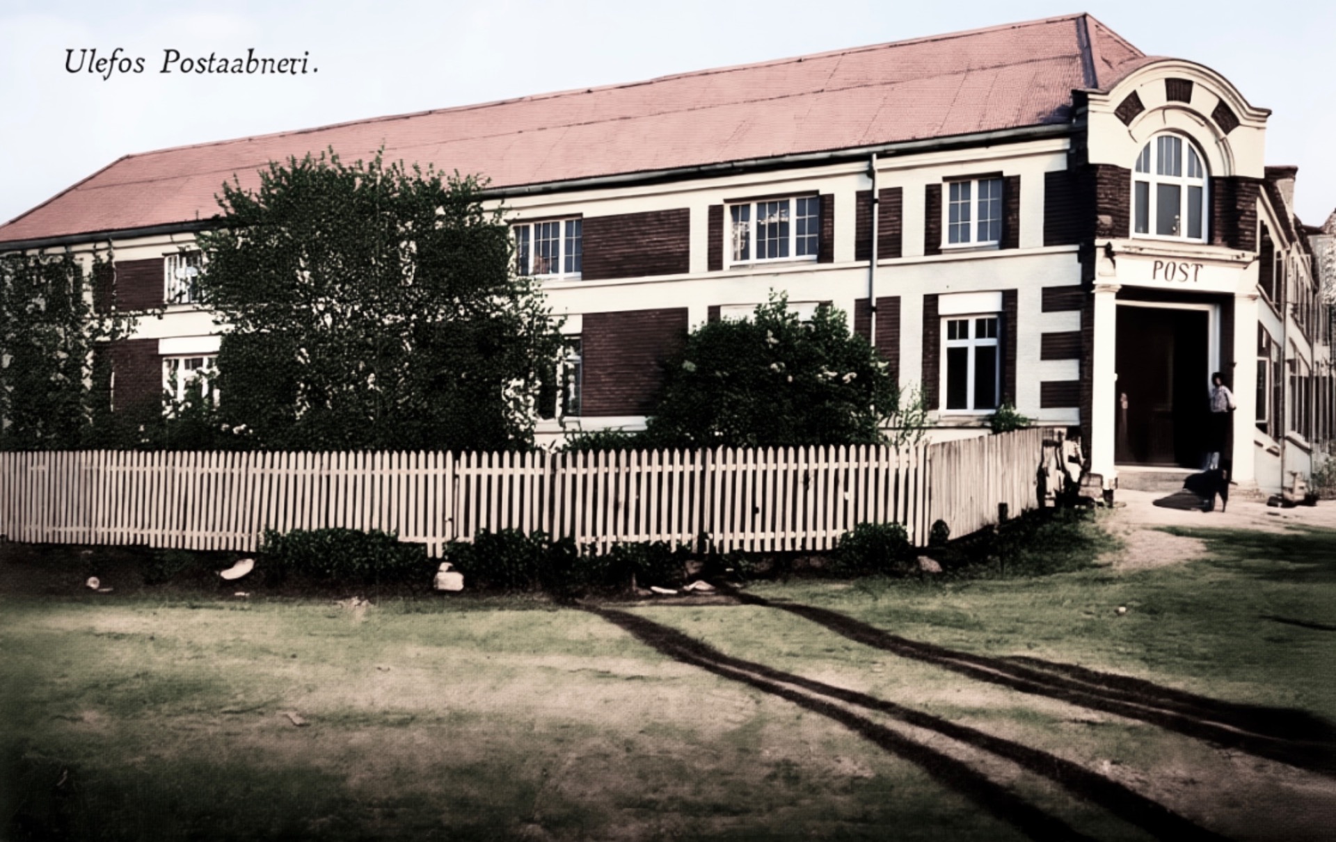 Ulefoss skole rundt 1913. Se de flotte håndblåste vindusglassa!