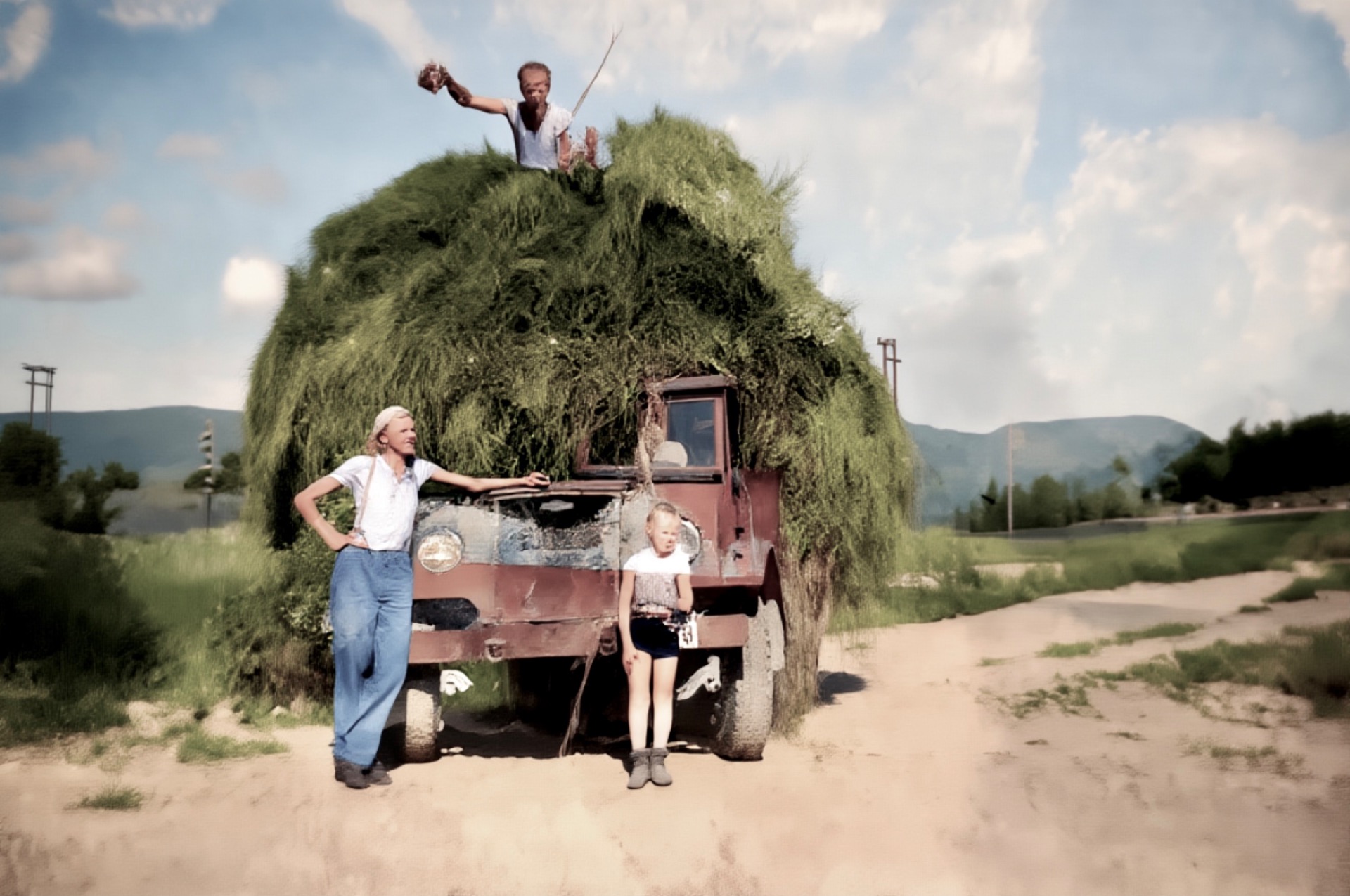 Denna vesle lastebilen har 14 passasjerar og de er på vei te Helgja. Året er 1925 og lastebilen har skiltnummeret H 76.