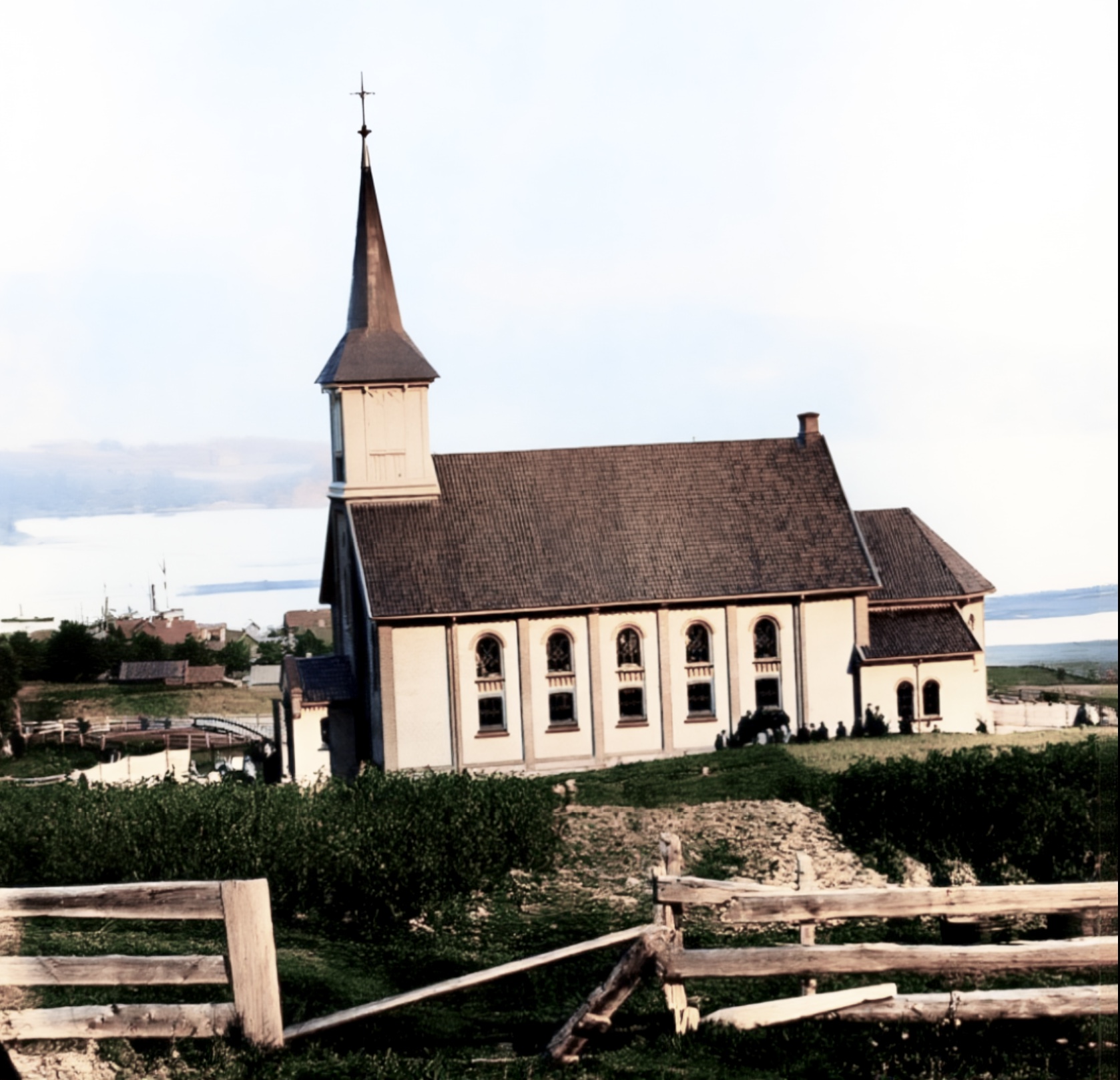 Vi er et par kilometer ovafor Sannes og ser over nesoddenlandet med kjerka.