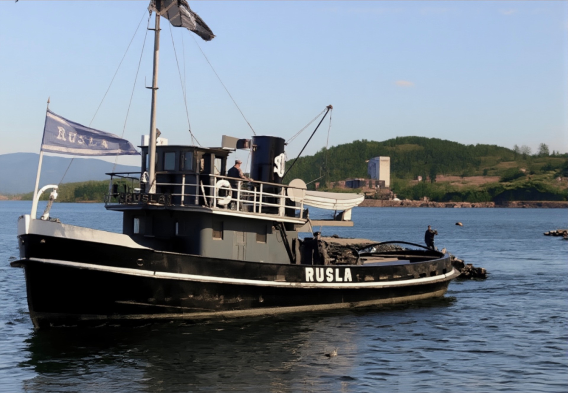 Her ser vi logoen te Aall på fløtarbåten «Stærk».