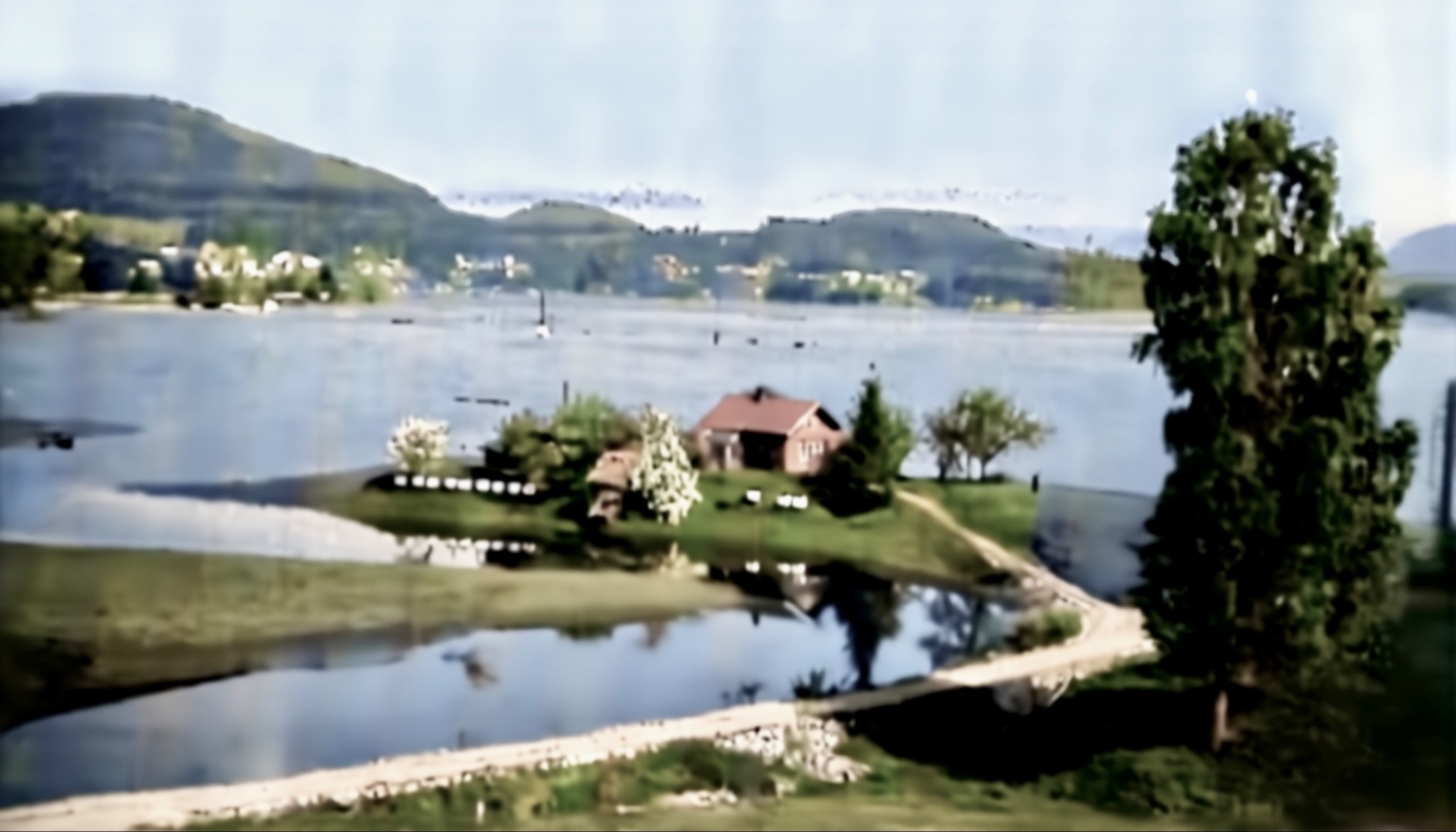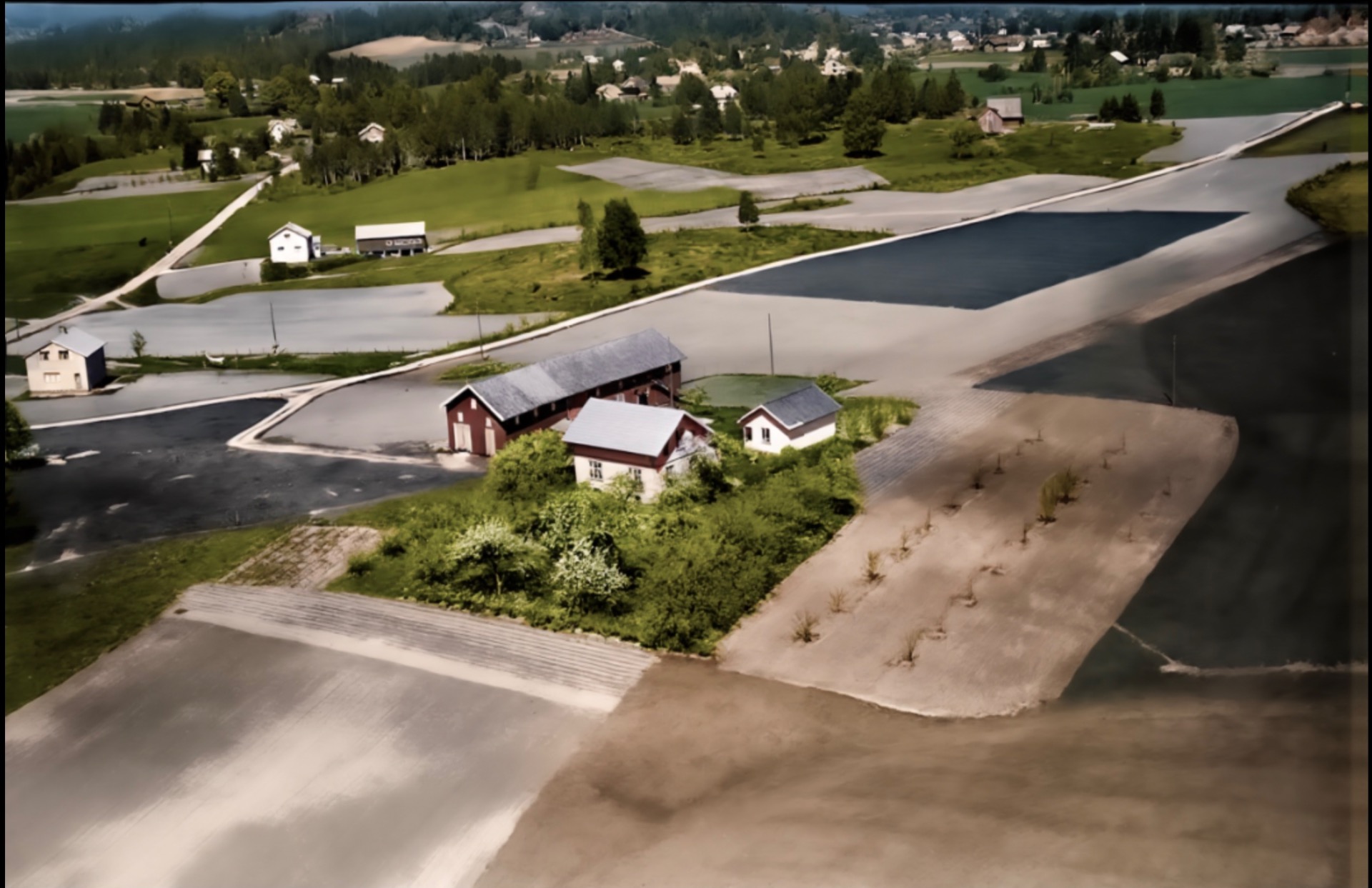 Vi ser tydelig «huset på muren» og de to neste. Det innerste i forrige bildet må ligge bak det store røde tørkehuset for materialer. Nærmast i venstre hjørne, ser vi trulig ein Hølen plass som har blitt neddemt da kanalen kom. Bak «huset på muren» ligger også et par gamle bruk. På Strømodden ser vi ein plass litt inne og vi veit fra andre bilder at det lå ein plass lengst ute.