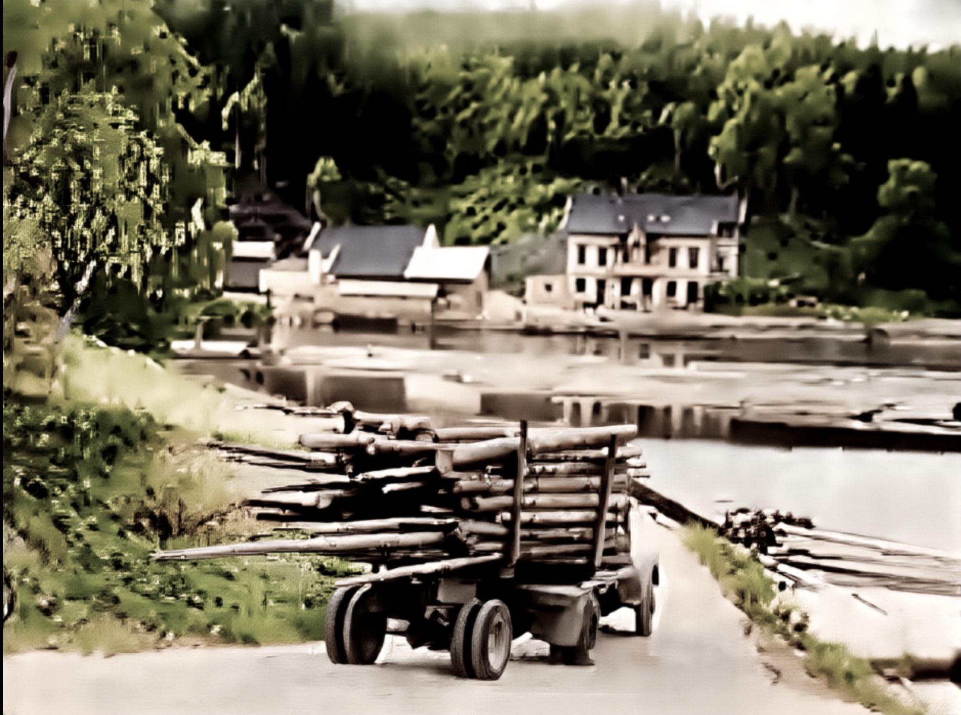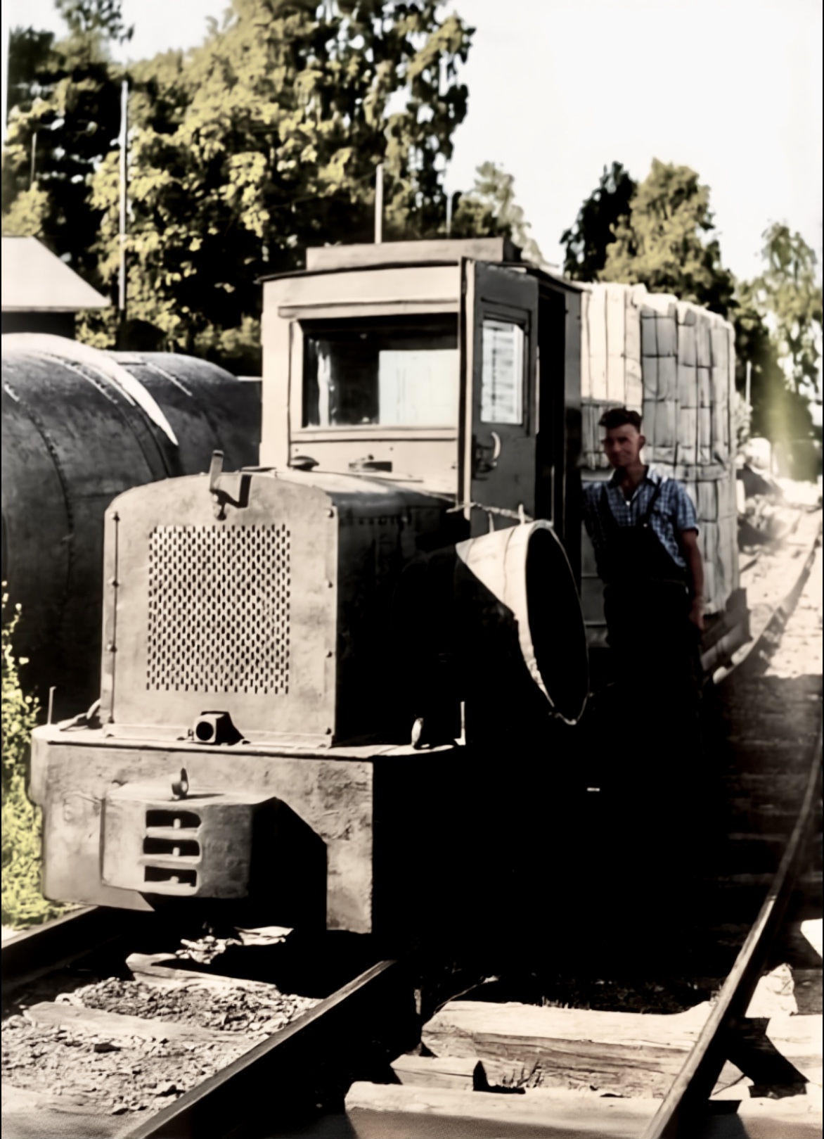 Tremasseballar har blitt lasta opp på ei mini jernbanevogn som loket har dratt fram. Nå venar de på båten som ska ta med ballane te Union på Skotfoss. Vi skimtar trelastlageret te Cappelen på andre sida.