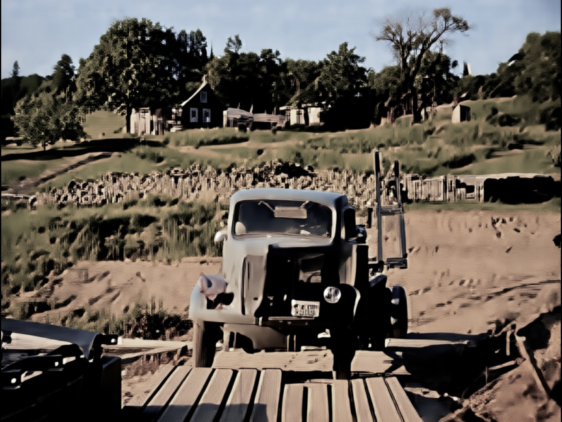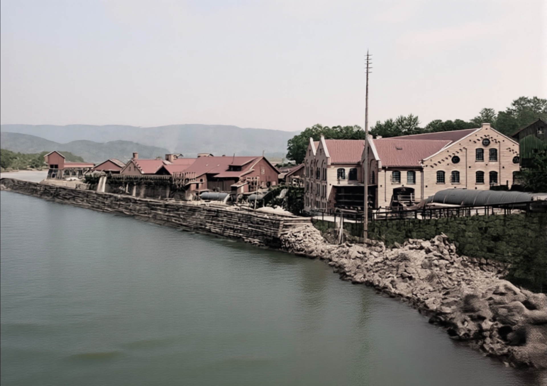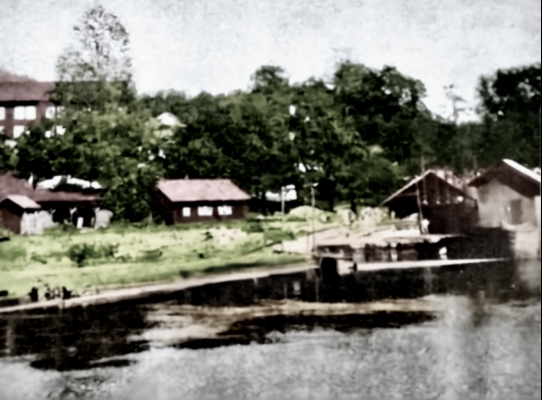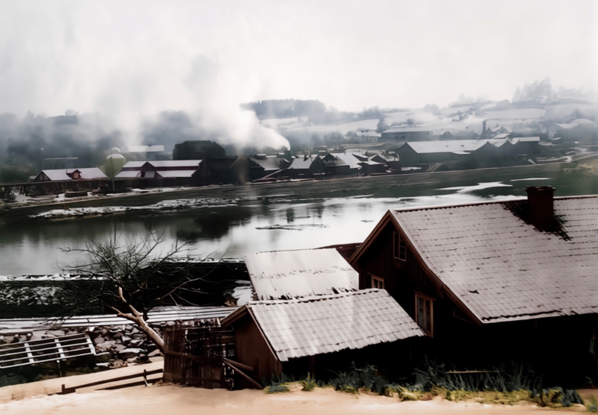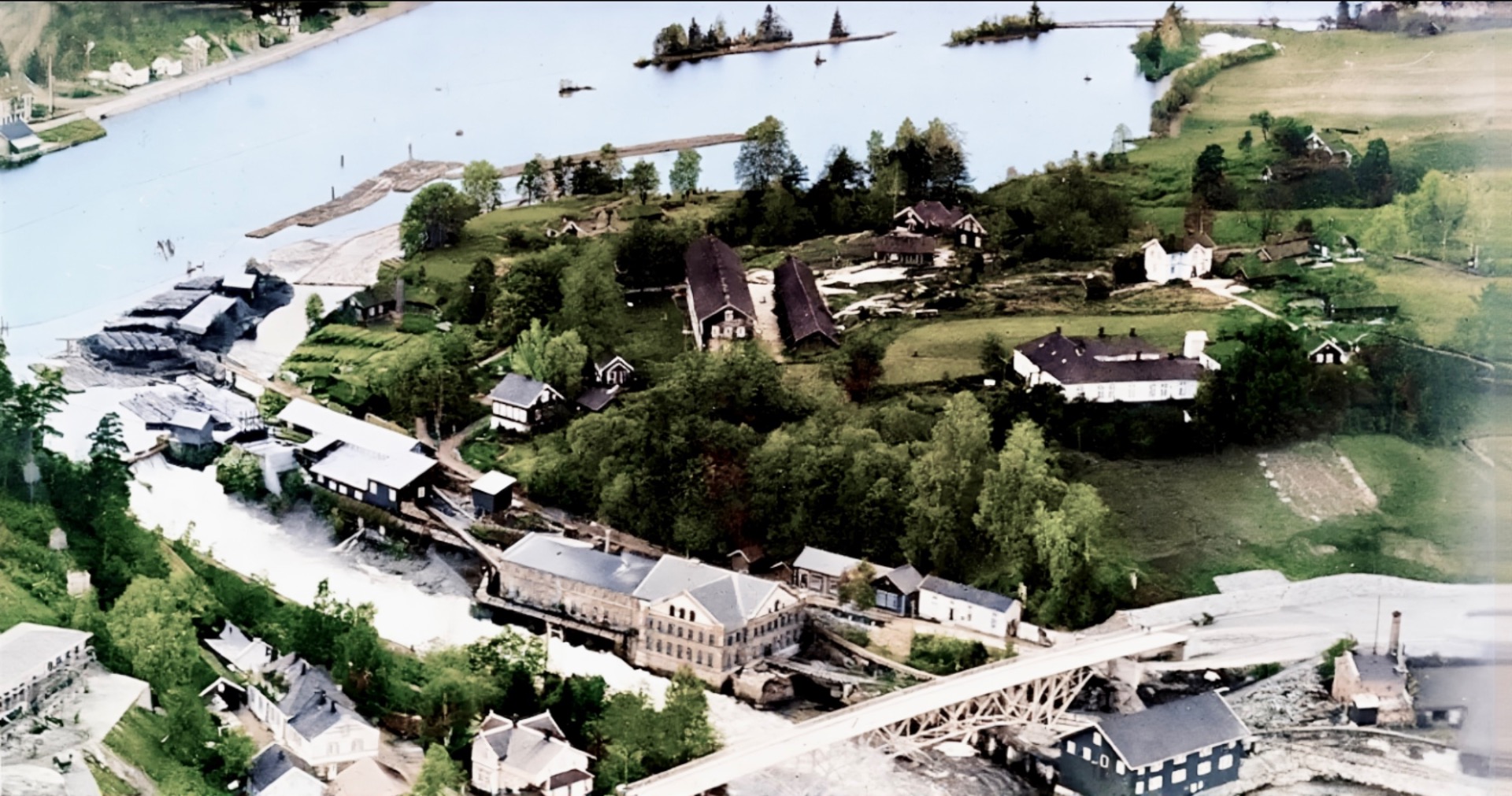 Nærmast ser vi jernverkskontoret. Rett over elva ser vi ein av minst to plassar på Strømodden i denna tida med uthus og gjerde.