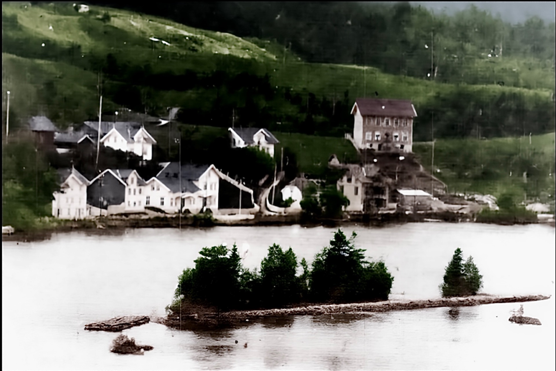 De tre nærmaste husklyngene er Ringsevja-plassar. Brakkene i Ekornrød er på vei opp, Kampen står litt naken, Helgas er bygd med skolen på nersida. Den ska væra bygd rundt 1922.