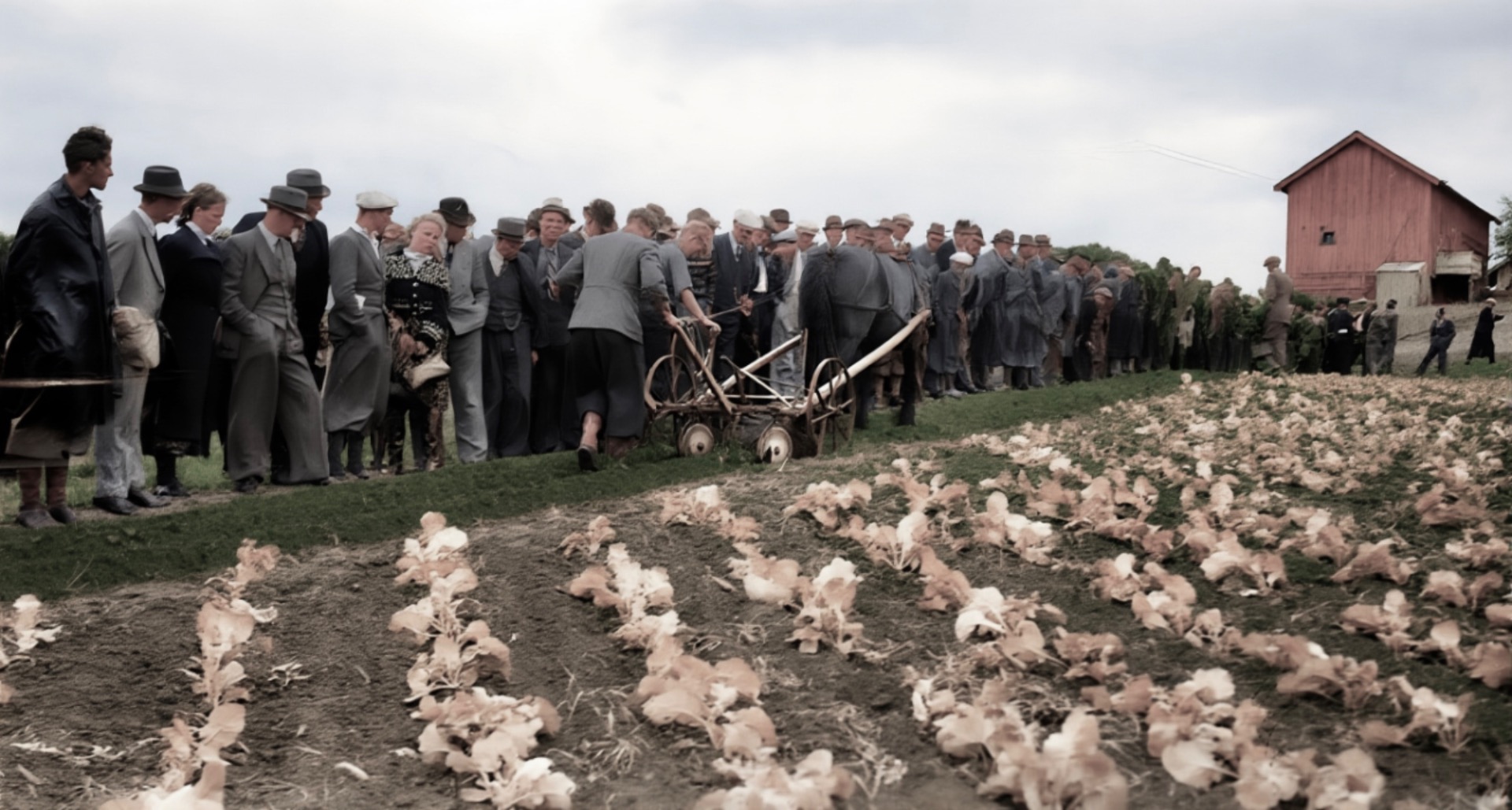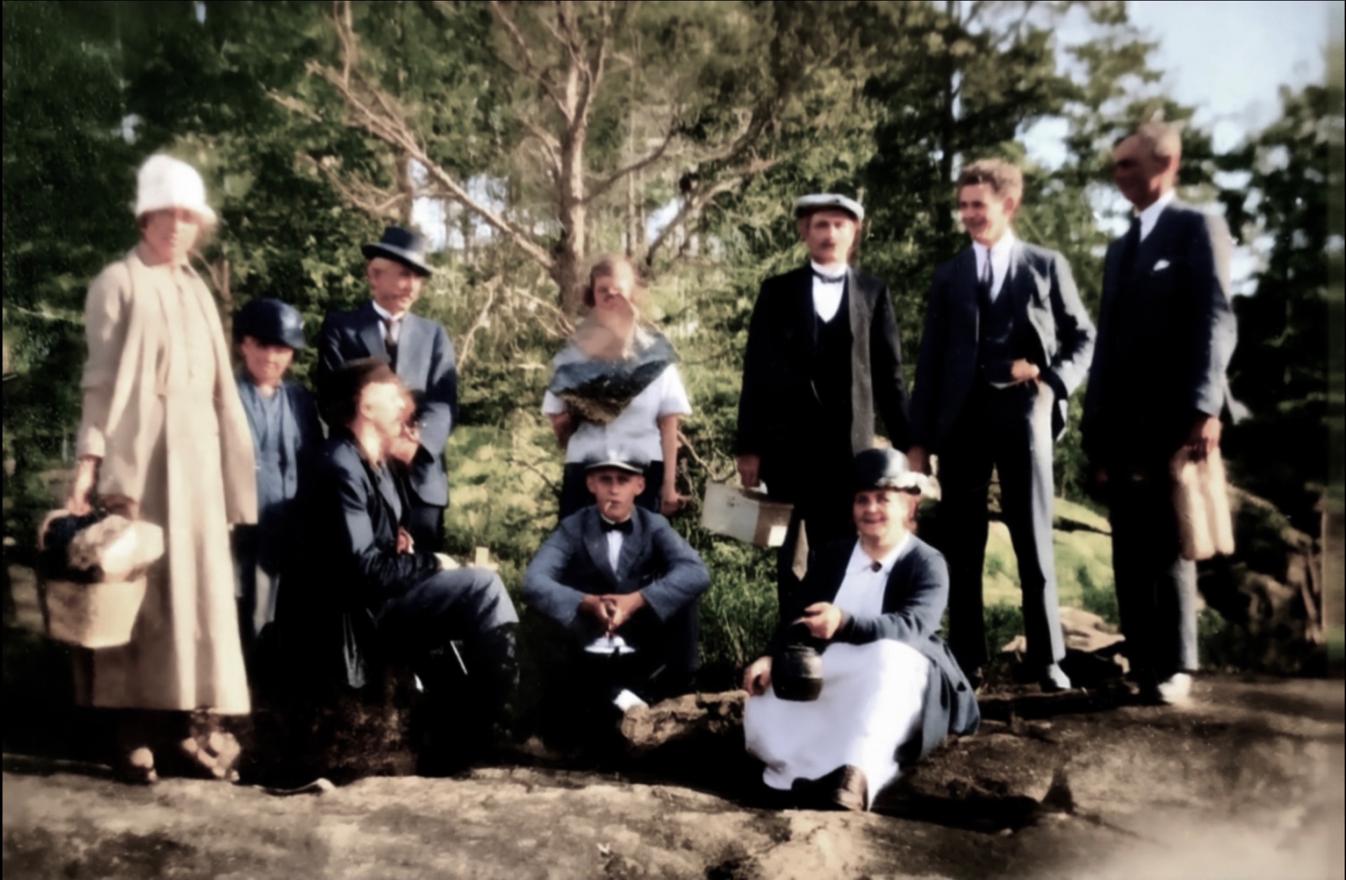 Vestre Heisholt mandag 25. juni 1928. Framme te høyre ser vi Astrid Margrete Isaksen (1894-1984) som budde på Knardalsstrand. Ho blei gift med Lars Andreas Terjesen og de budde i Porsgrunn. Her va Astrid aktiv i Misjonssambandets Kvinneforening i ei årrekke. I bildet holder ho dattera Tordis(1925-2011). I 1960 blir Astrid enke og ho får ein gledelig overraskelse: