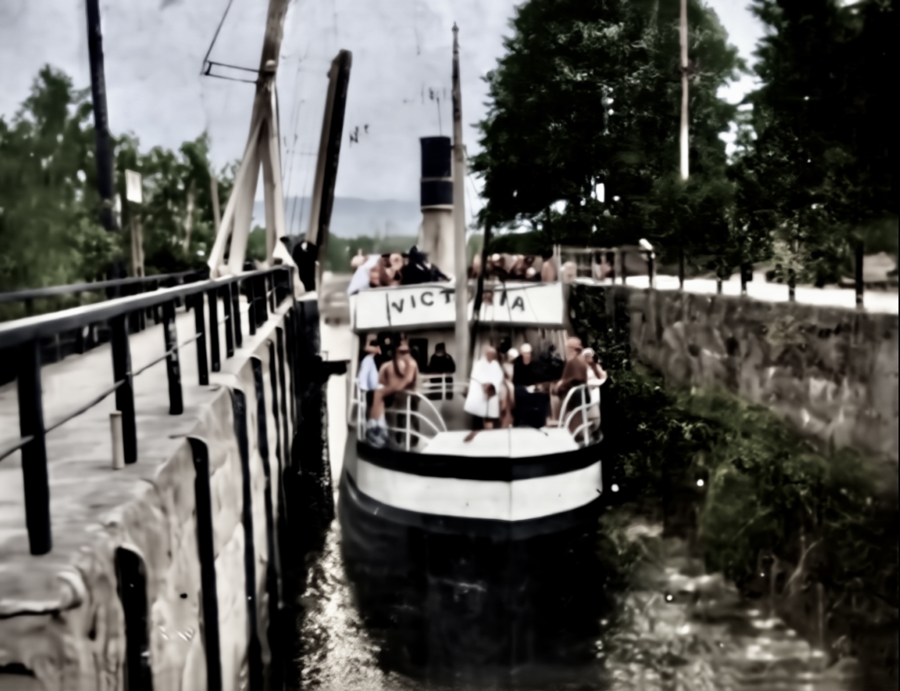 Løftebrua er oppe og Telemarken seiler inn i siste kammeret på Ulefoss.