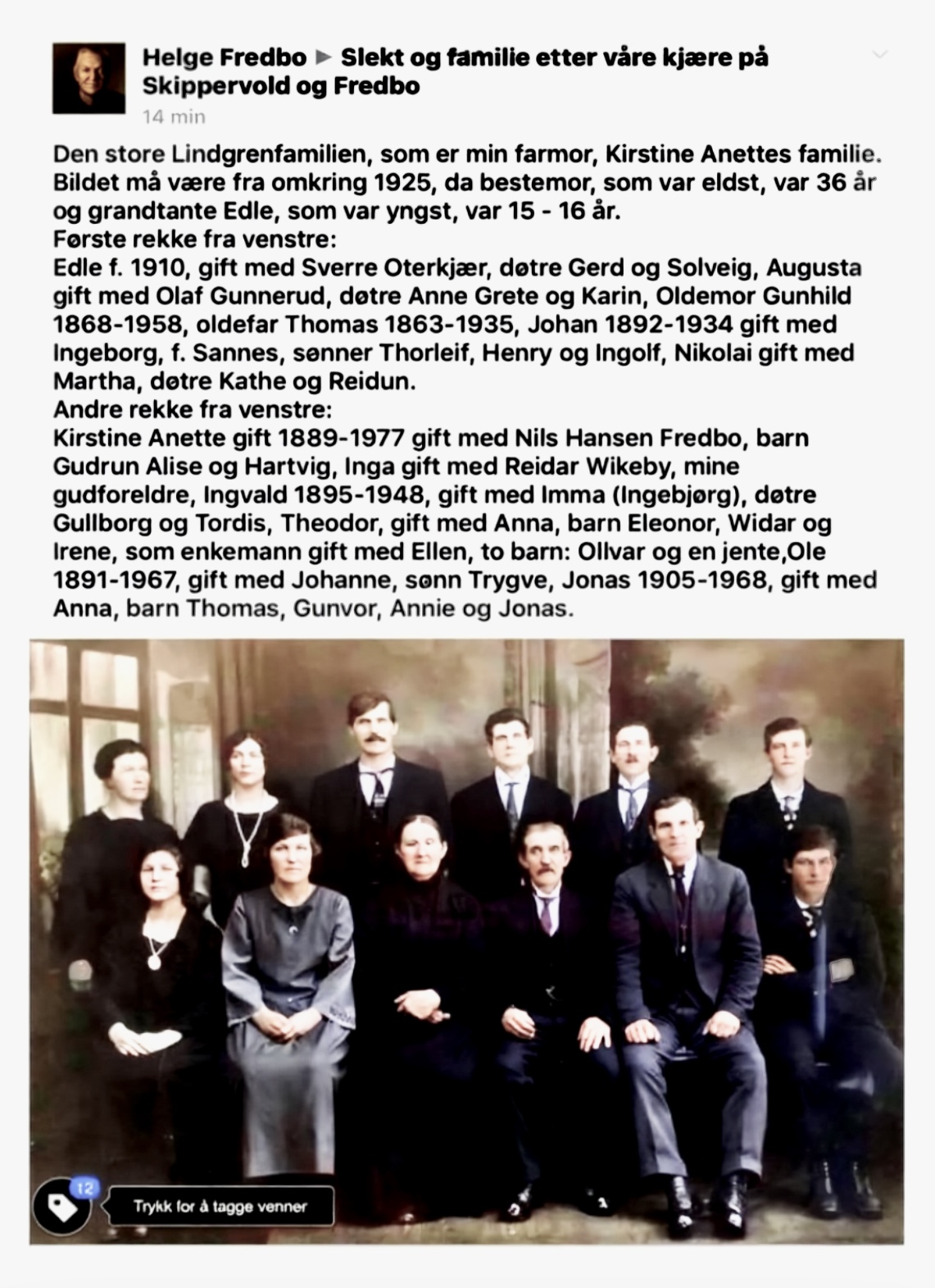 «Helgas» har navn etter Helga Nilsen(1869-1944) og ho va gift med verksmannen Gunder Olsen(1864-1938). Det som følger er altså deres slekt: