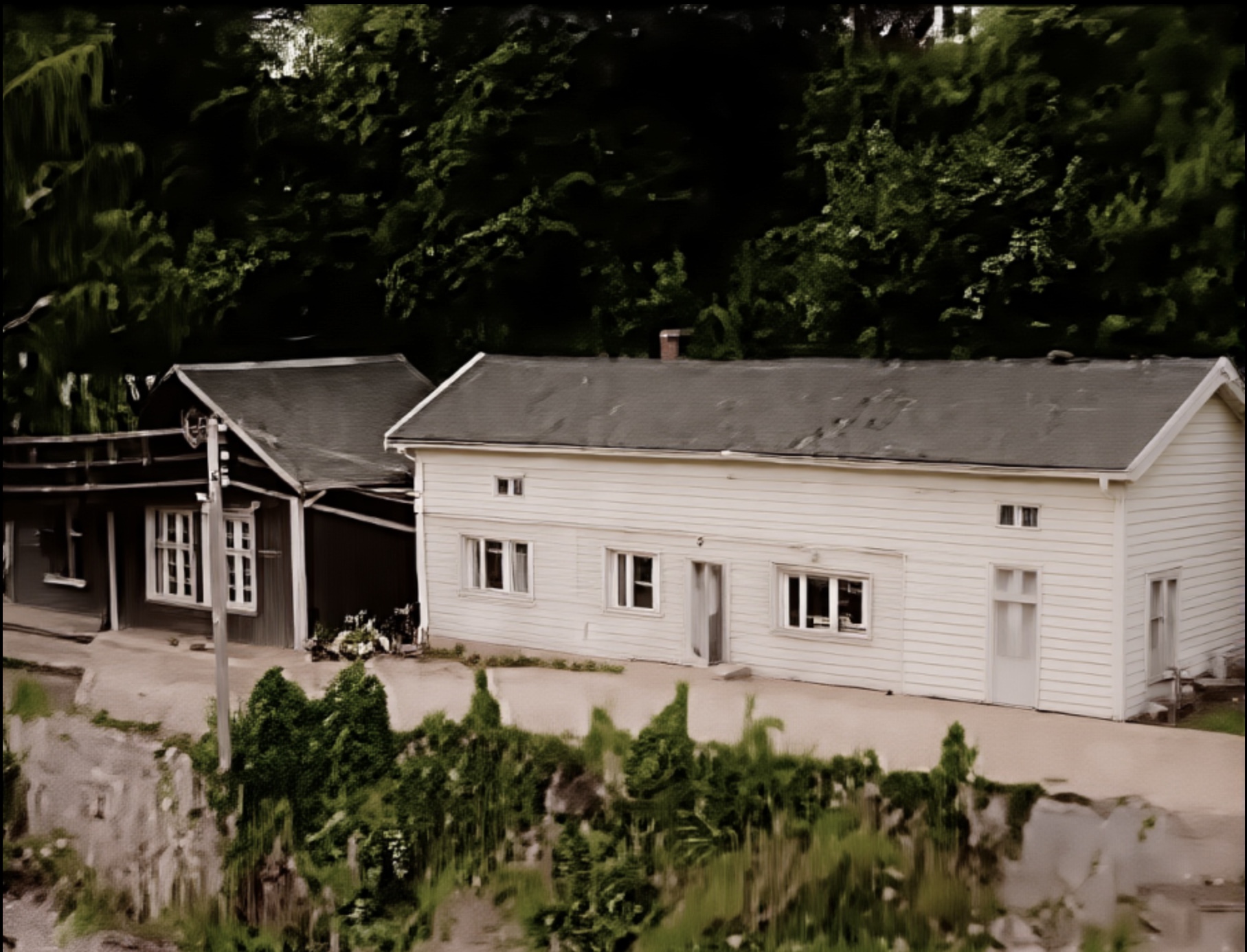 (Bilde 1)Vi er i den gamle hovedgata nede på Sagene. Detta er veien som i dag går bort te Ulefos Brug, ikke dagens vei forbi Linddalen. Vi har 4 hus i bildet og vi biter oss merke i det med den høye muren: