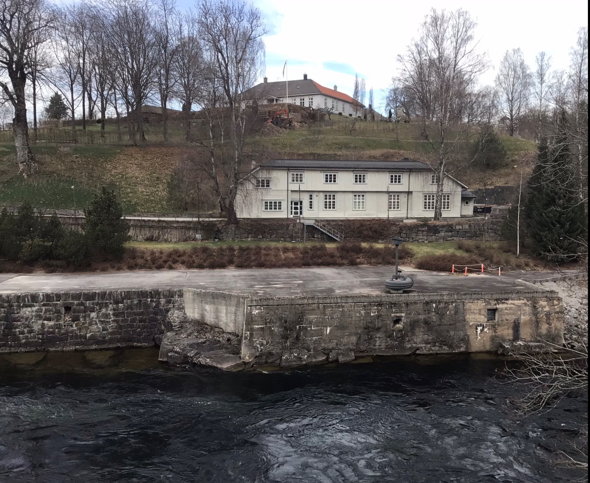 Vi ser ei flaggstang nede ved løftebrua og veien som går oppe på steinmuren.