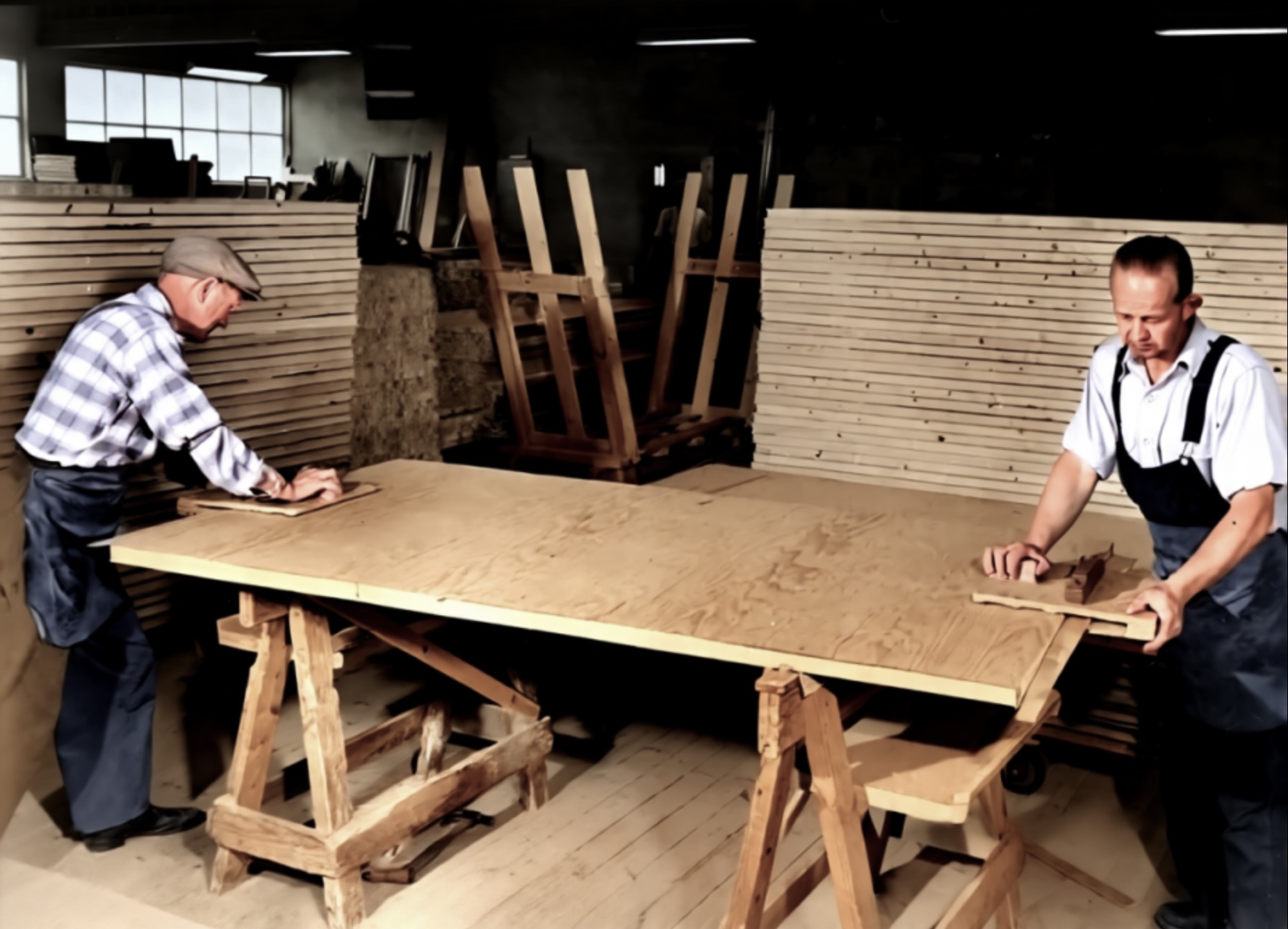 Willy Fritheim(1930-1987) pakkar dører. Willy slutta hos AUB etterhvert og er ført møbelsnekker da han giftar seg i 50 åra. Faren Arnt, hadde drivi ølmonopolet på Ulefoss og det tok Willy over. Han hadde også interesser i Ova’s Efterfølger i Lunde.