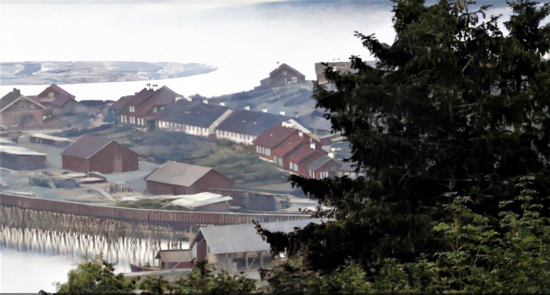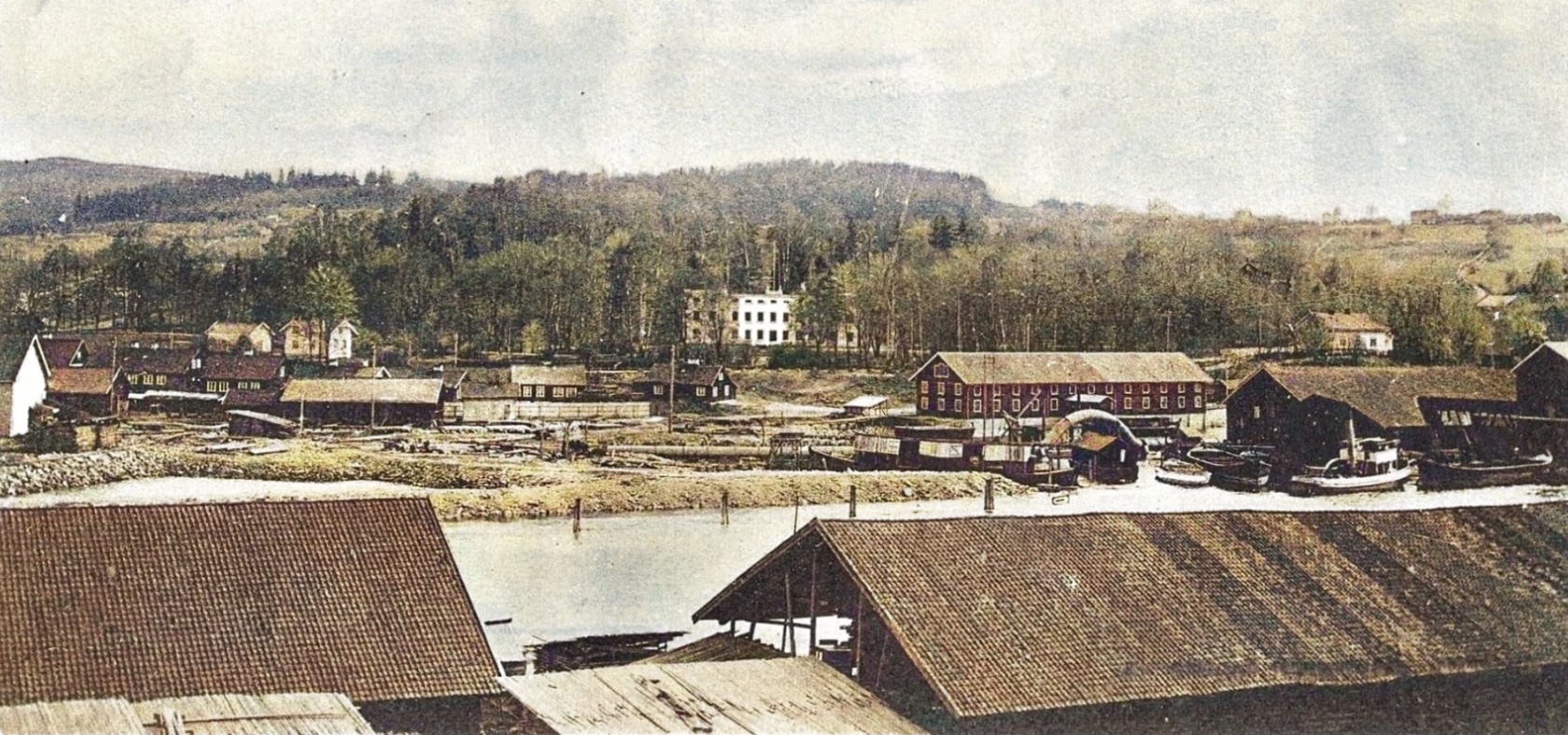 Øvre Verket. Det nærmaste bygget ligger der spiseriet ligger i dag. Så har vi veldig mange små bygningar ned mot vannet.