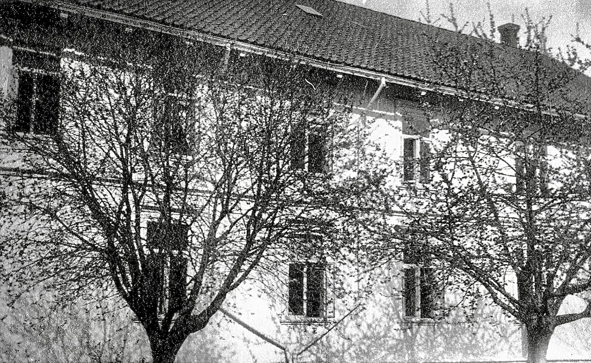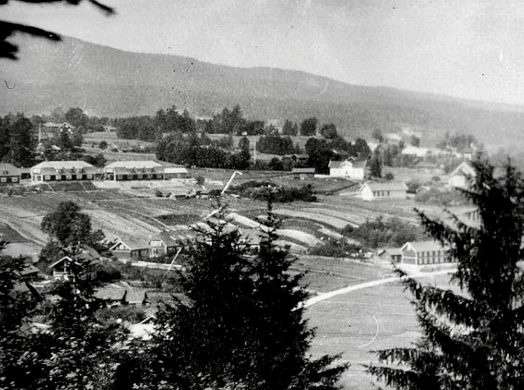 Sagbruket med sine bygningar, det brenner nede på Øra, Solbakken lyser som Soria Moria og ungdomsskolen er ikke bygd: Vi ser låven på øvre Sandbakken.