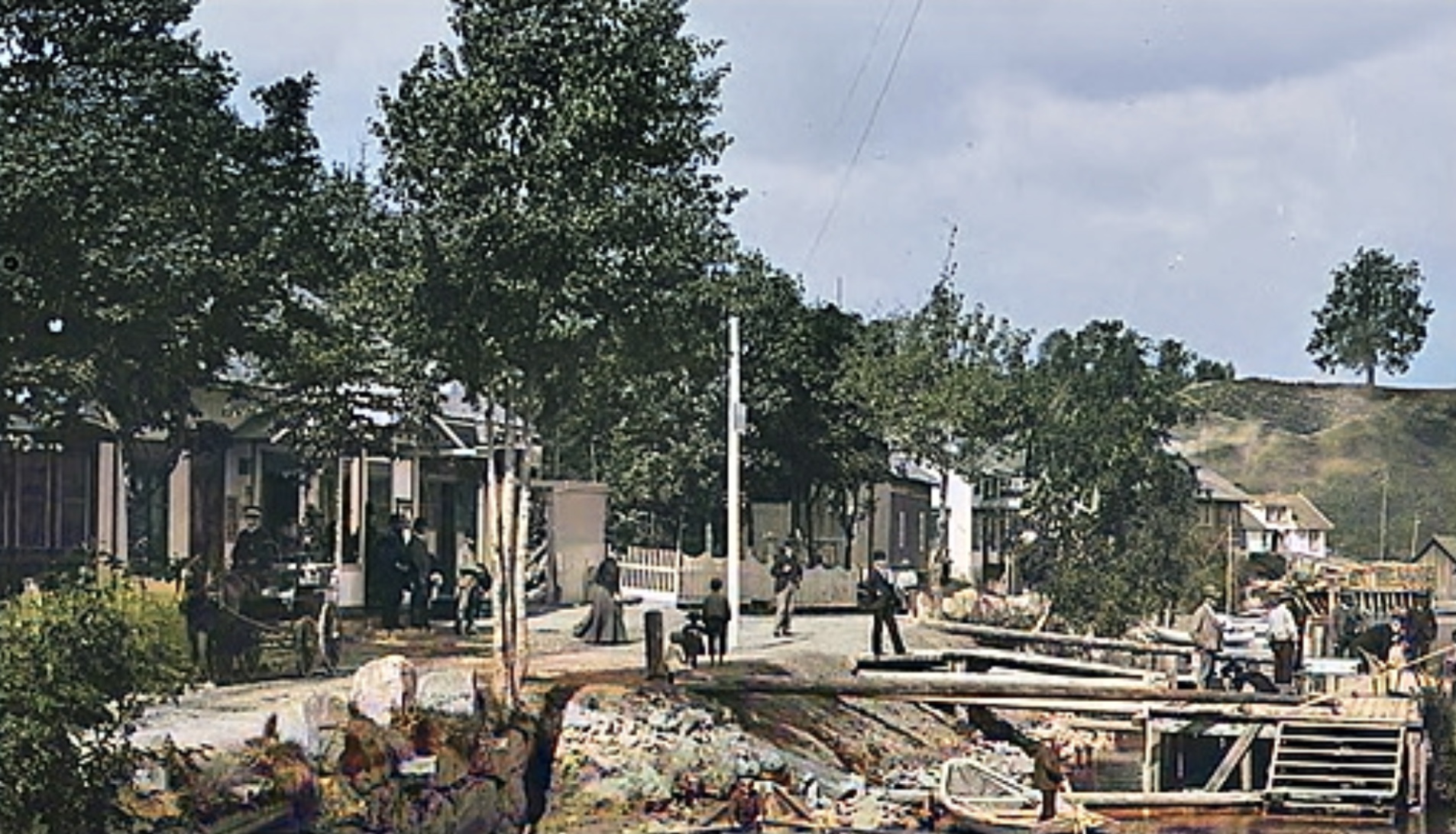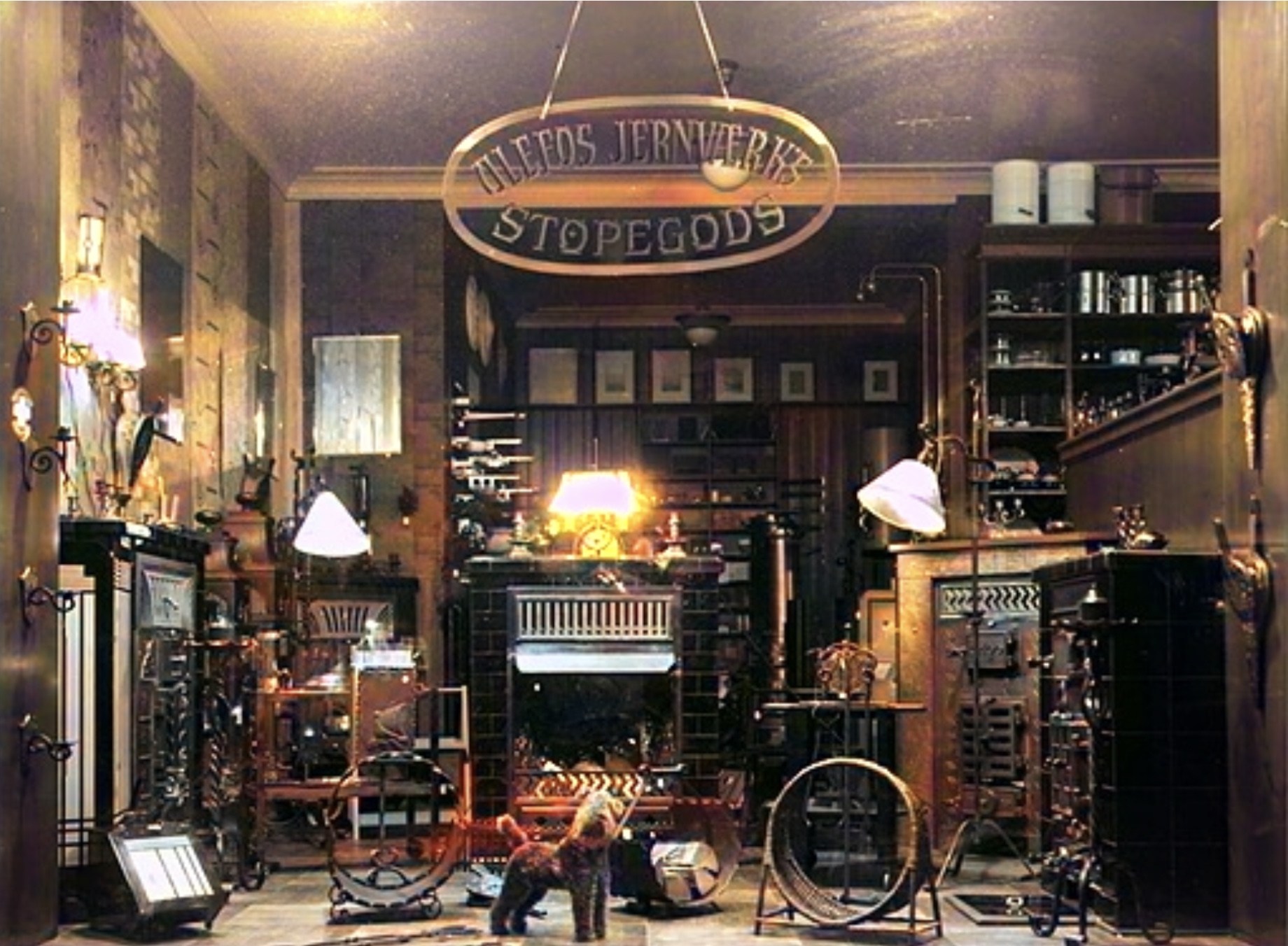 Butikken te familien Bjørnstad i midten og litt av plassen Rue bak. Spiret te kapellet har ennå ikke blitt pakka inn i storfuru.