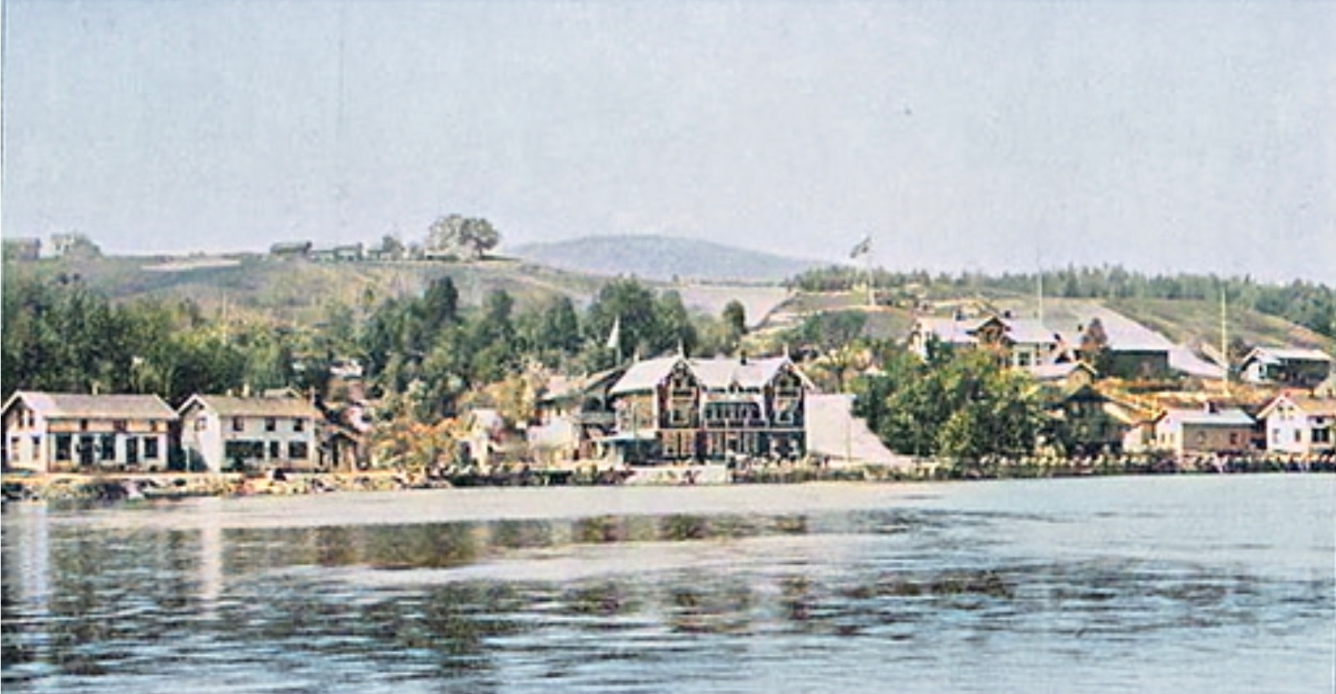 1889/90: Aaheim i storhetstida da båtane kom med varer og folk. Fotografiet viser Aaheim før den voldsomme påbygginga i 1898 og viser den første «Thelemarken». Vi har da bilder av tre ulike utgaver av hotellet! %