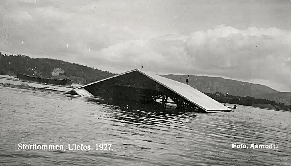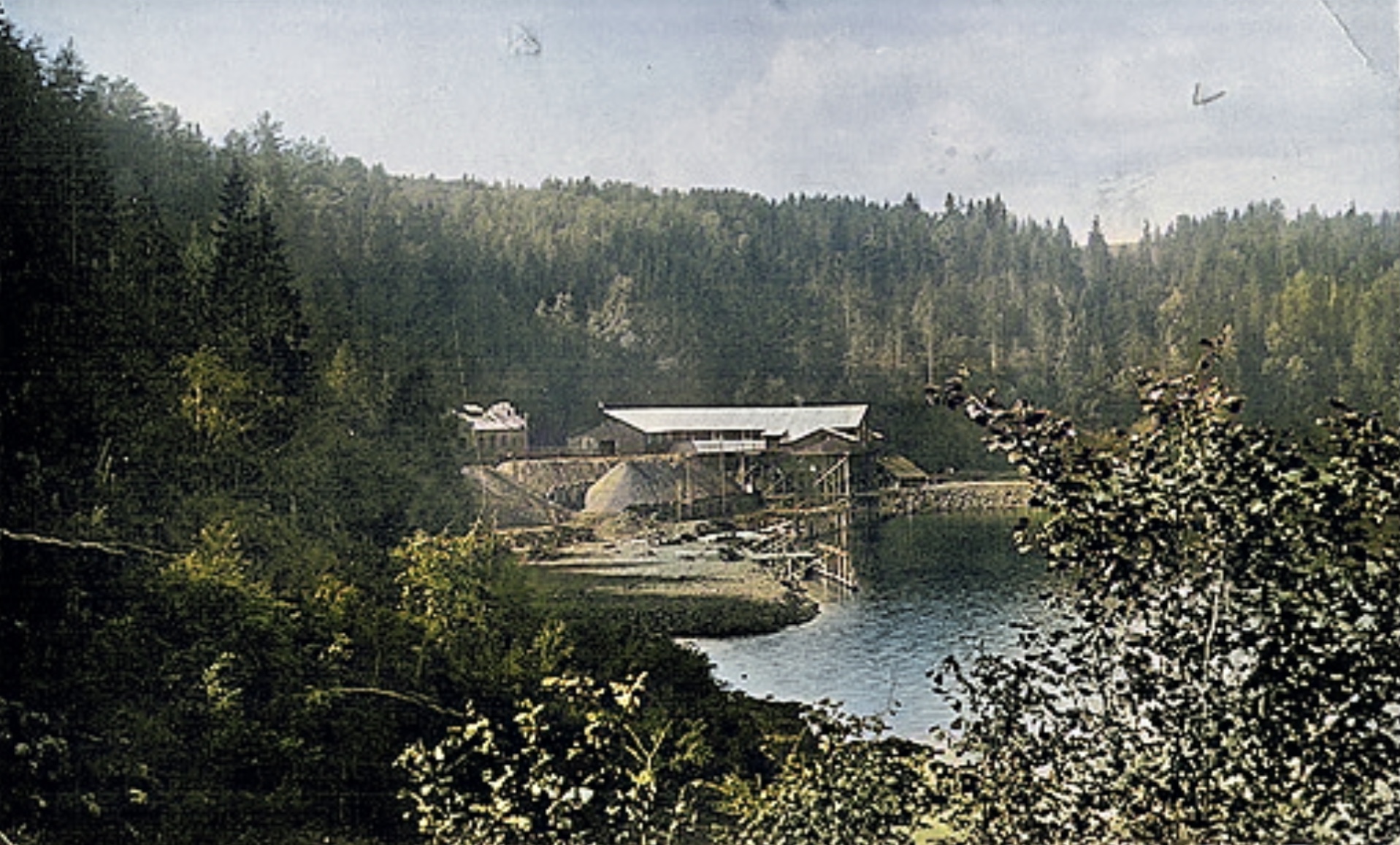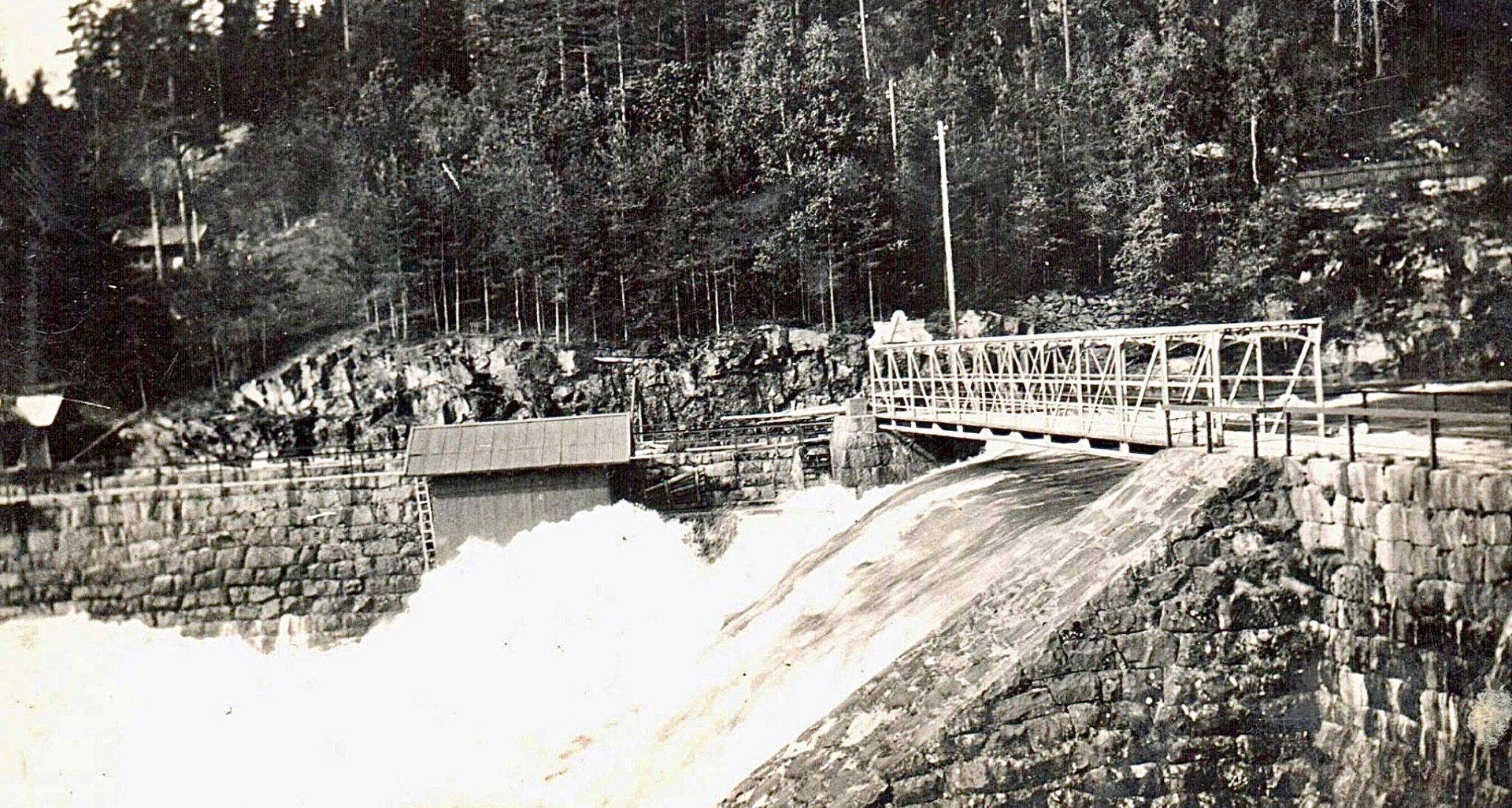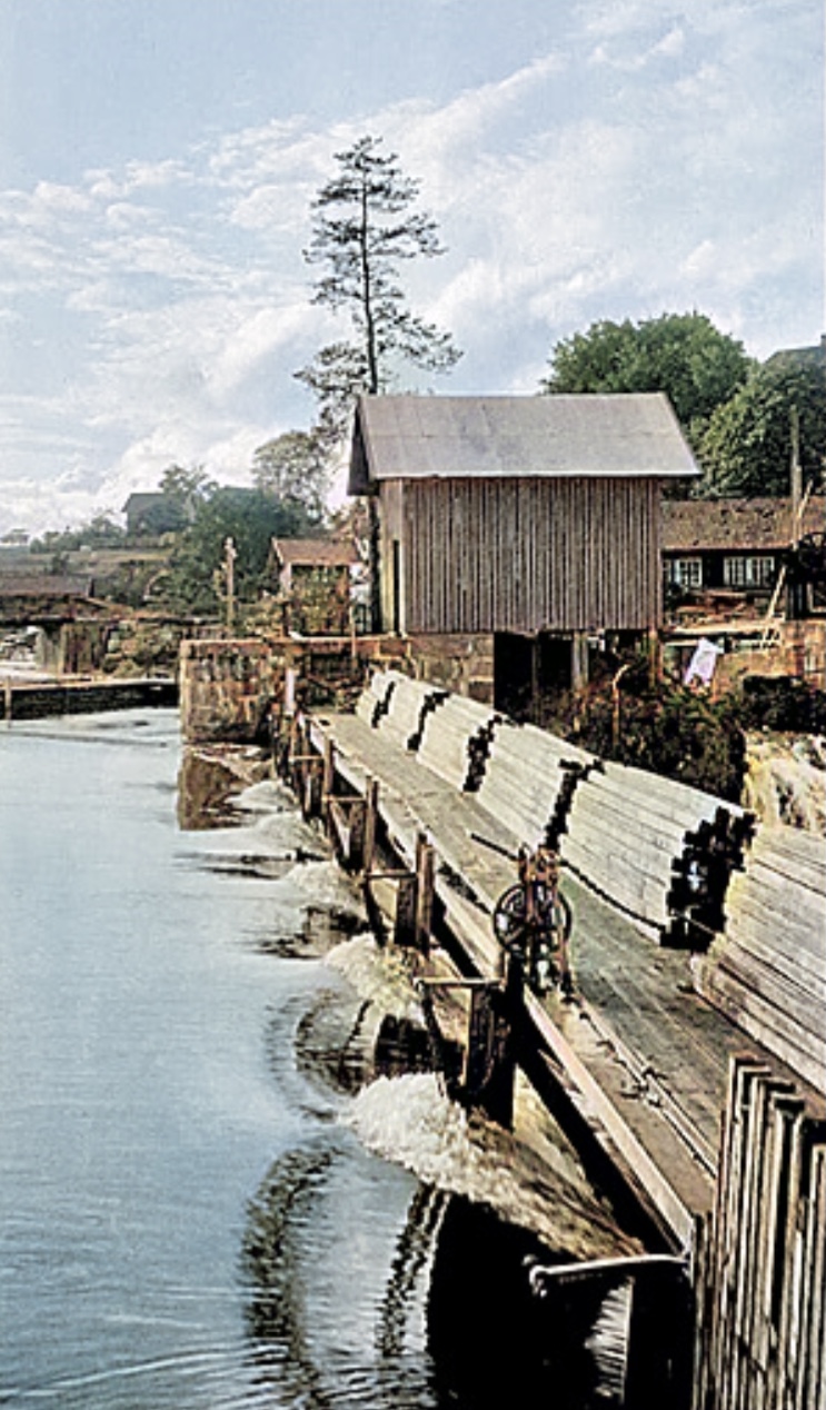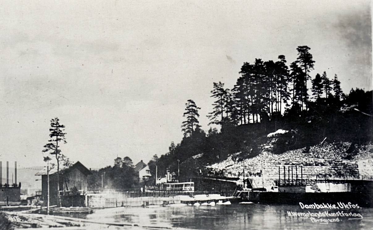 Et ødelagt bilde fra 1898 fra Ulefoss sluse med litt av verket i bakgrunnen