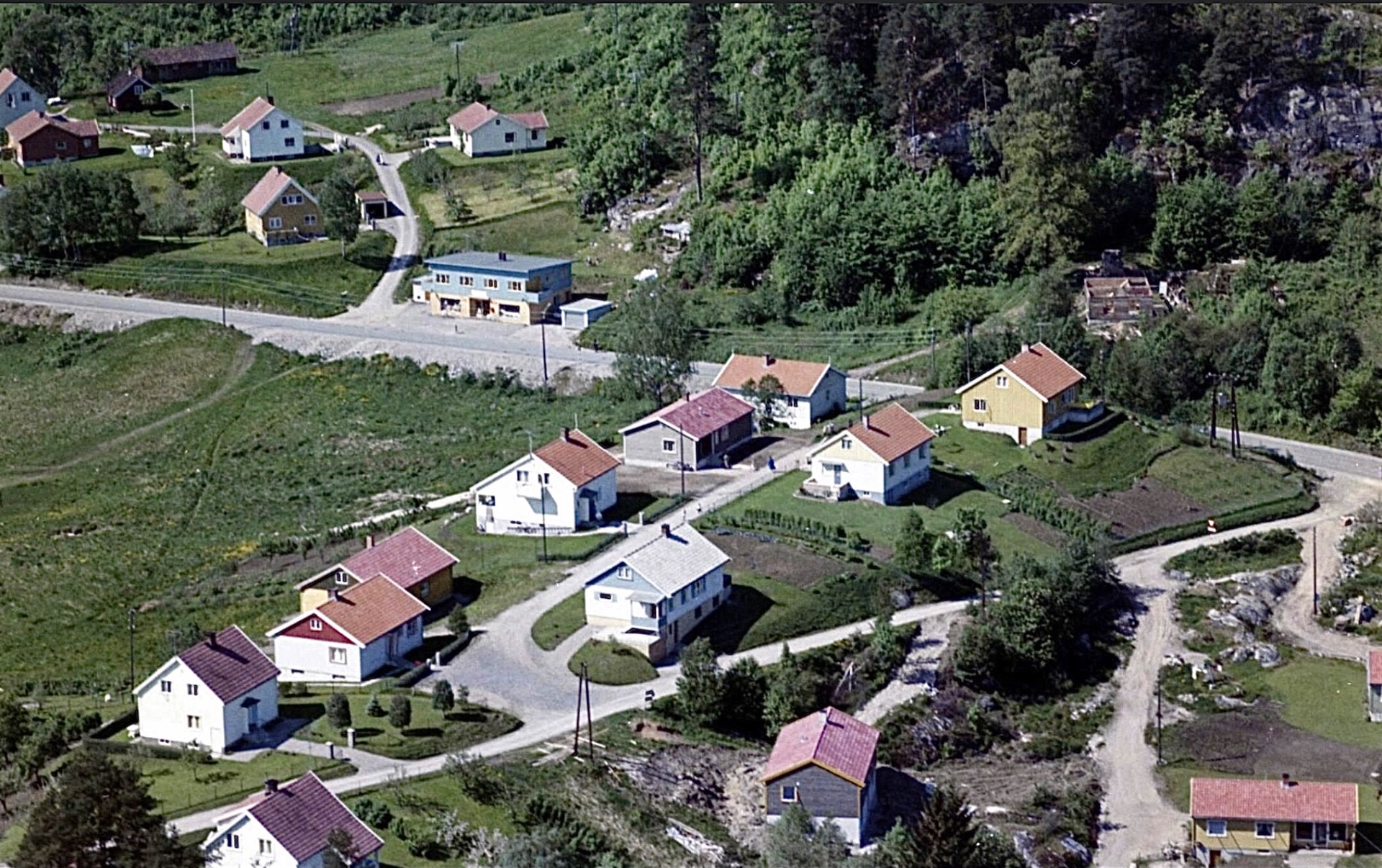 Krøsset fra andre sida. Nærmast har vi verksplassen Bakken. Ved siden av Posthusgården ser vi to rivde hus, et stort og et lite. Slusemesterboligen er bygd om og er nå blitt Samvirkelag. På parkeringsplassen ser vi litt av sanitærbygget og ein kiosk?