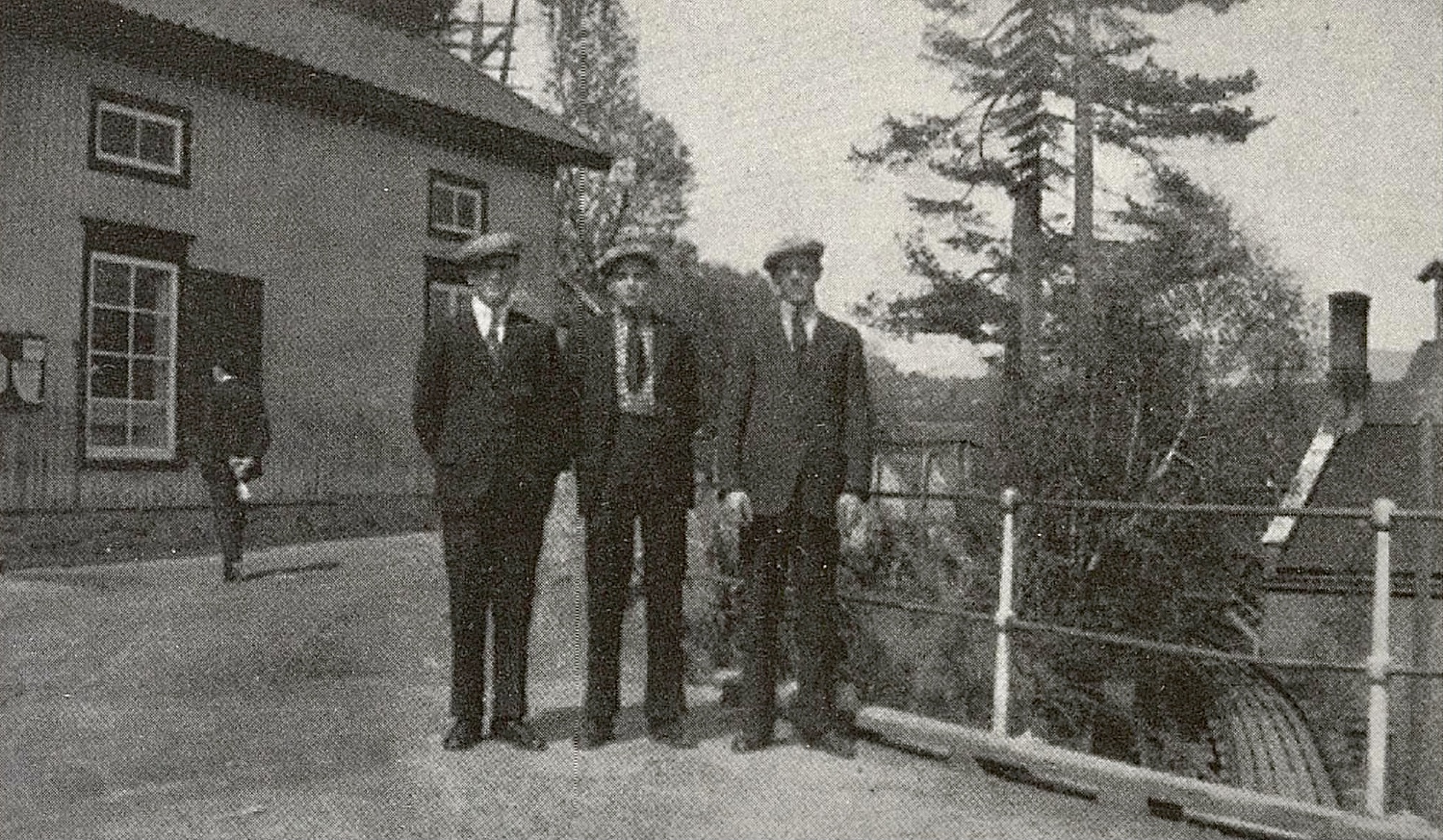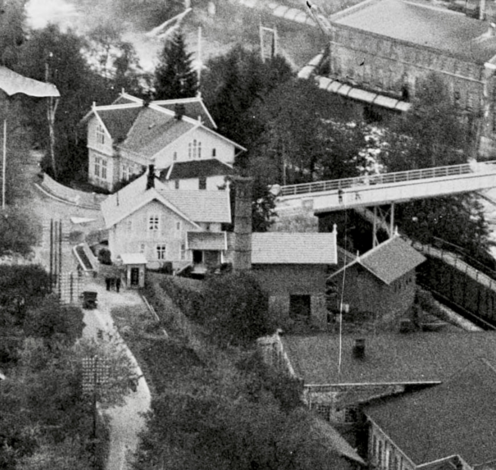 Krøsset med nytt heredshus under bygging. Det blei innvia i 1935. # Detta er et av de få bildene som viser slusemesterboligen før den blei bygd om. Så har vi arbeiderboligane lengst te venstre. De er det heller ikke kjente bilder etter? Det lå før brannen i 1904 ei rekke med arbeiderboligar fra der slakter Bentsen/Brugård bygde og heilt mot oppkjøringa te Kållas. Kållas må peke på bakken der lass med kull gjekk ned. Denne gamle rekka med arbeiderboligar skulle blitt kalla Gamleplass. Er det ikke meir naturlig at det tunet vi ser i detta bildet het Gamleplass? Her er det ei klynge med boligar som ser ut te å ha liggi samla. Dessuten lå manga av de tidligaste arbeiderboligane te verket inne i dagens Holden. Husa som brant i 1904 er det bilder av her. De va enkeltståande og da burde kanskje denne rekka blitt kalt Gamleplassane?