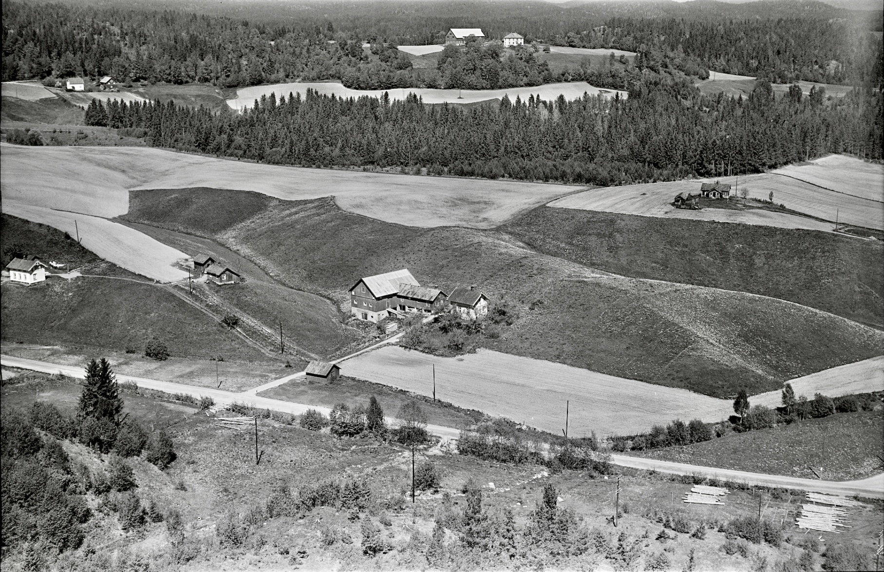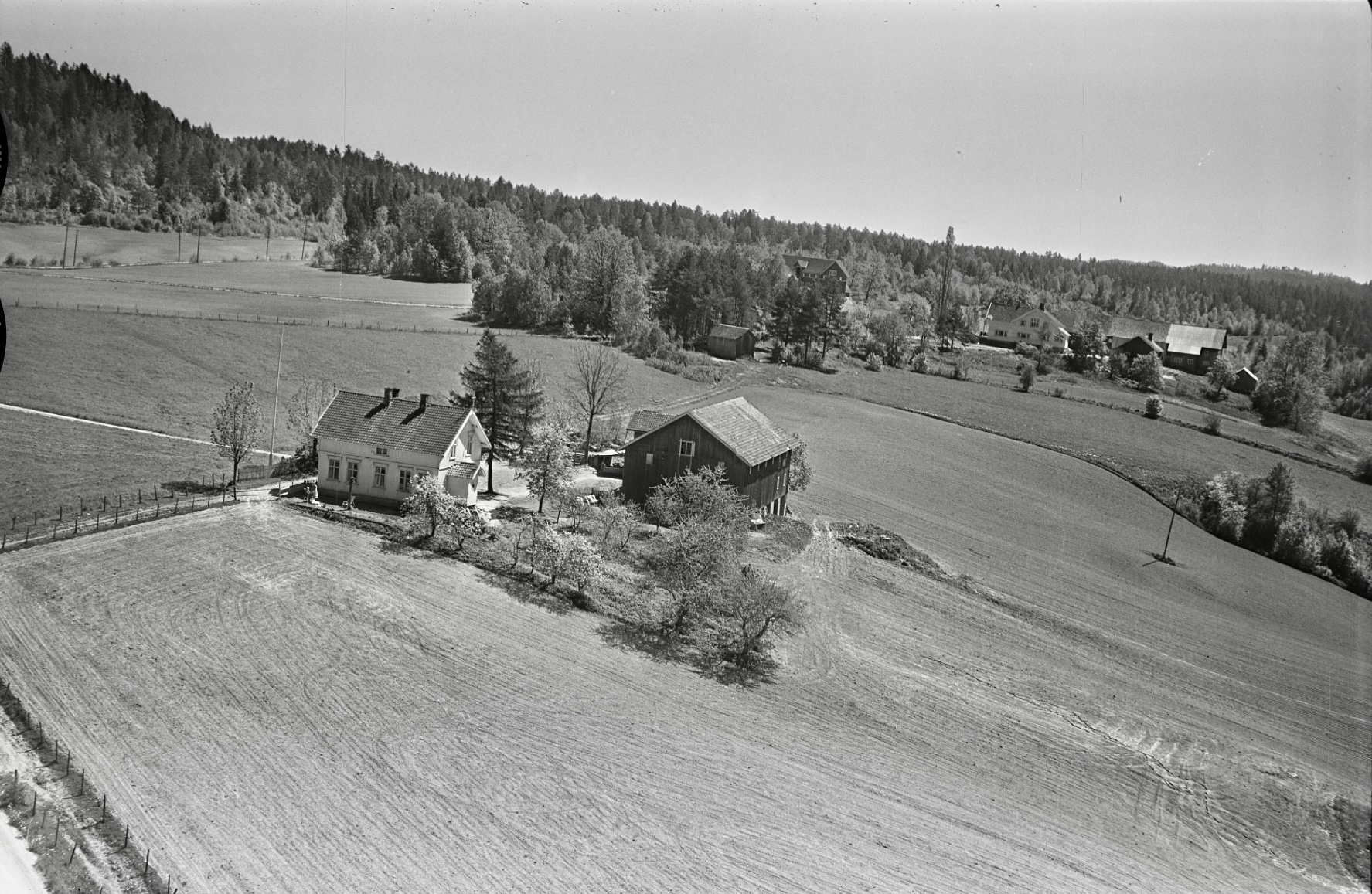 Nordre Einerhaugen te høyre og søndre te venstre. På andre sida av veien ligger Teigen. Bildet er fra 1952.