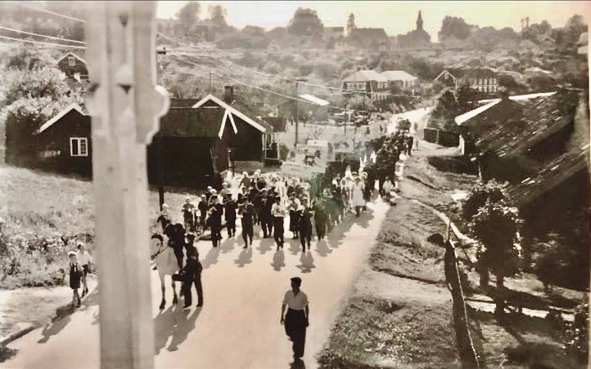 Her har vi Haugbygningen og som vi ser er den eine av to slaggsteinsbygninger ved siden av påstarta riving. Dette va torgområdet hvor det blei solgt ulike varer i tidligare tider. Det som i mi tid blei kalla Centrumssvingen etter caféen, er i tidligare tider blitt kalla torgsvingen.