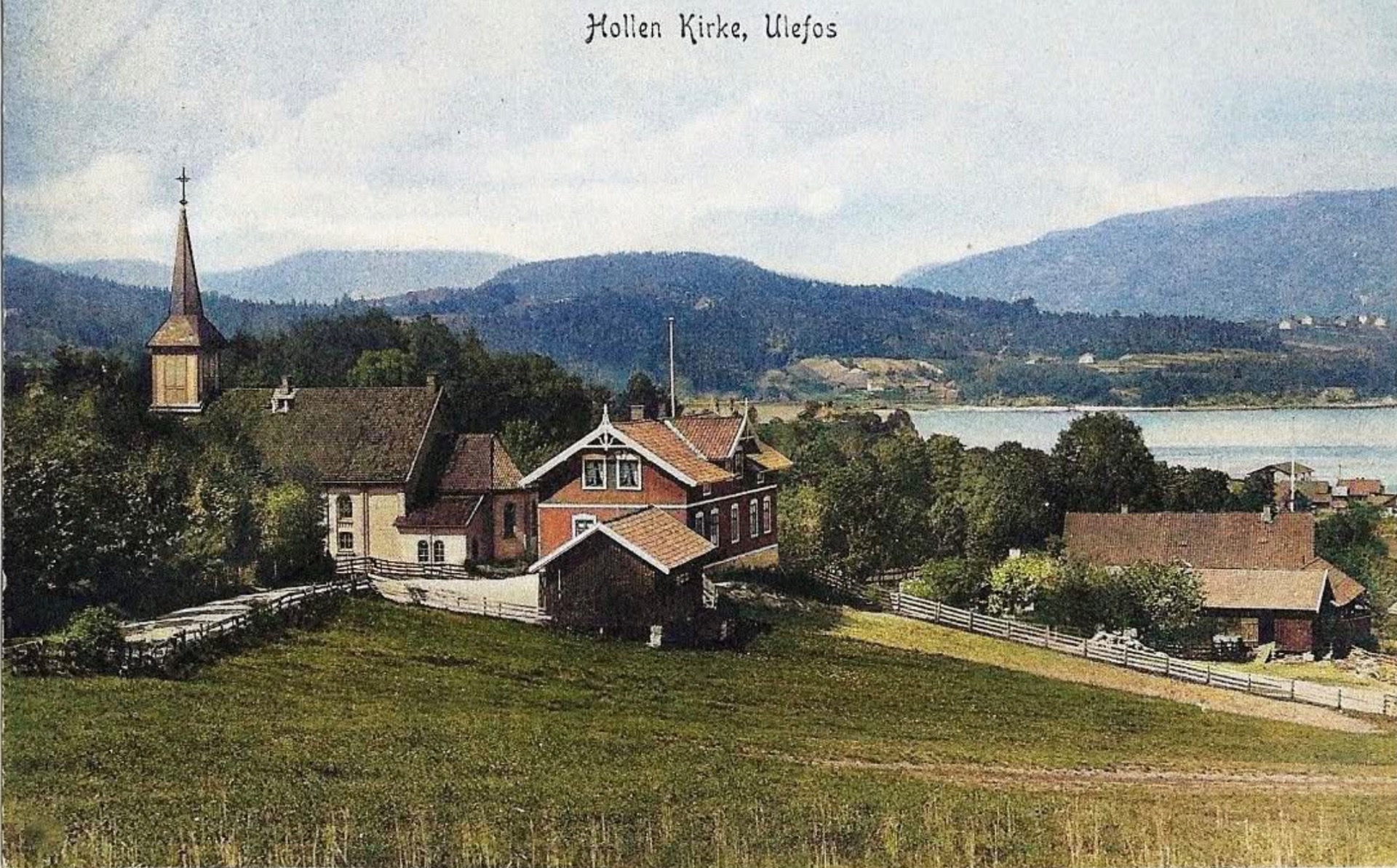 Heilt te venstre ser vi Holla Handelsforening. Detta va et A/S der tomta blei kjøpt i 1909 og plassen fekk navnet Folkvang. De va opprinnelig 6 støkker på eiarsida og i februar 1910 blir det lånt pengar for å bygge butikklokalet.