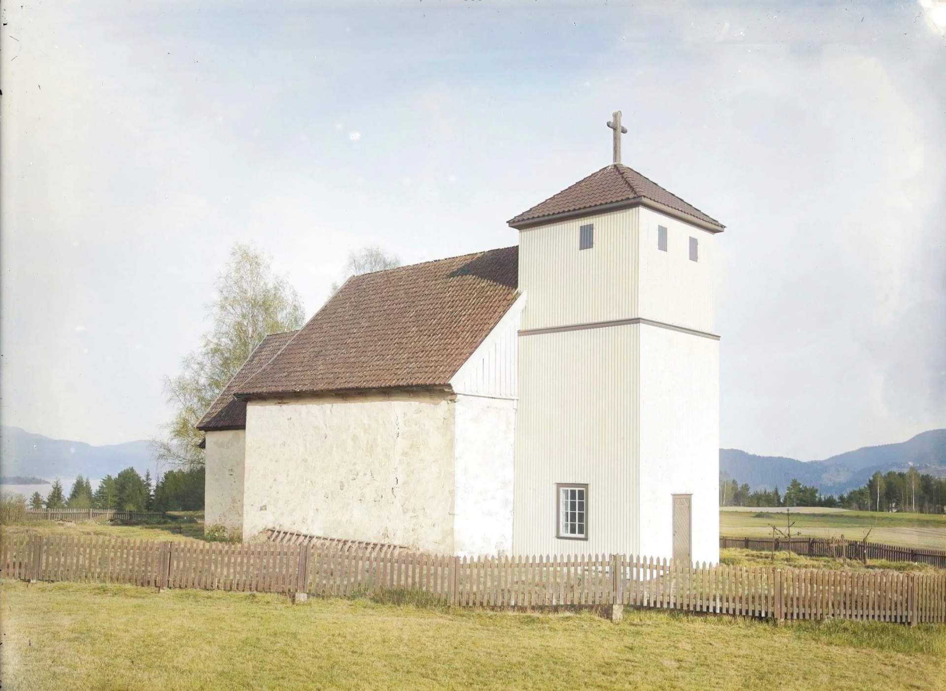 Fotografiet er tatt i 1875 og kjerka er bare 8 år gammal. Her ser vi tydelig at området kjerka blei bygd i, va beiteområder for de gamle verksplassane som lå under Bjelkebakken-paraplyen. Les om Bjelkebakken plassane på denna nettsida! Den ytre delen av Øra-området er delt fra resten av Øra av vann!