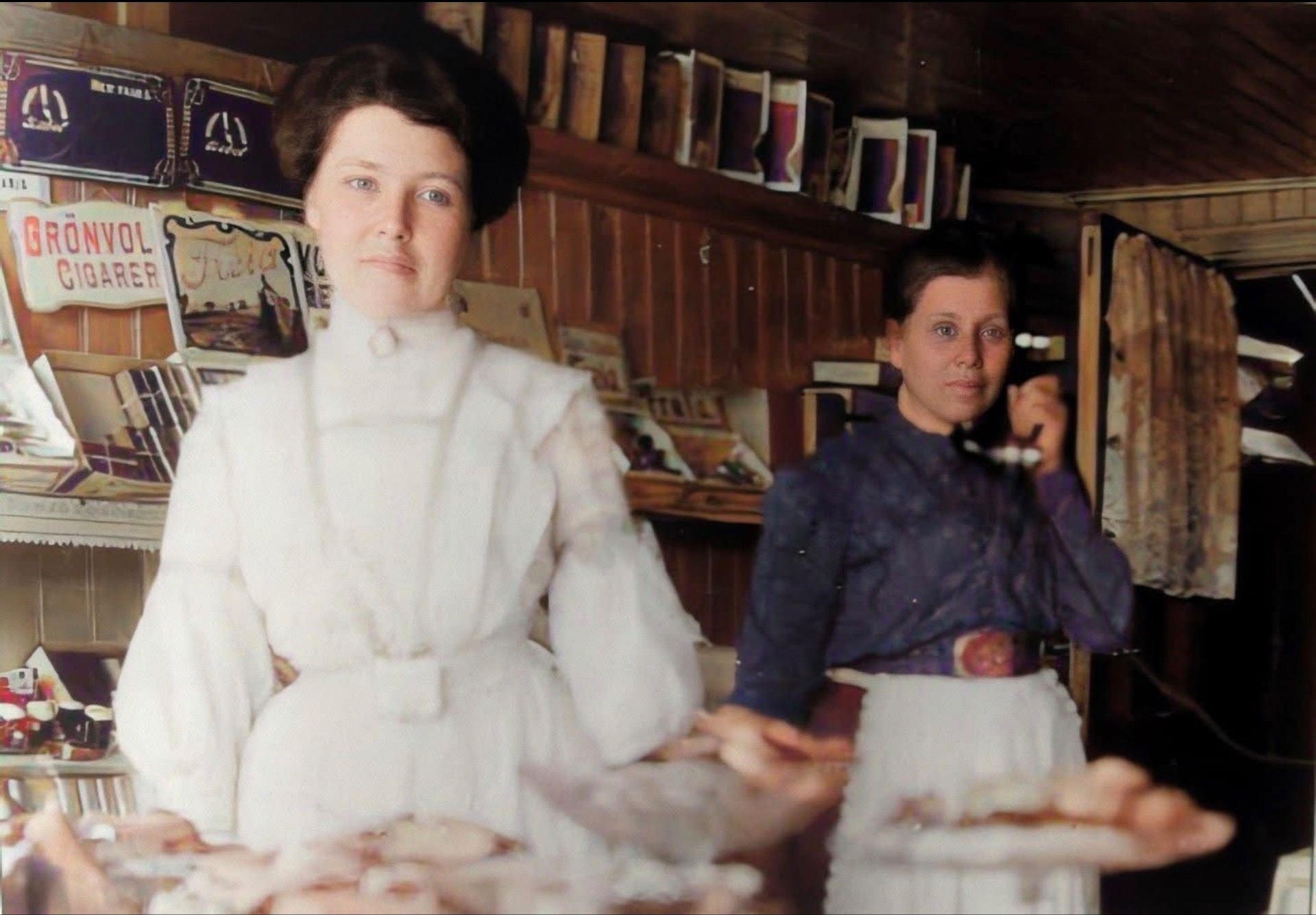 Jeg fører innimellom at et bilde er håndkolorert. Det betyr rett og slett at noen med litt kunstnerisk sans, la farge på utvalgte svarthvitt bilder. Dissa blei siden trøkt i ulike opplag. Noen havna på veggane heime hos folk, andre på postkort.