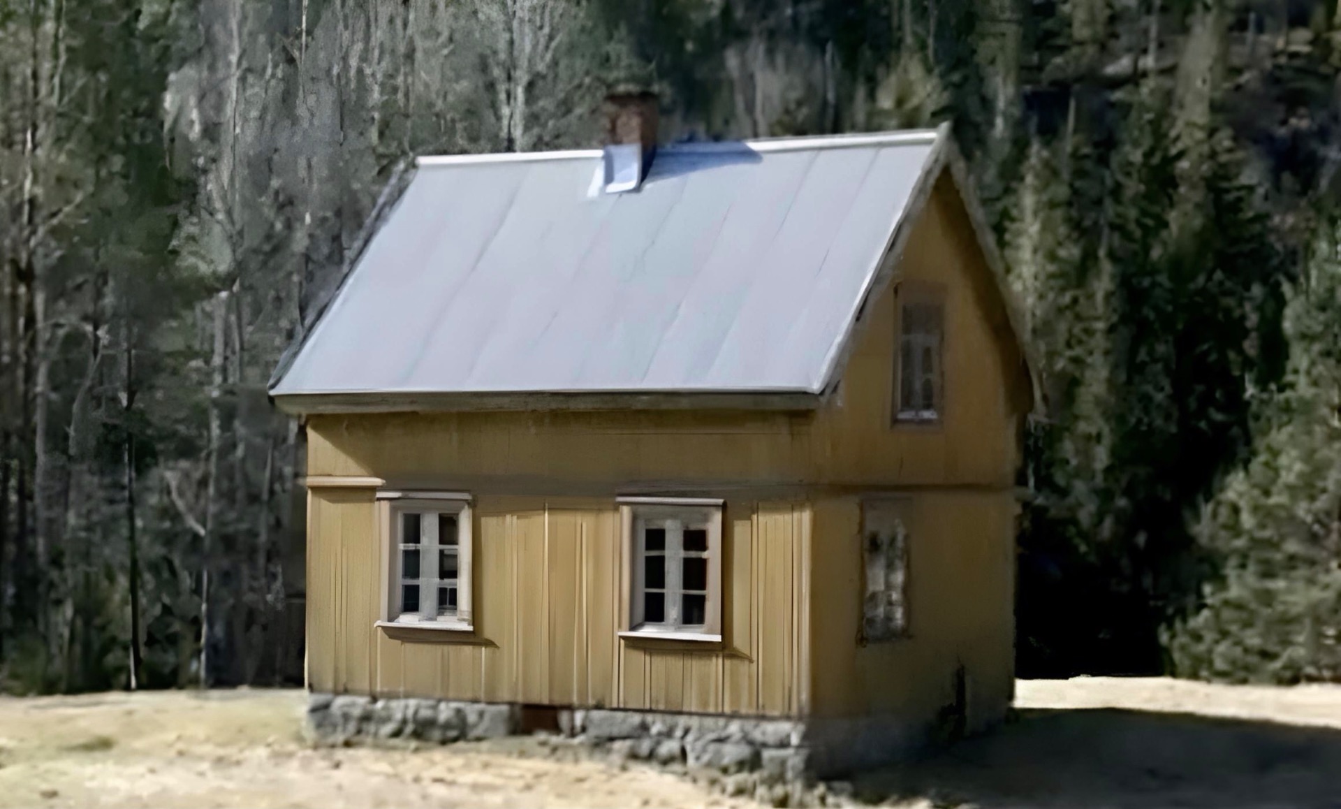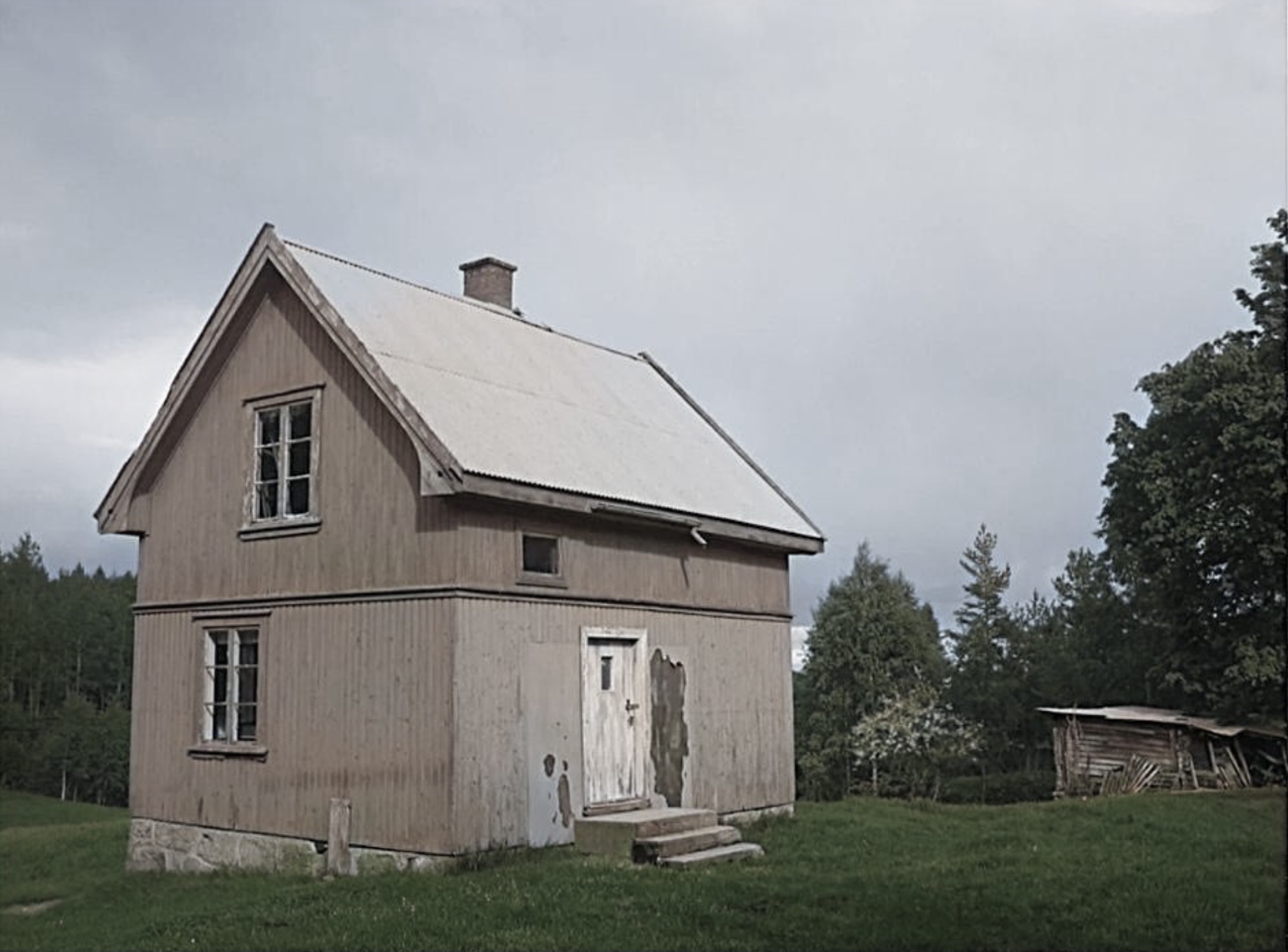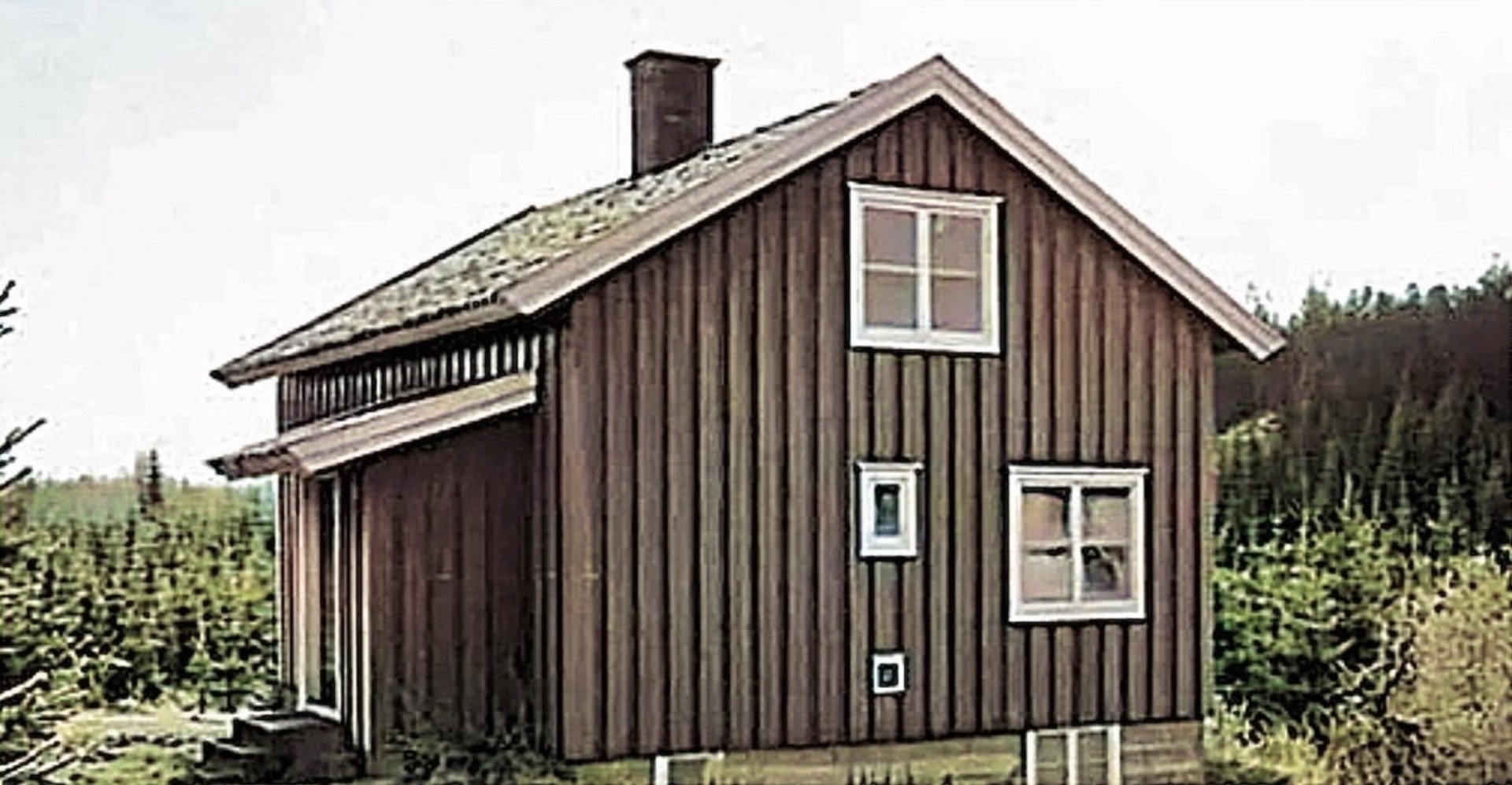 Østsida: Huset måler rundt 5x4 meter med gang, stue og kjøkken nede og 2-3 soverom oppe
