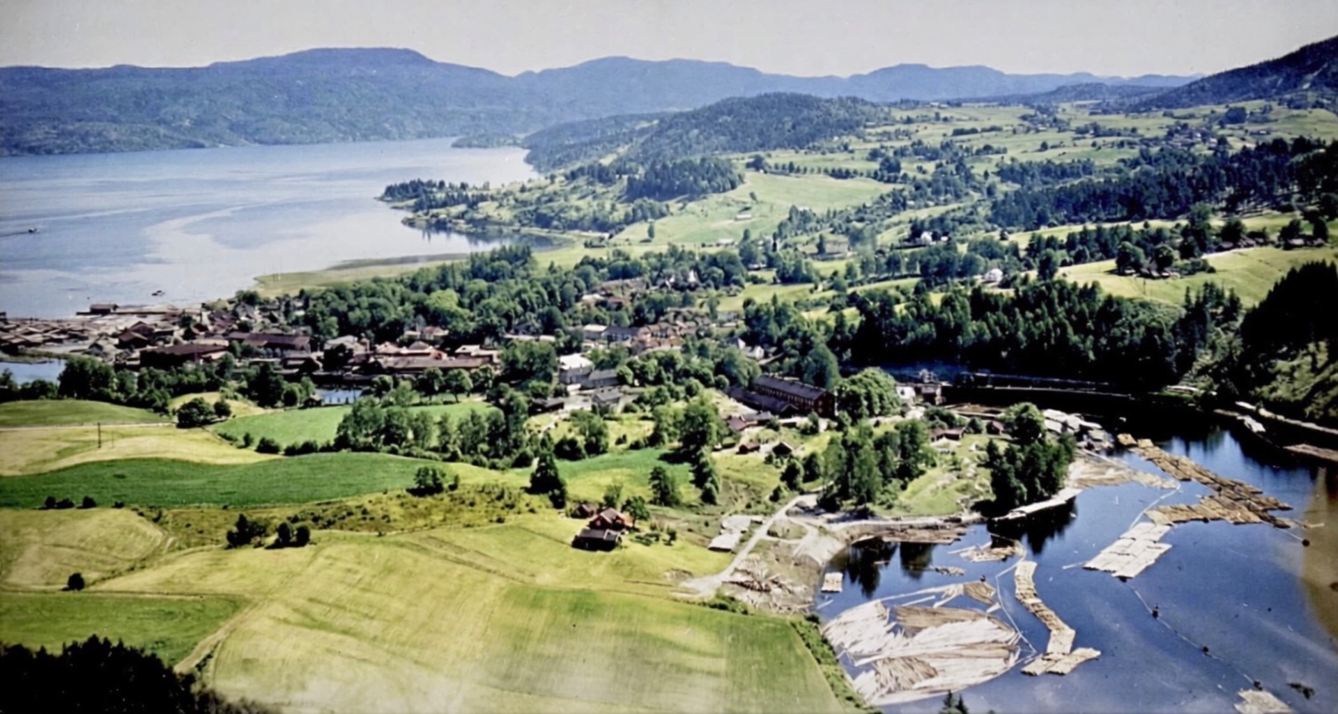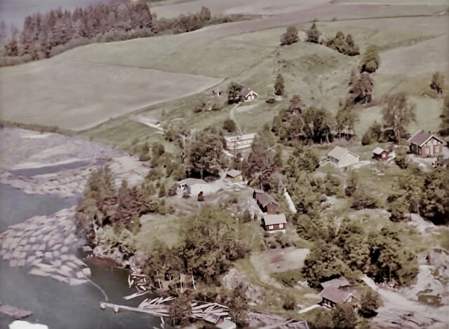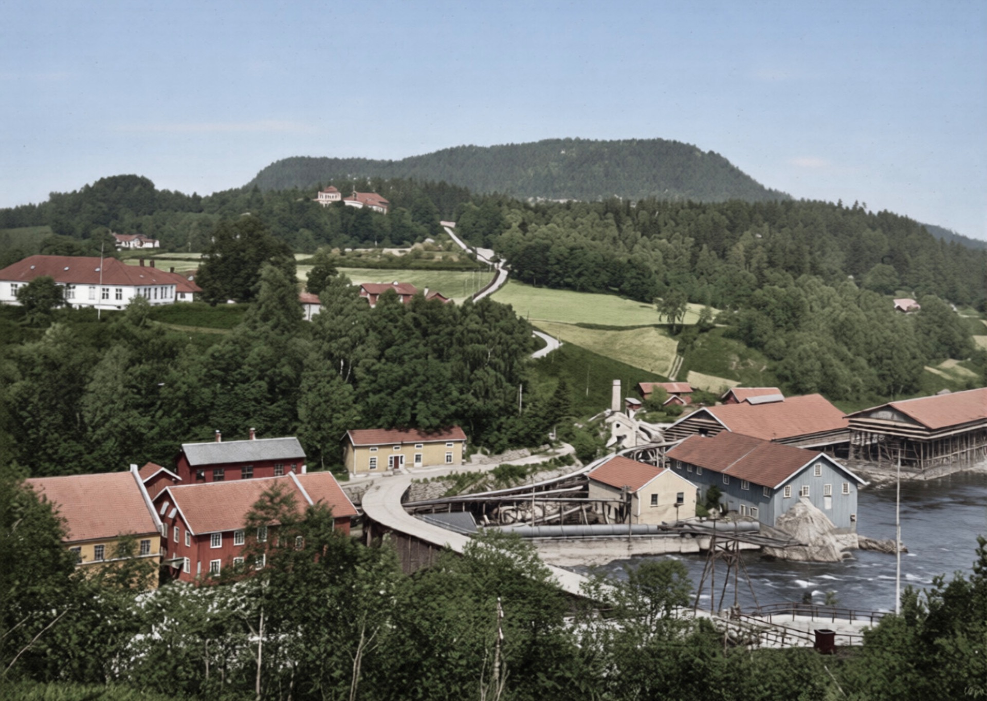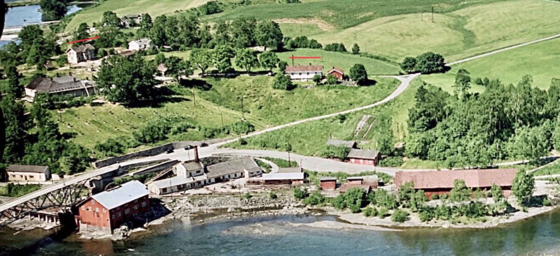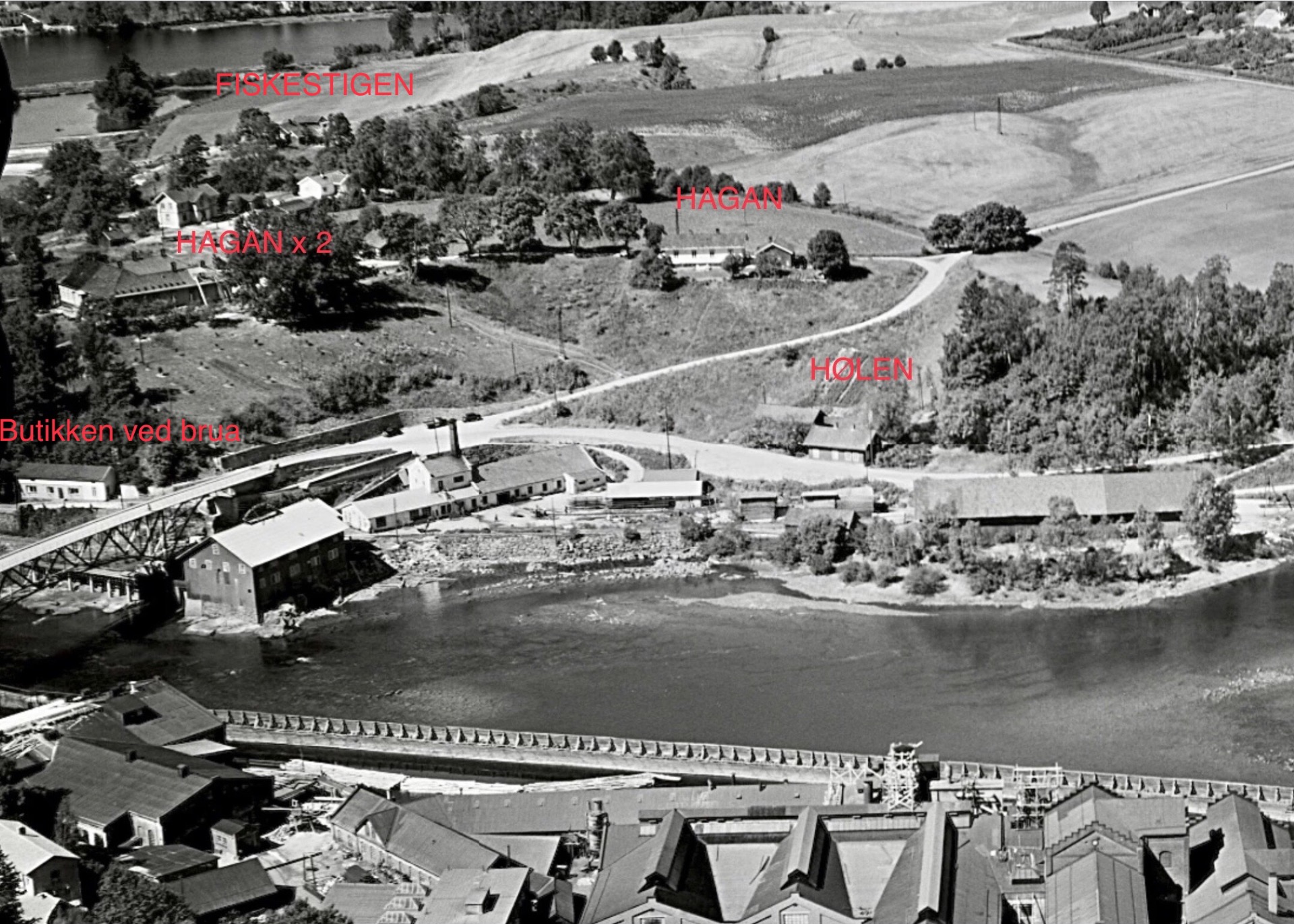 Vi ser tørkeriet te cellulose-massa og vi skimtar ein gammal veistubb som går parallelt med dagens vei. Det røde huset er ein gammal Hølen-plass.