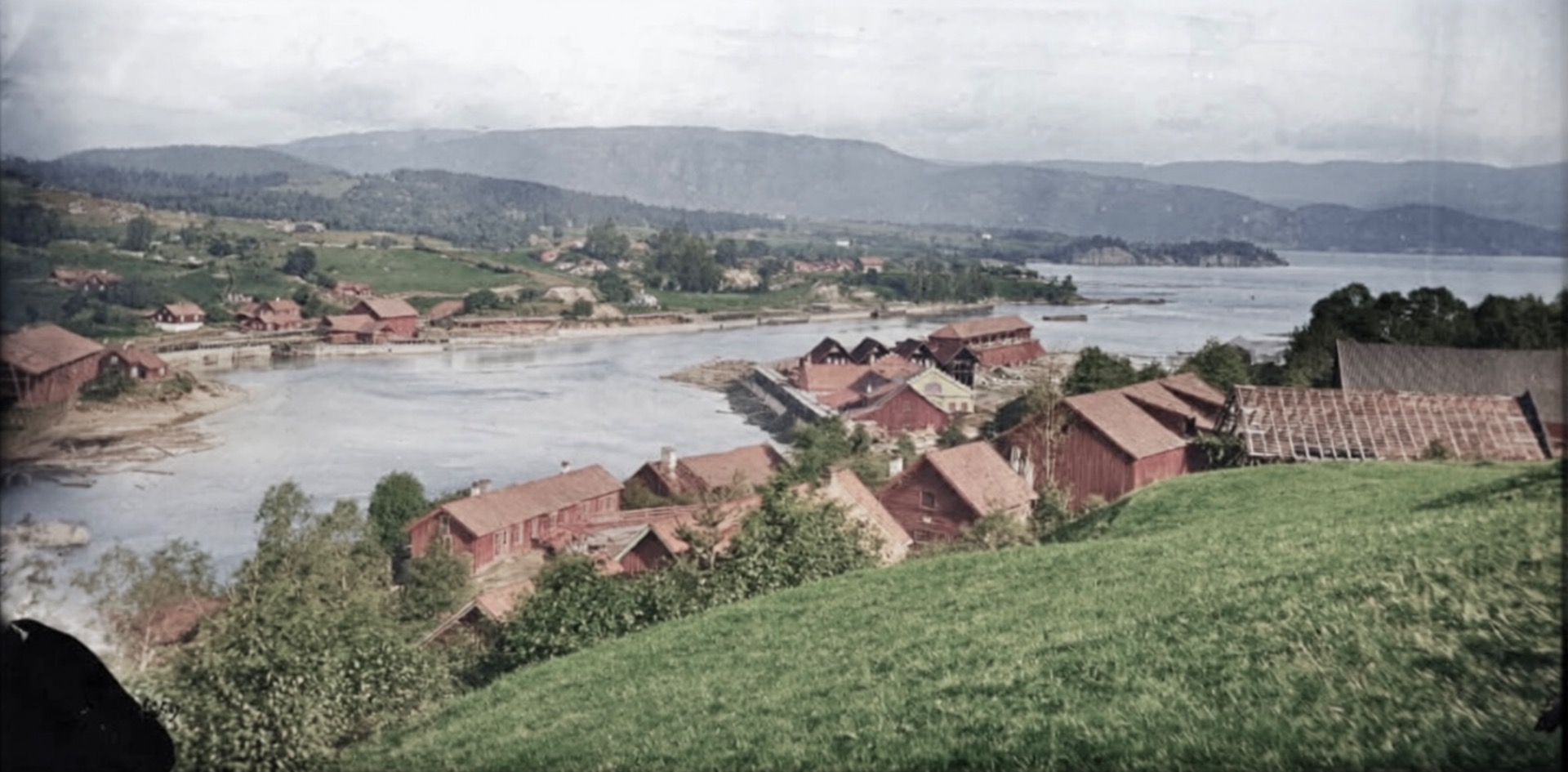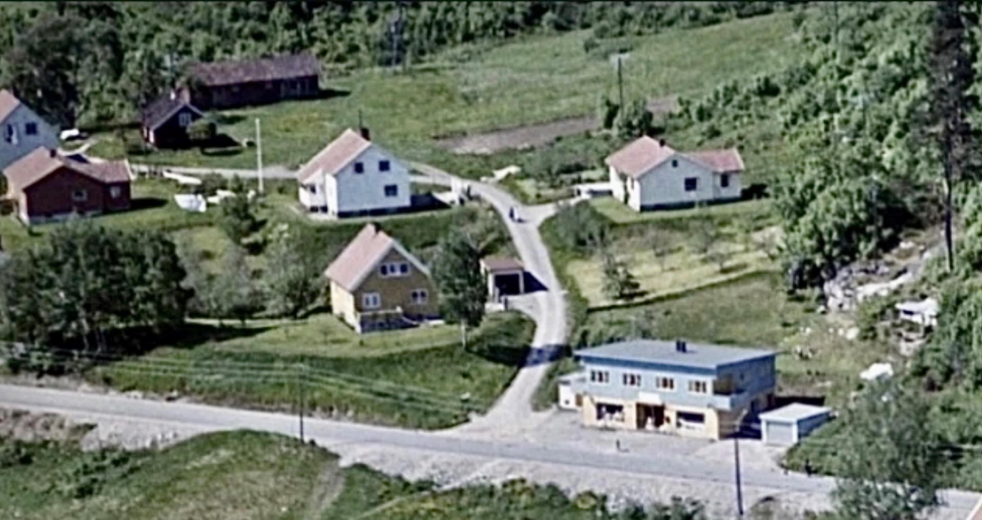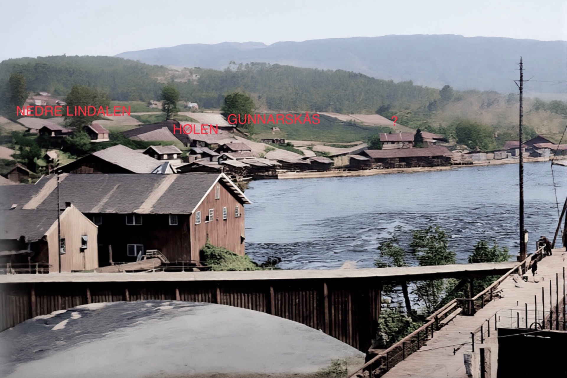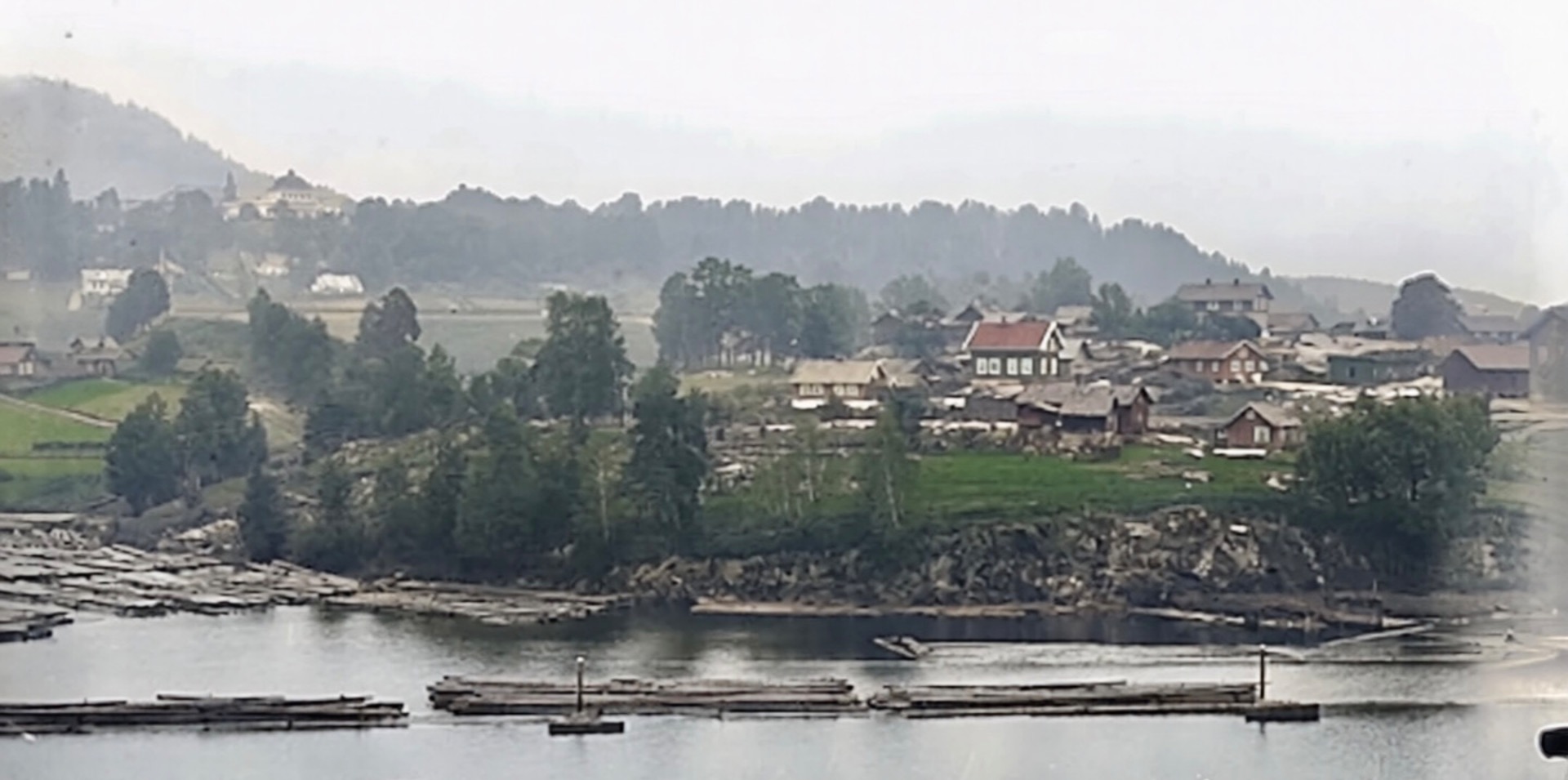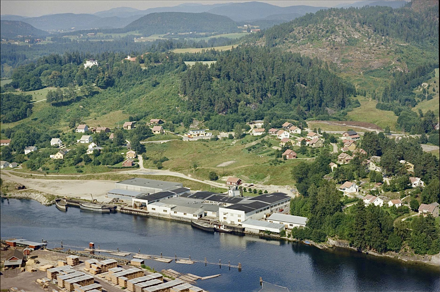 Vi ser tørkeriet te cellulose-massa og vi skimtar ein gammal veistubb som går parallelt med dagens vei. Det røde huset er ein gammal Hølen-plass.