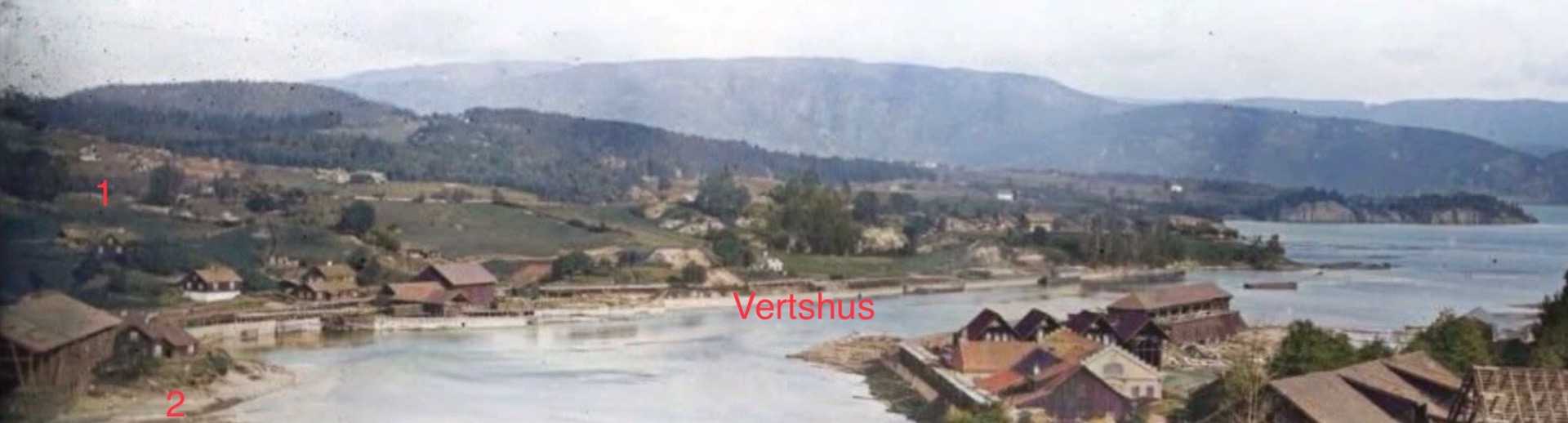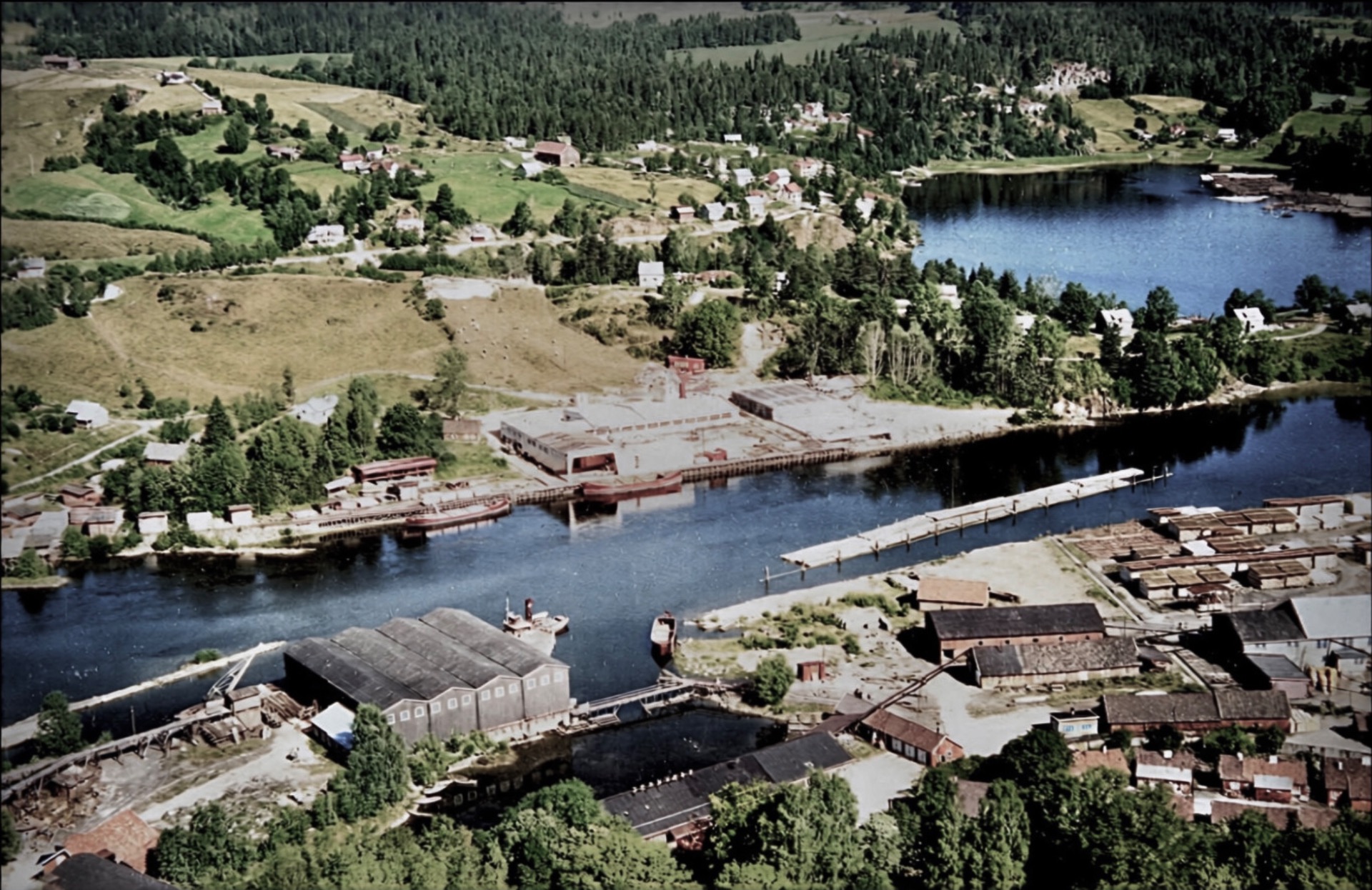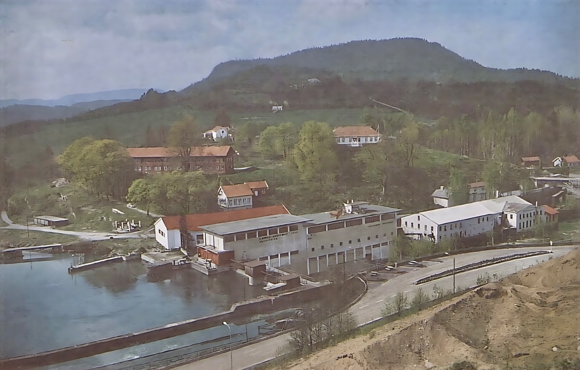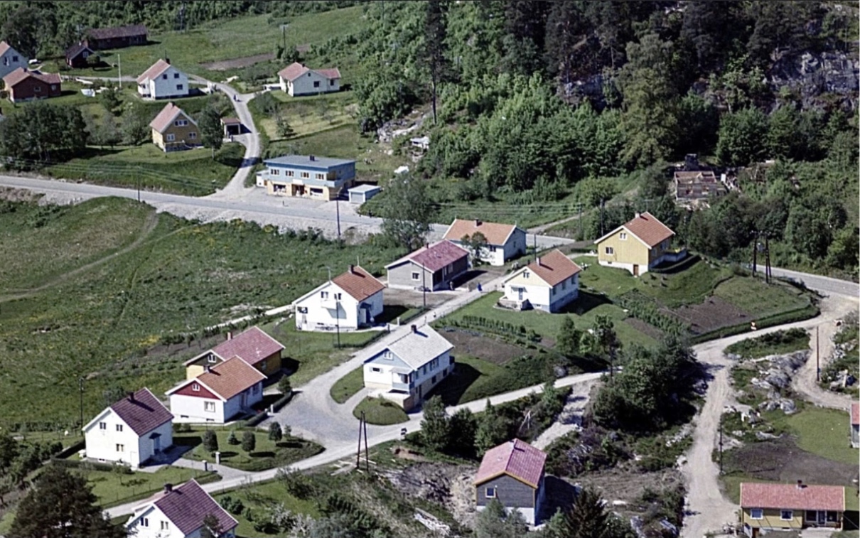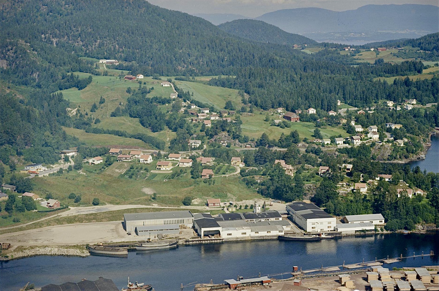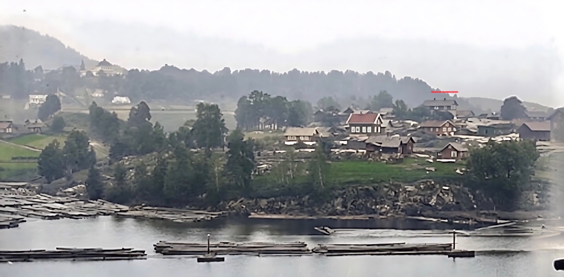 Vi ser tørkeriet te cellulose-massa og vi skimtar ein gammal veistubb som går parallelt med dagens vei. Det røde huset er ein gammal Hølen-plass.