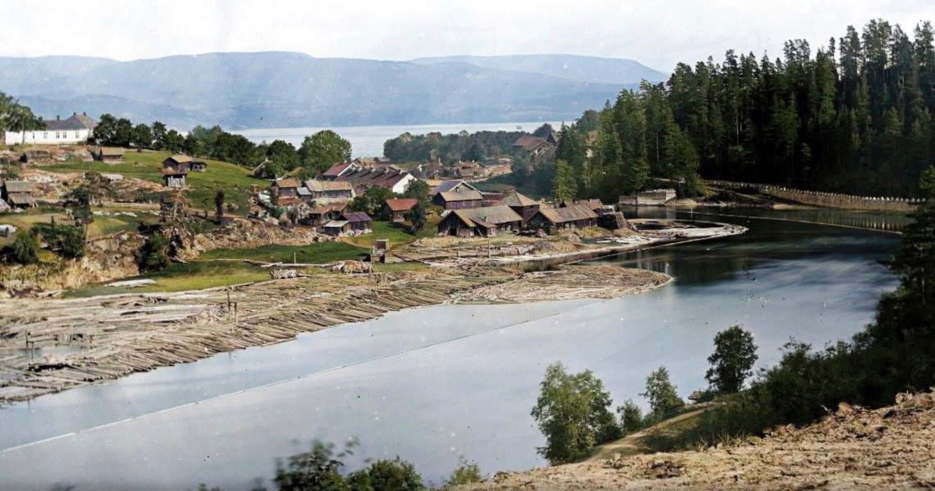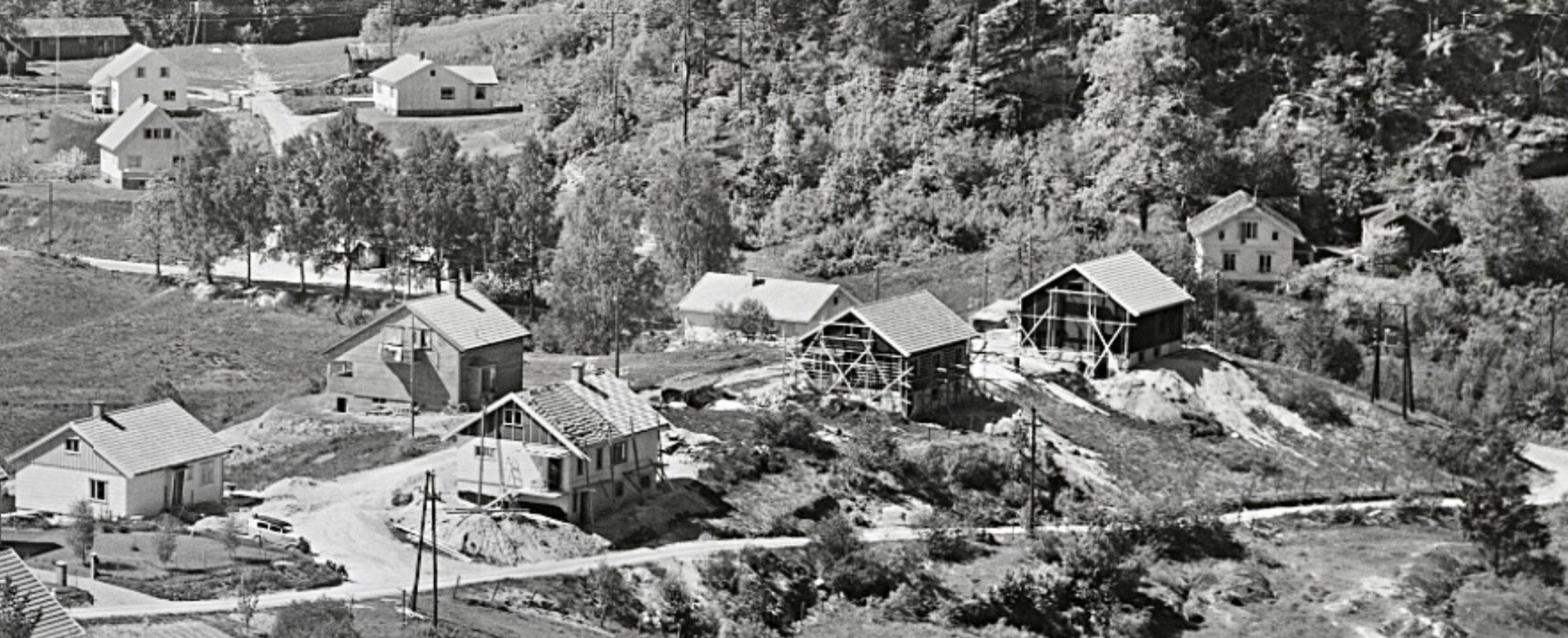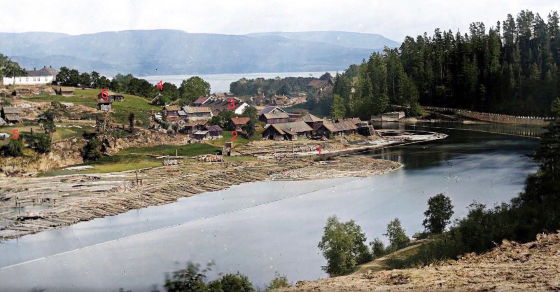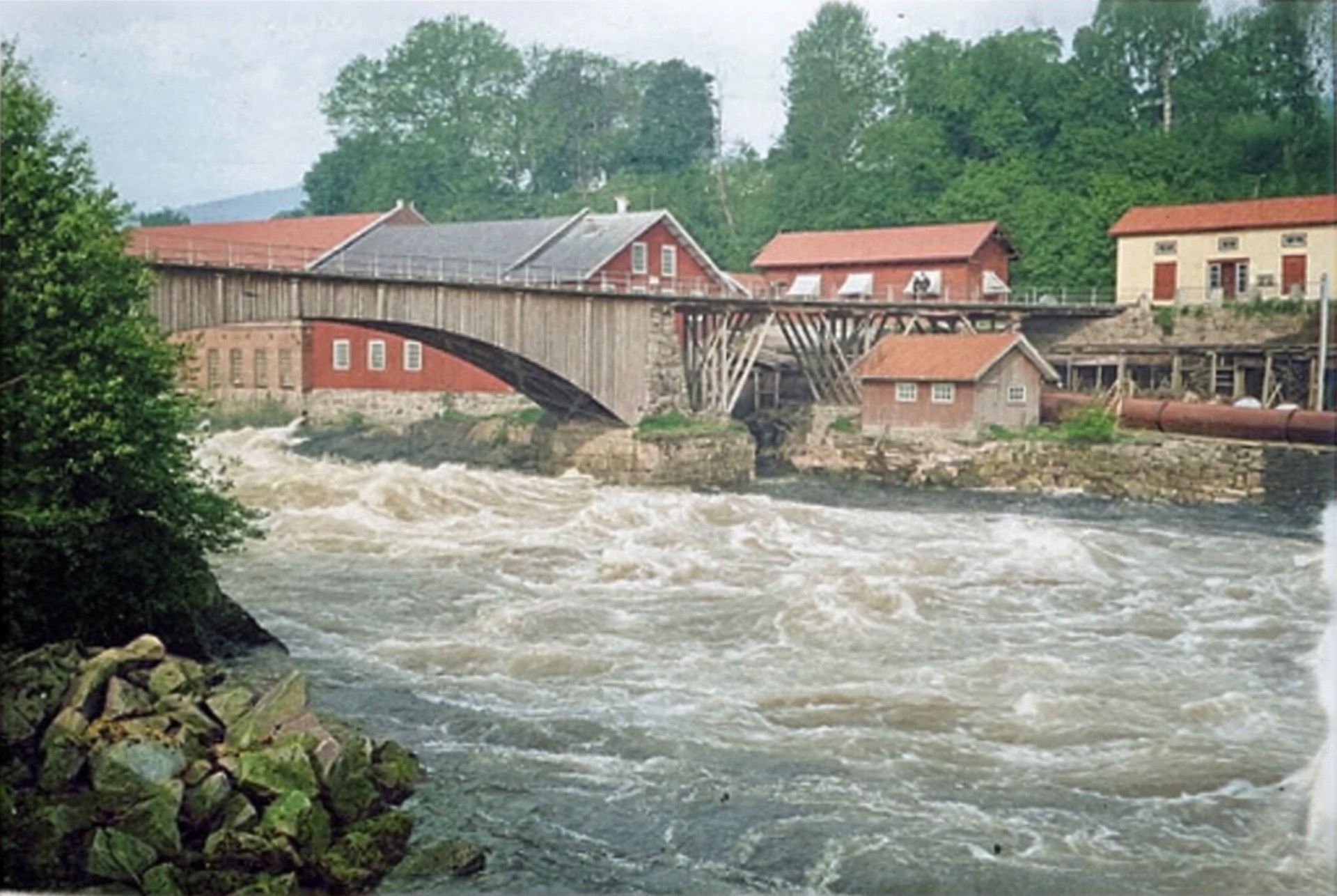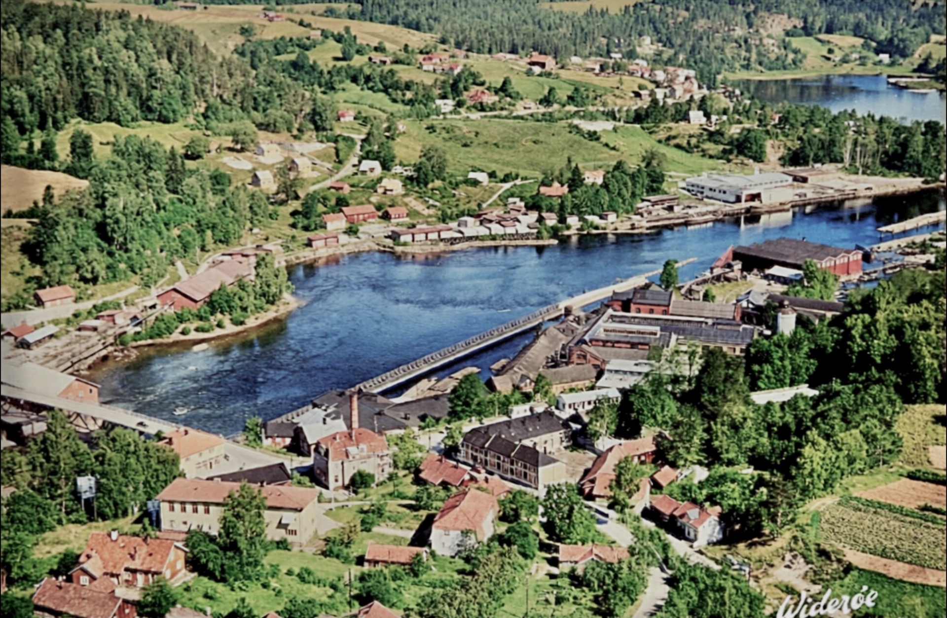 Vi ser tørkeriet te cellulose-massa og vi skimtar ein gammal veistubb som går parallelt med dagens vei. Det røde huset er ein gammal Hølen-plass.