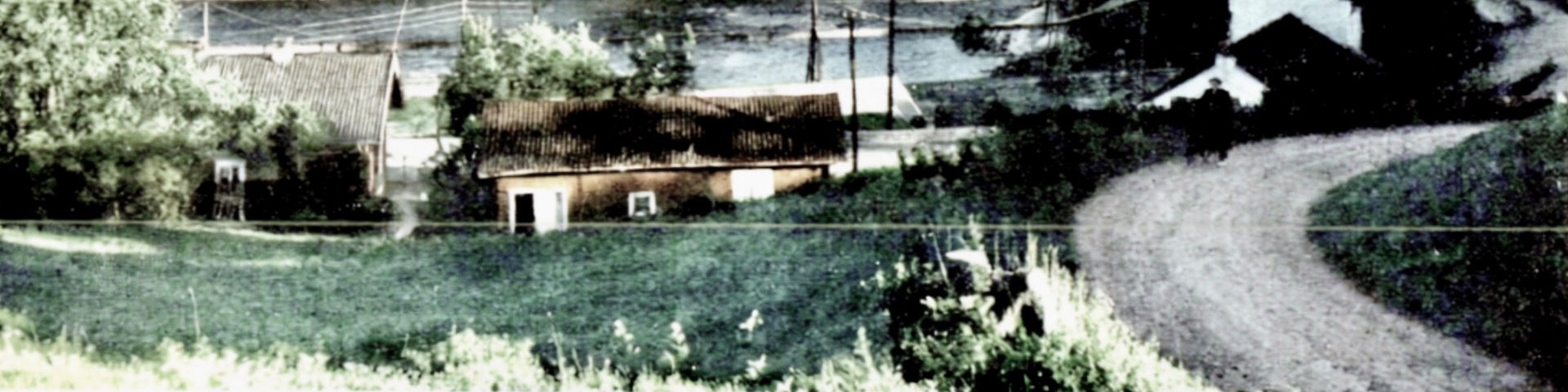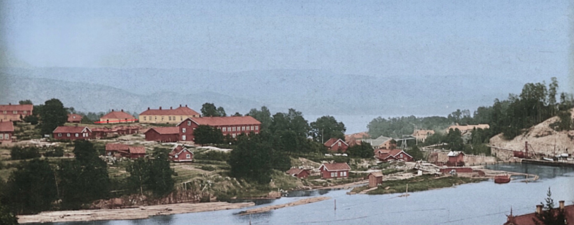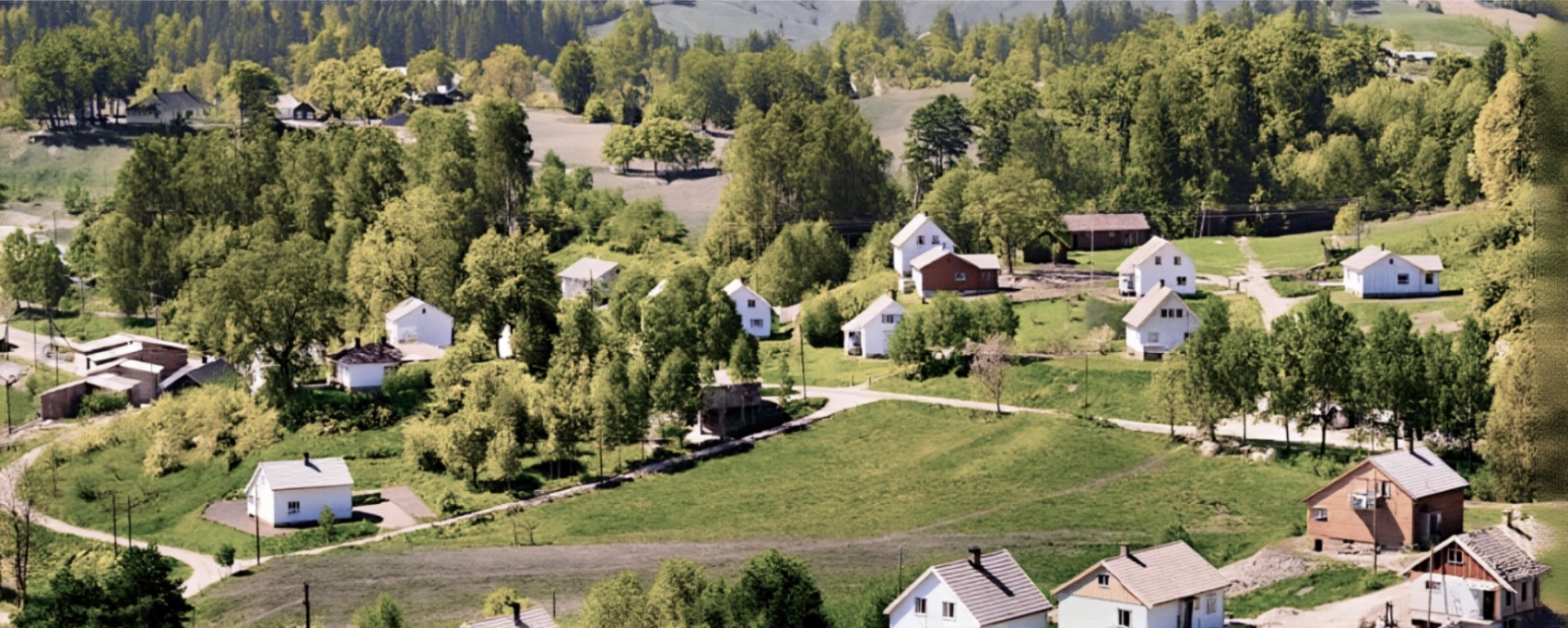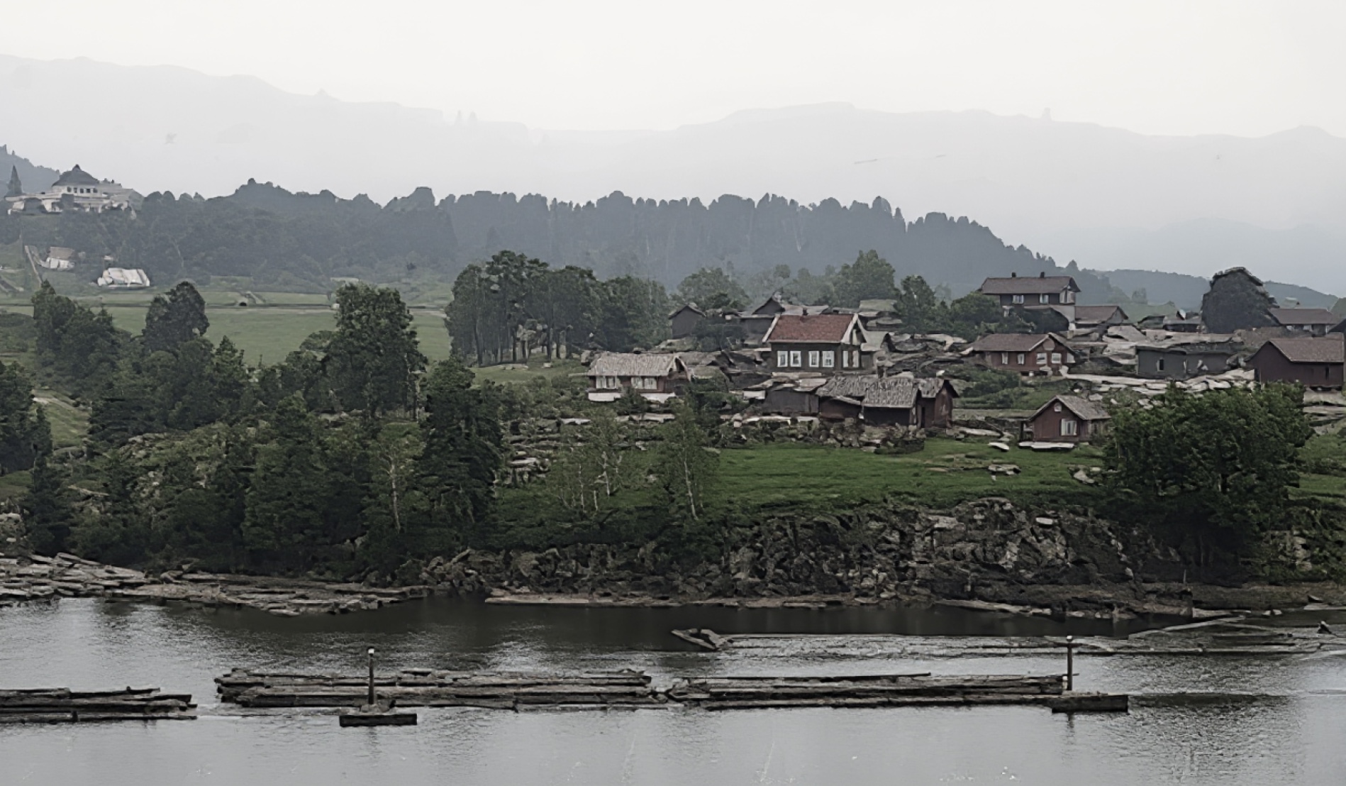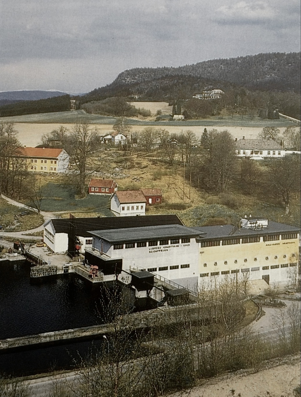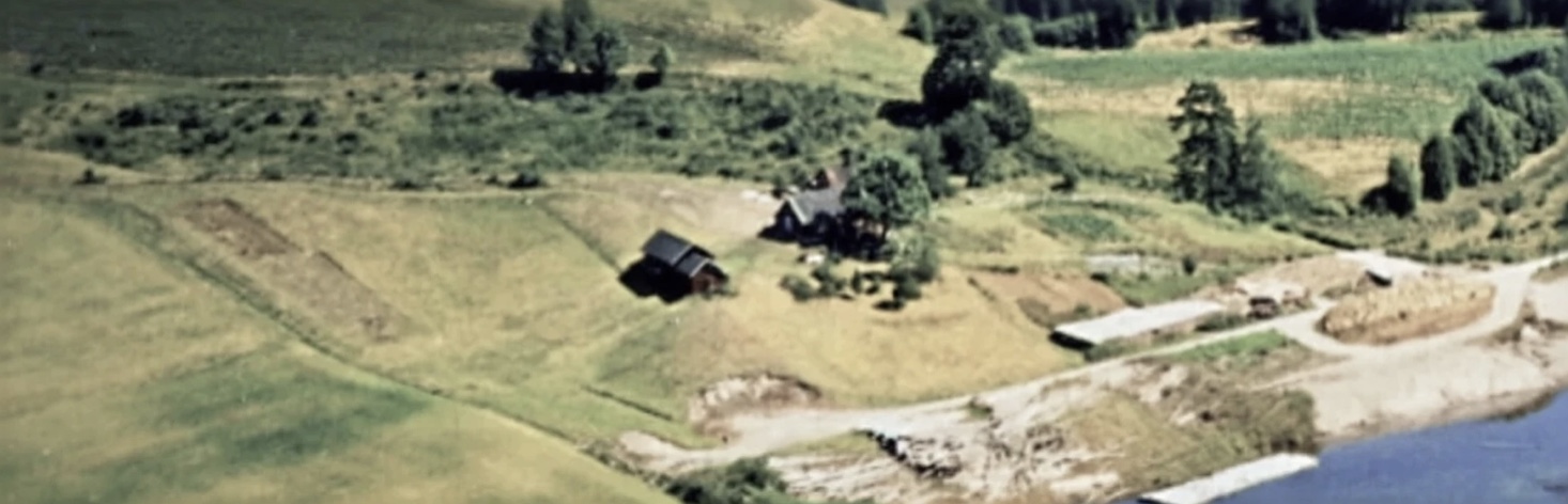 Vi ser tørkeriet te cellulose-massa og vi skimtar ein gammal veistubb som går parallelt med dagens vei. Det røde huset er ein gammal Hølen-plass.