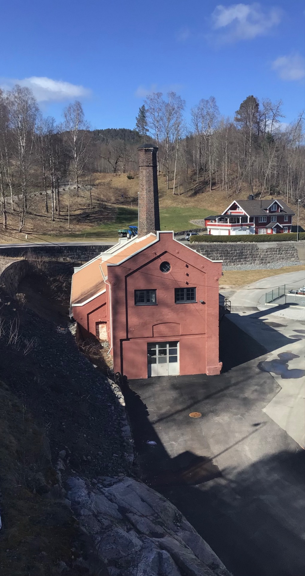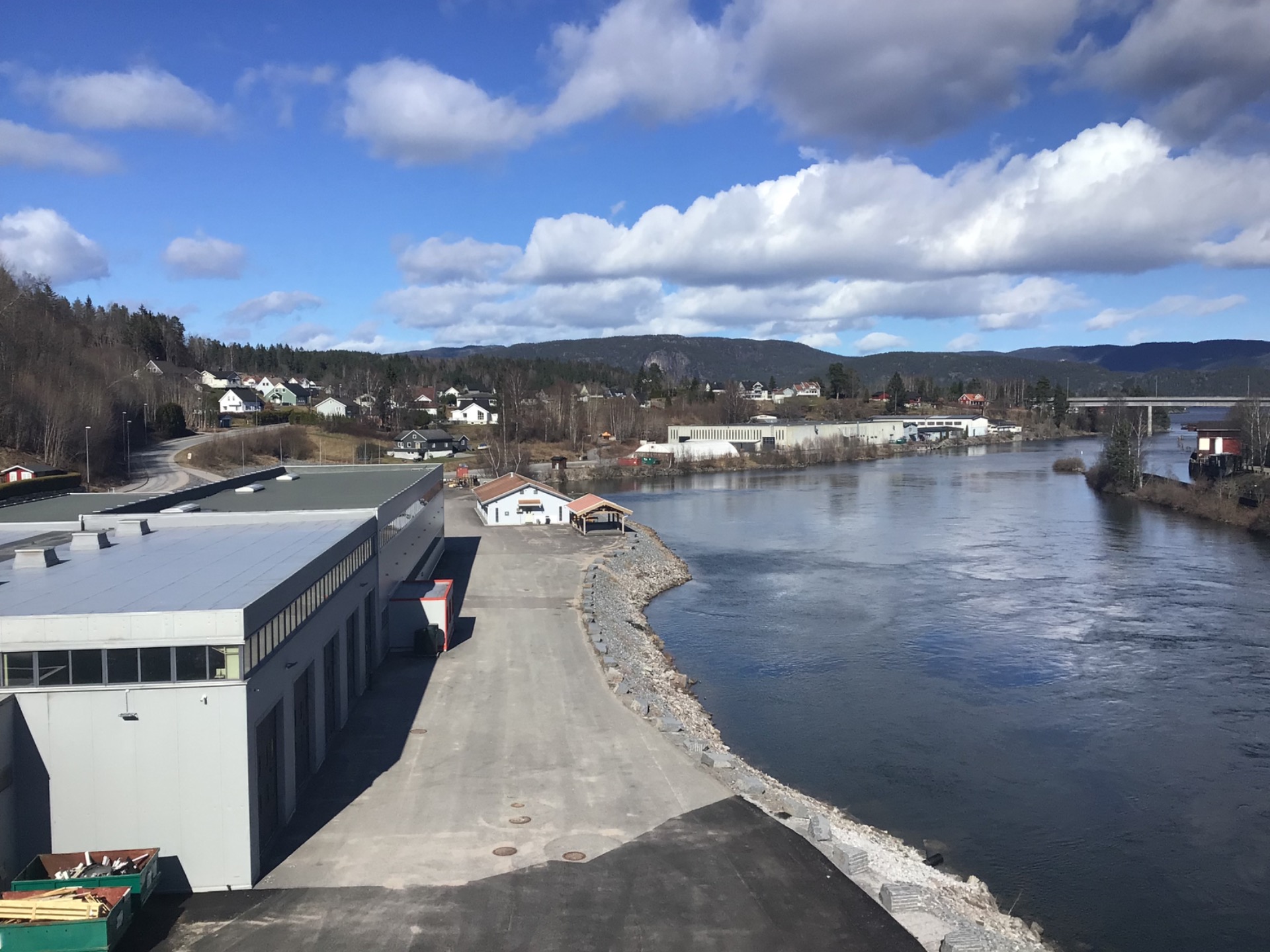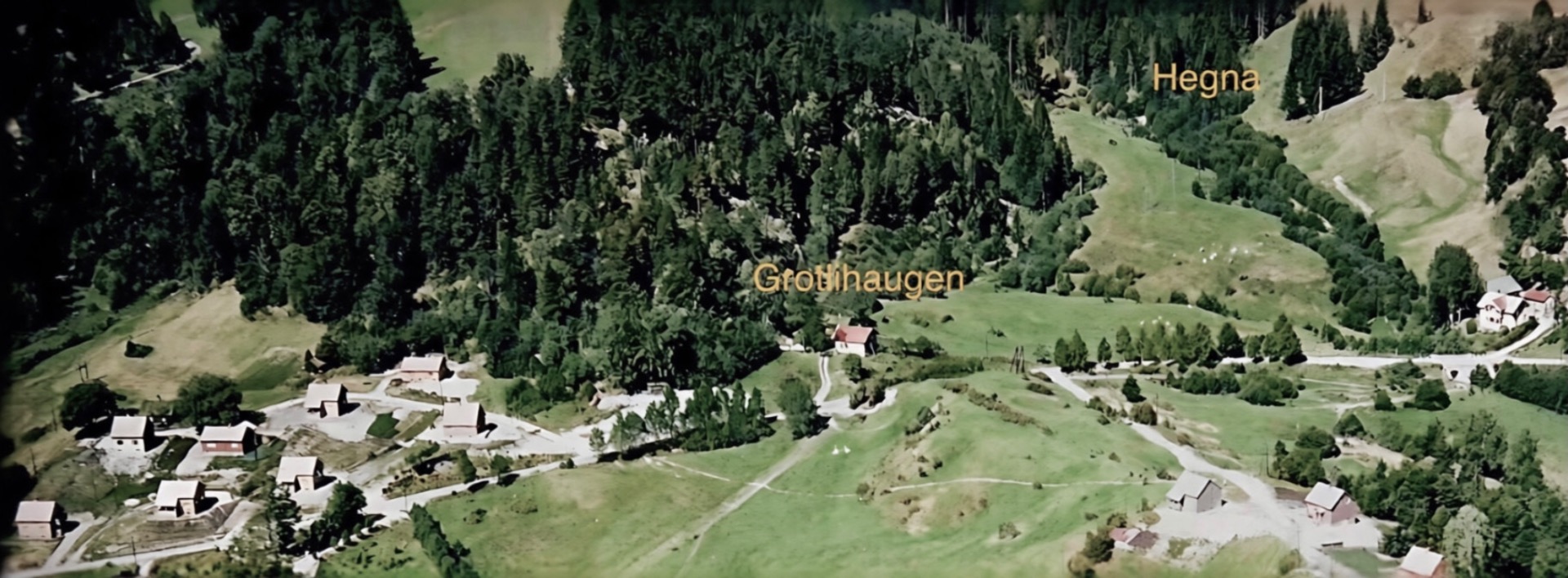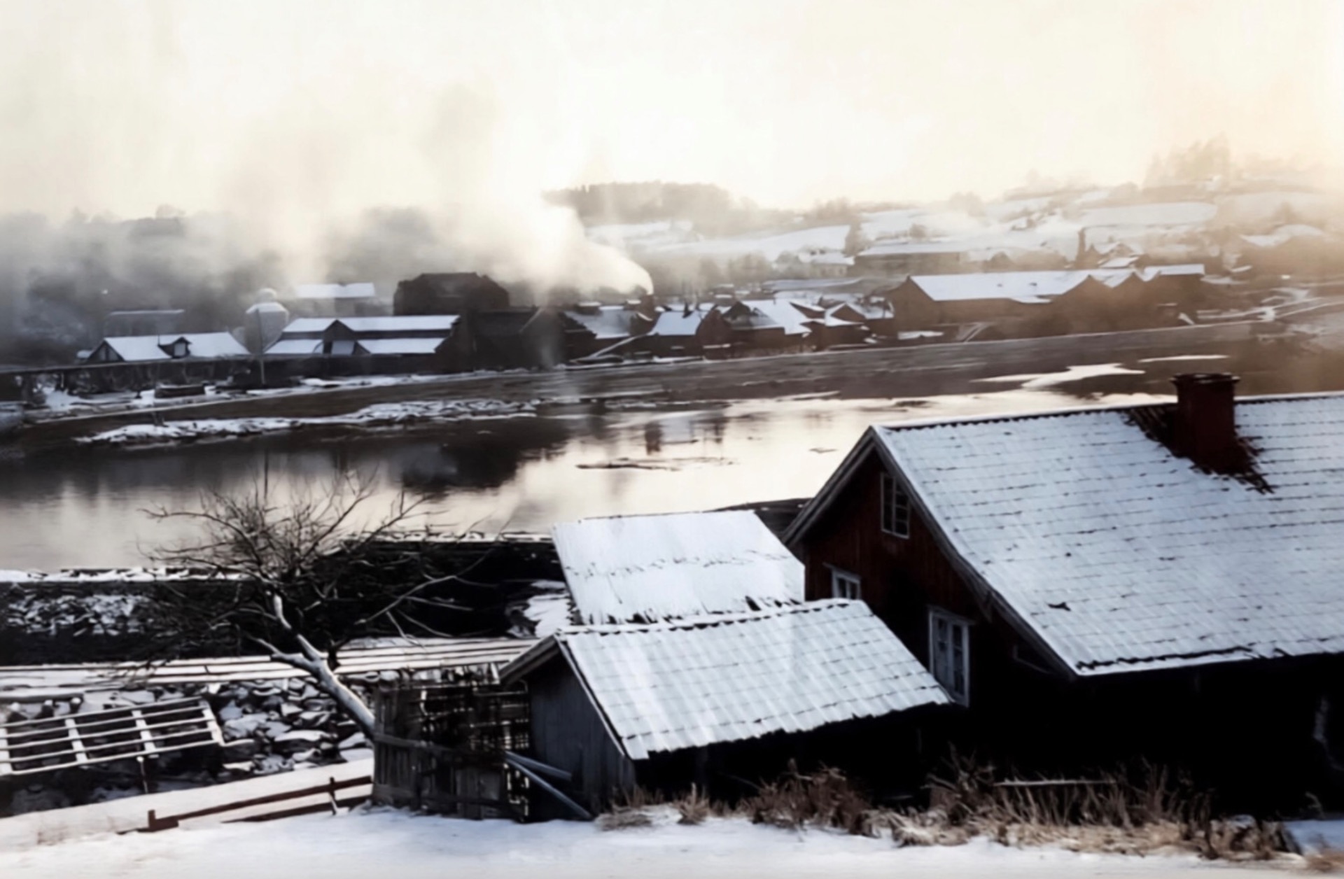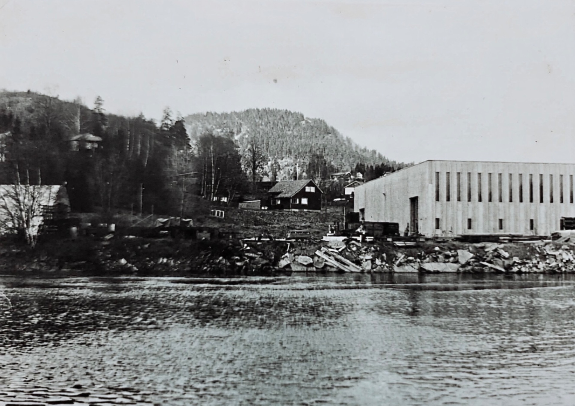 Vi ser tørkeriet te cellulose-massa og vi skimtar ein gammal veistubb som går parallelt med dagens vei. Det røde huset er ein gammal Hølen-plass.