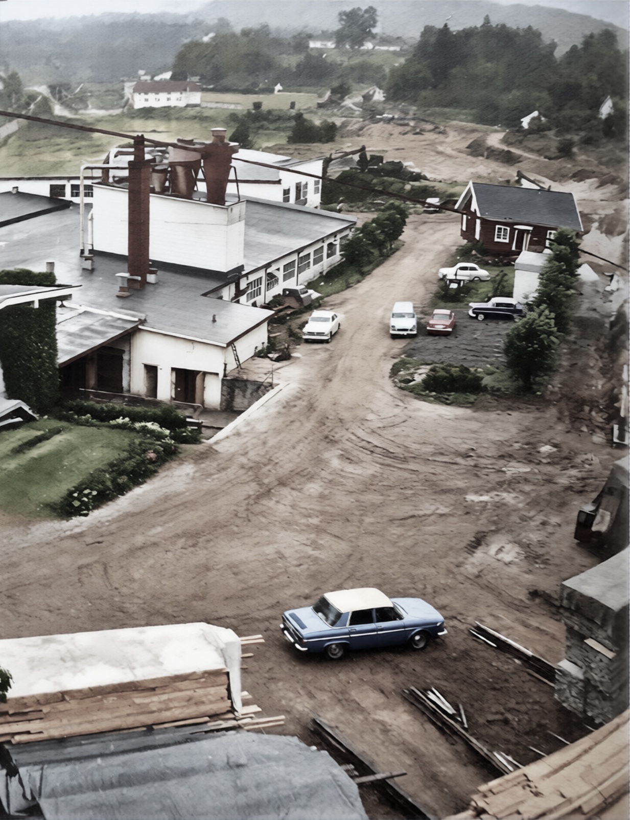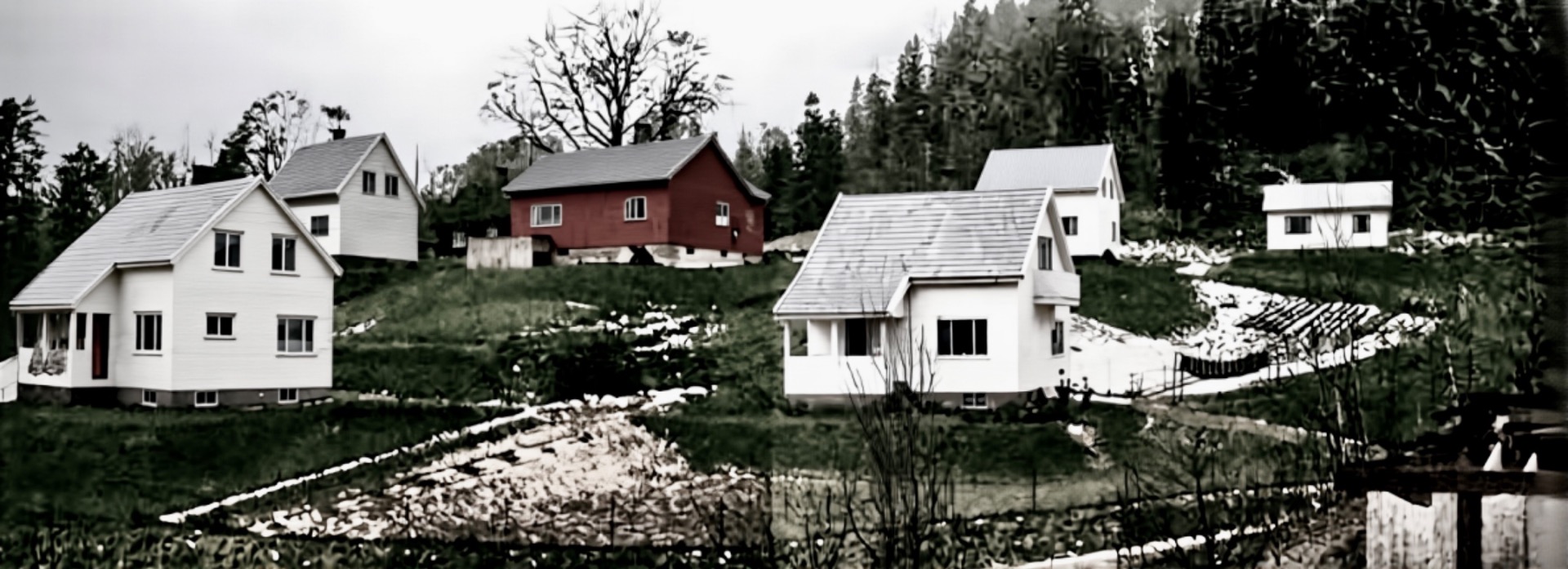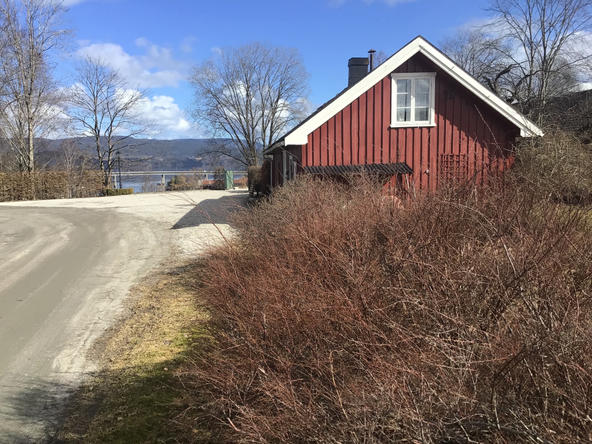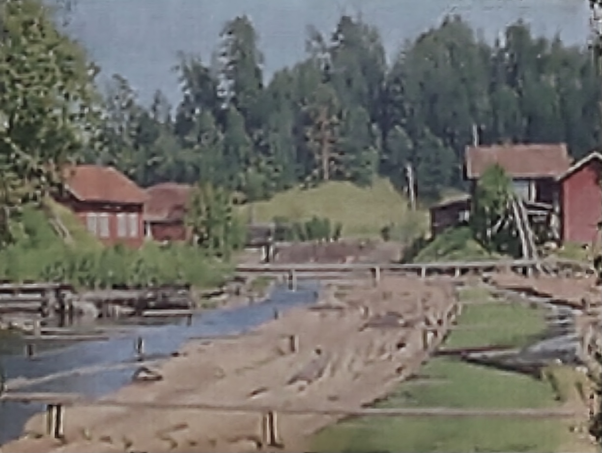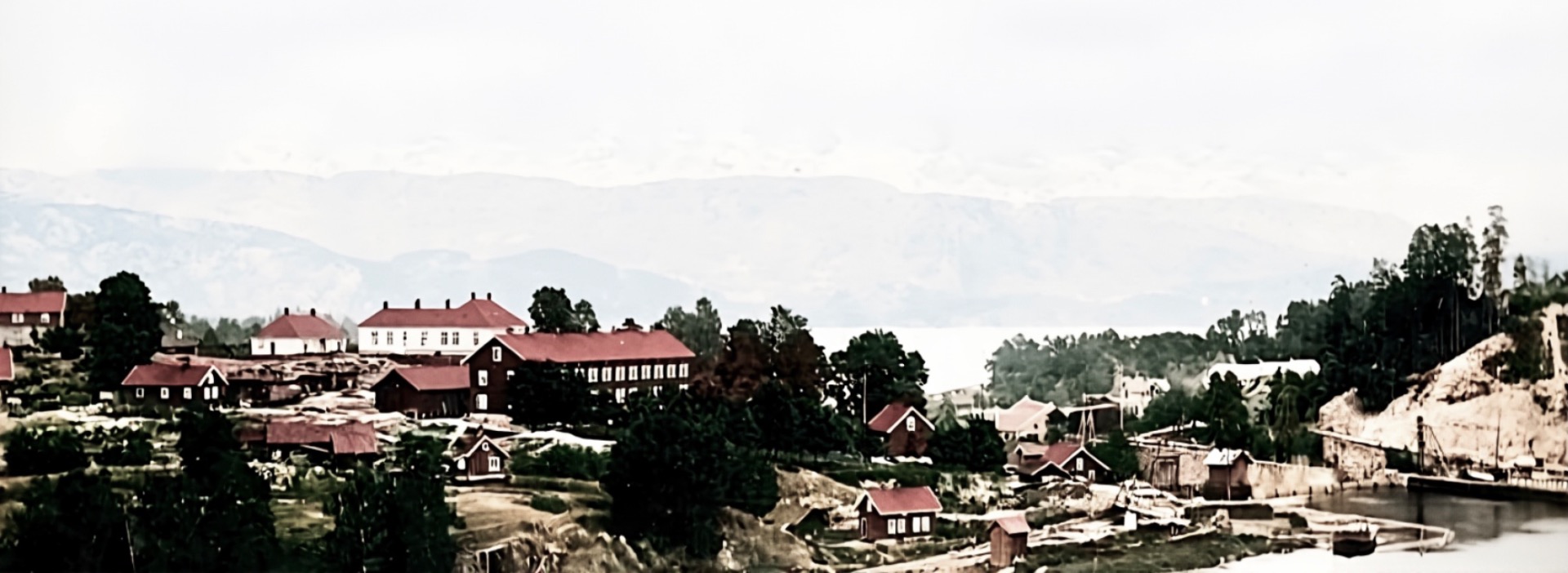 Vi ser tørkeriet te cellulose-massa og vi skimtar ein gammal veistubb som går parallelt med dagens vei. Det røde huset er ein gammal Hølen-plass.