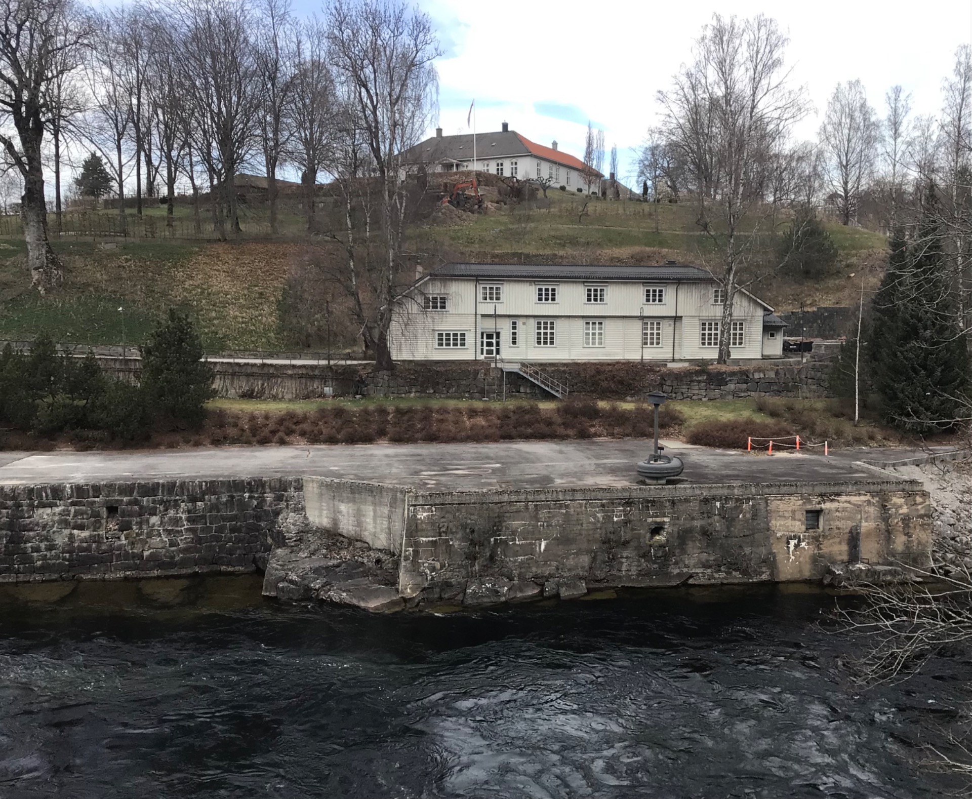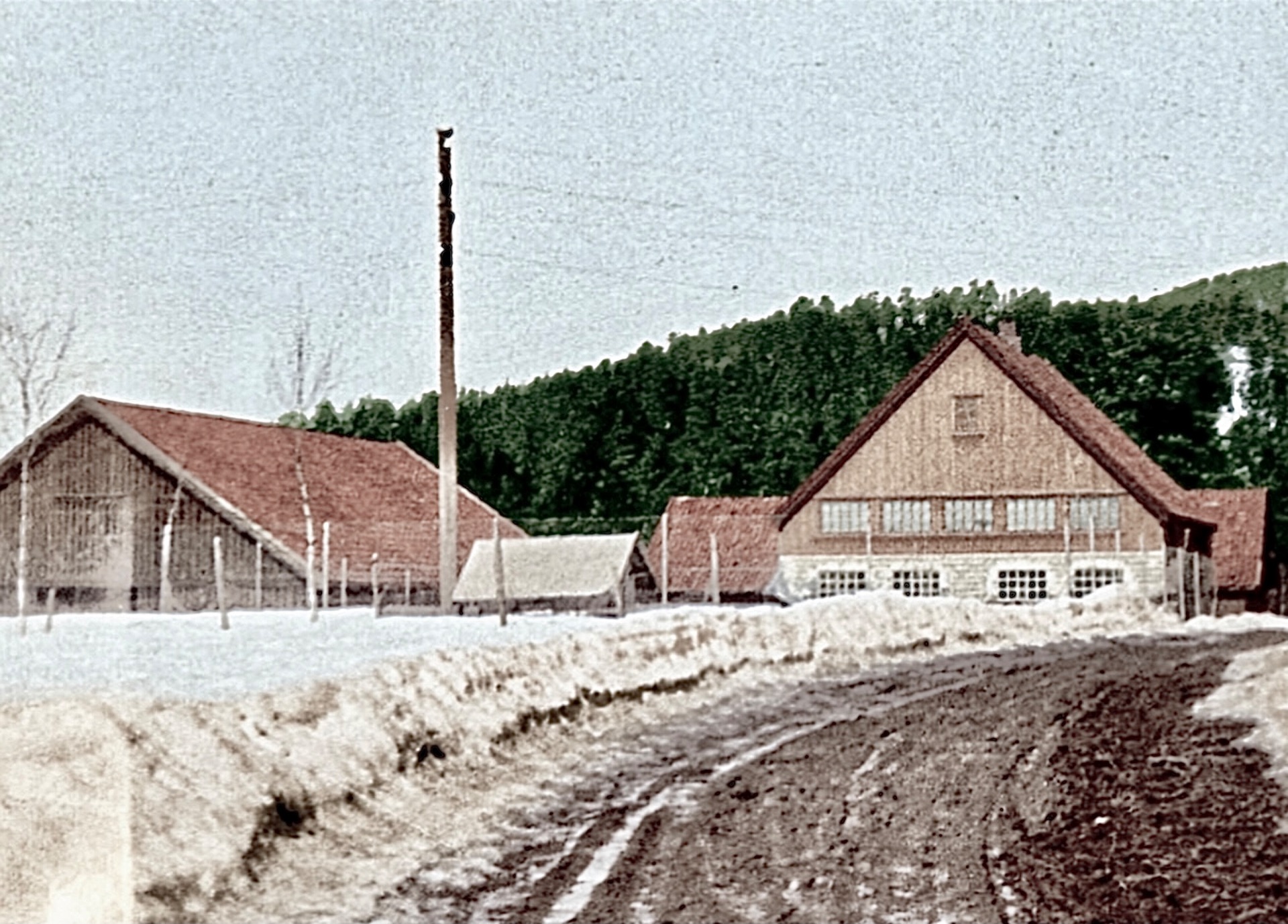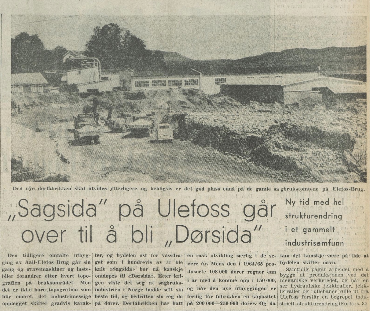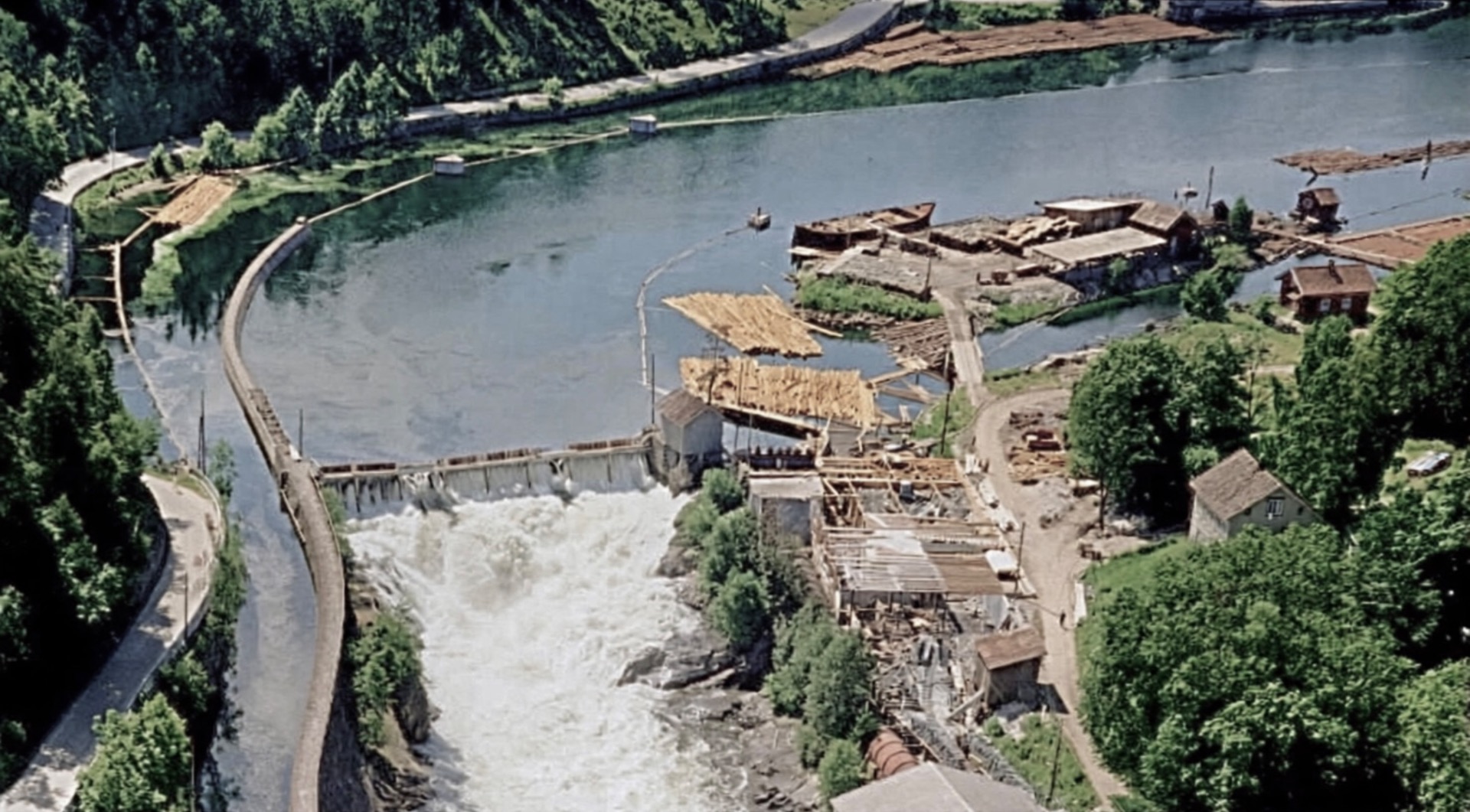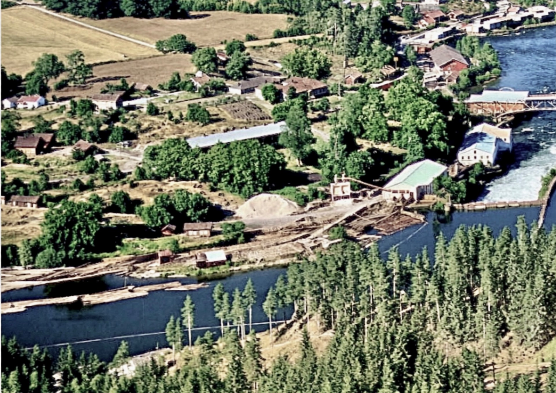 Vi ser tørkeriet te cellulose-massa og vi skimtar ein gammal veistubb som går parallelt med dagens vei. Det røde huset er ein gammal Hølen-plass.
