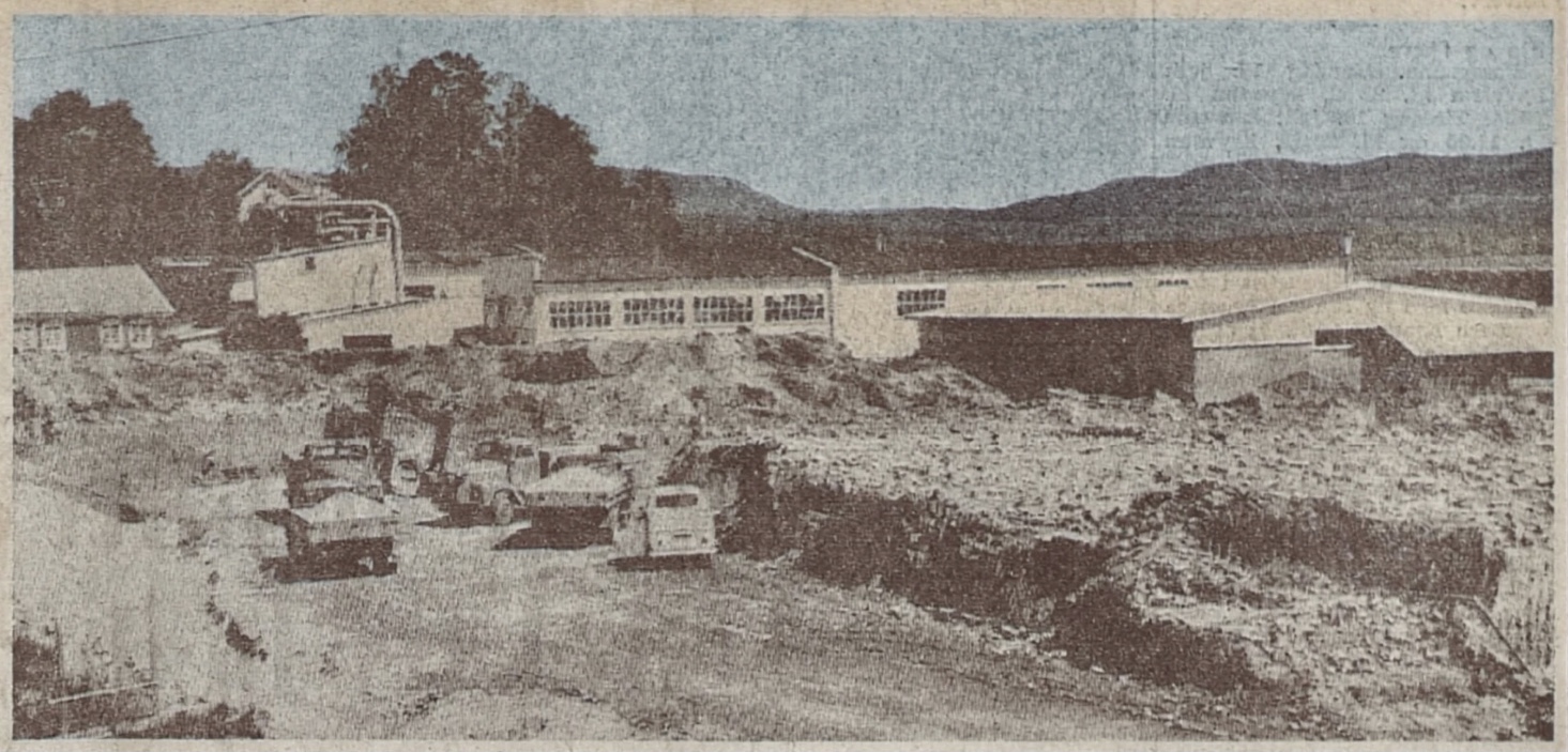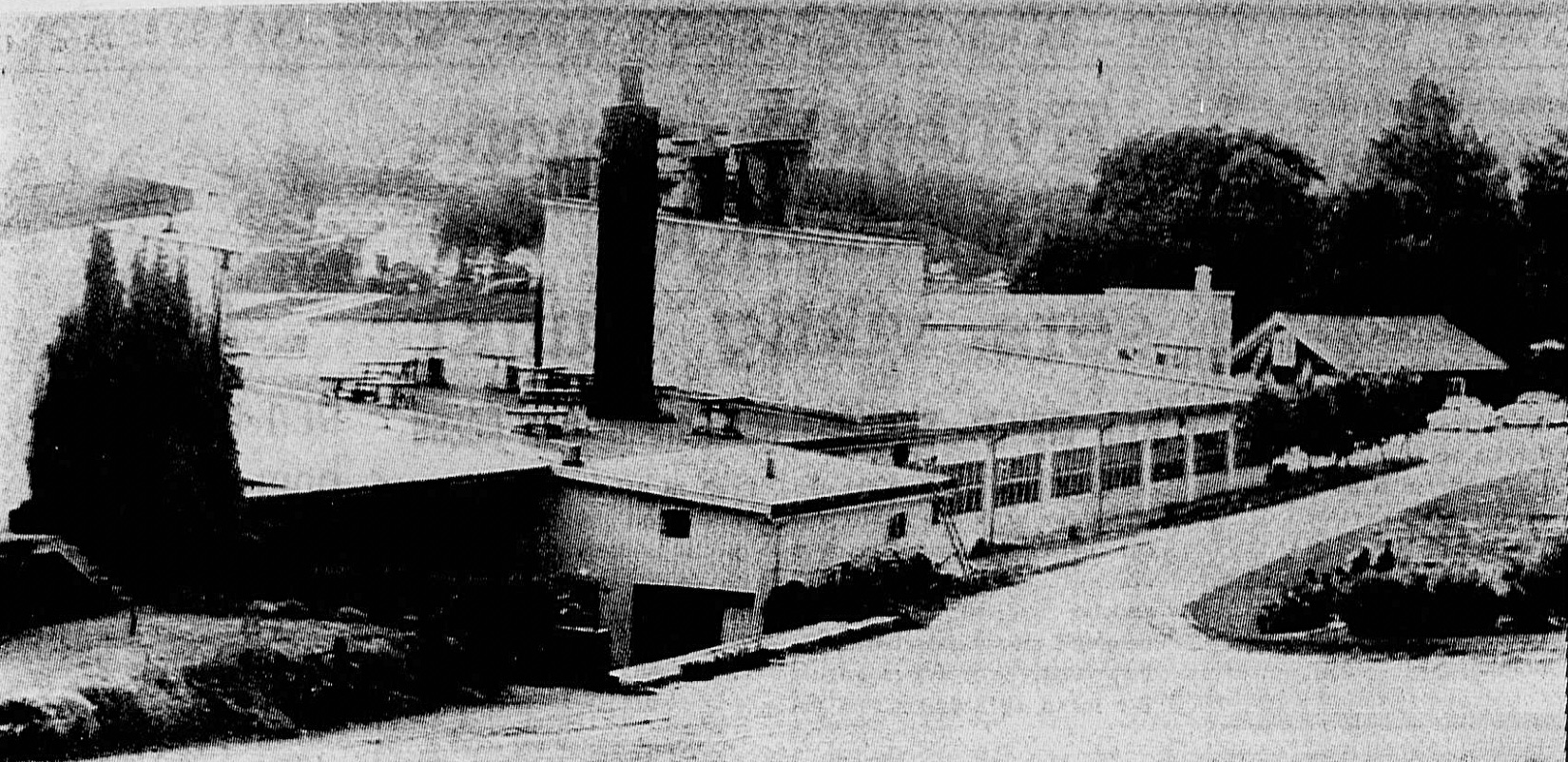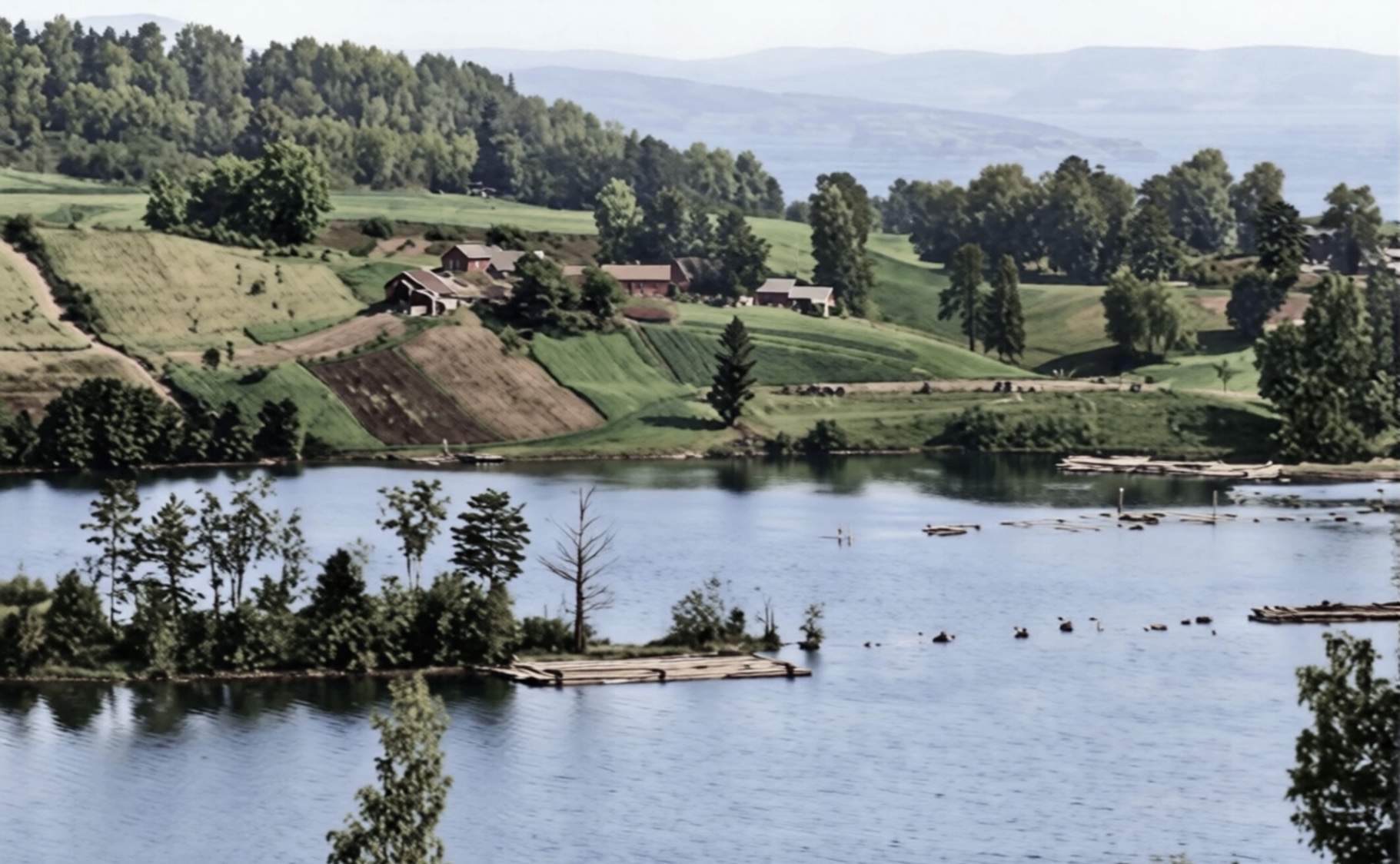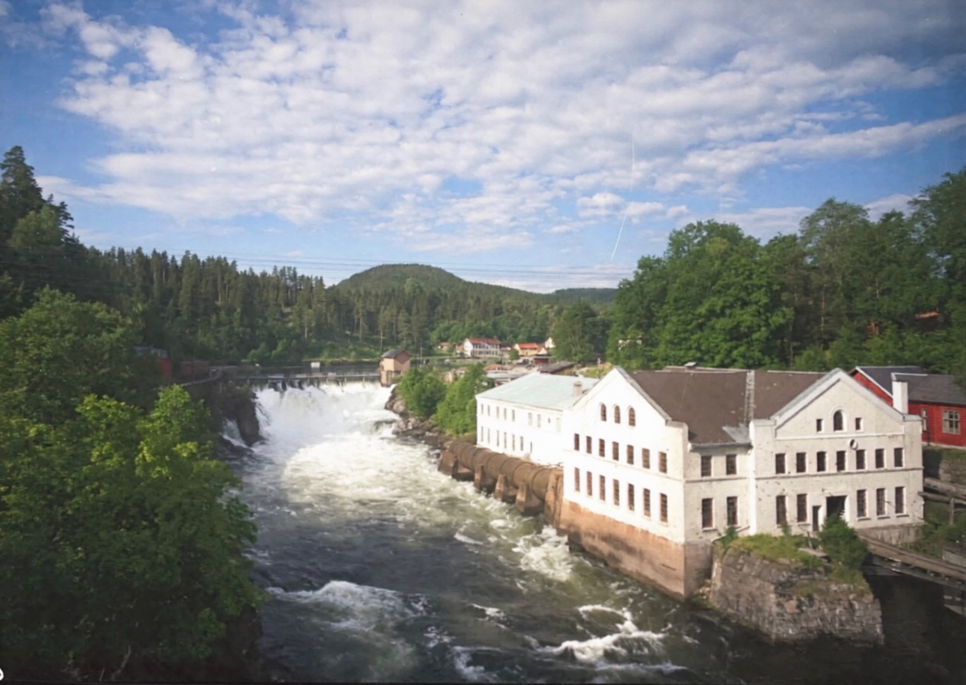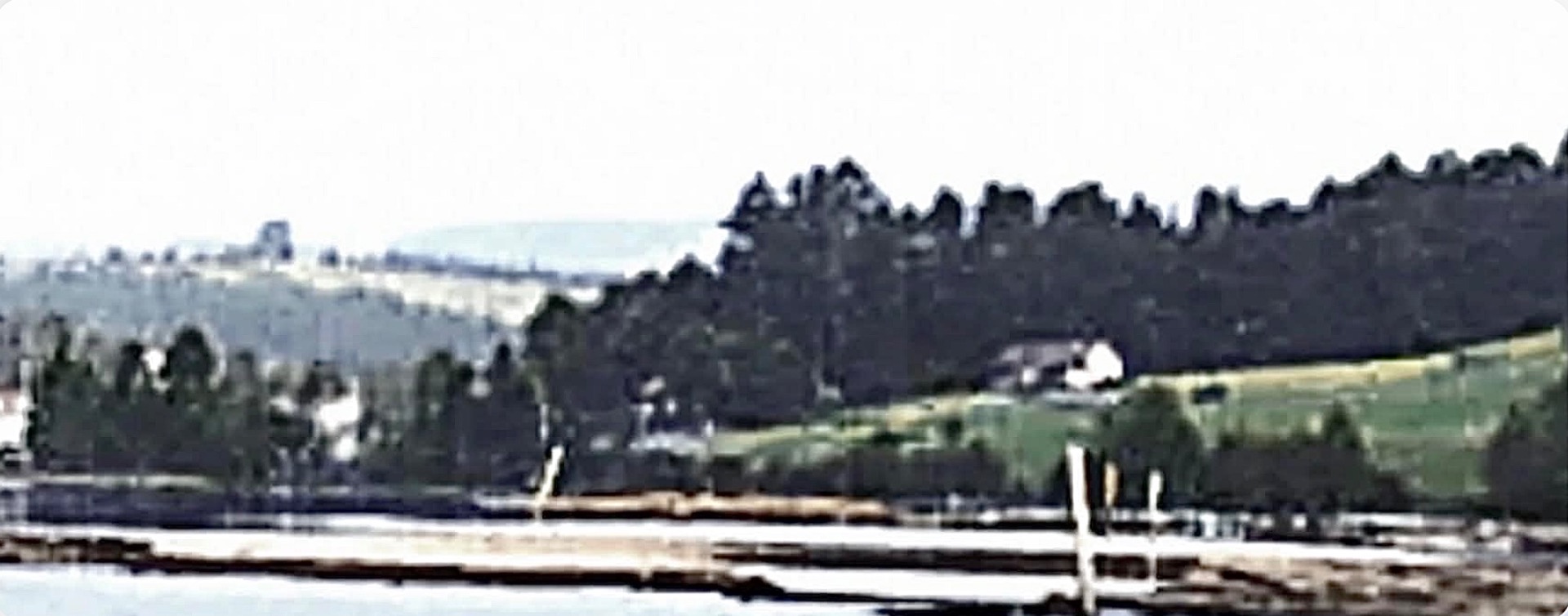 Vi ser tørkeriet te cellulose-massa og vi skimtar ein gammal veistubb som går parallelt med dagens vei. Det røde huset er ein gammal Hølen-plass.