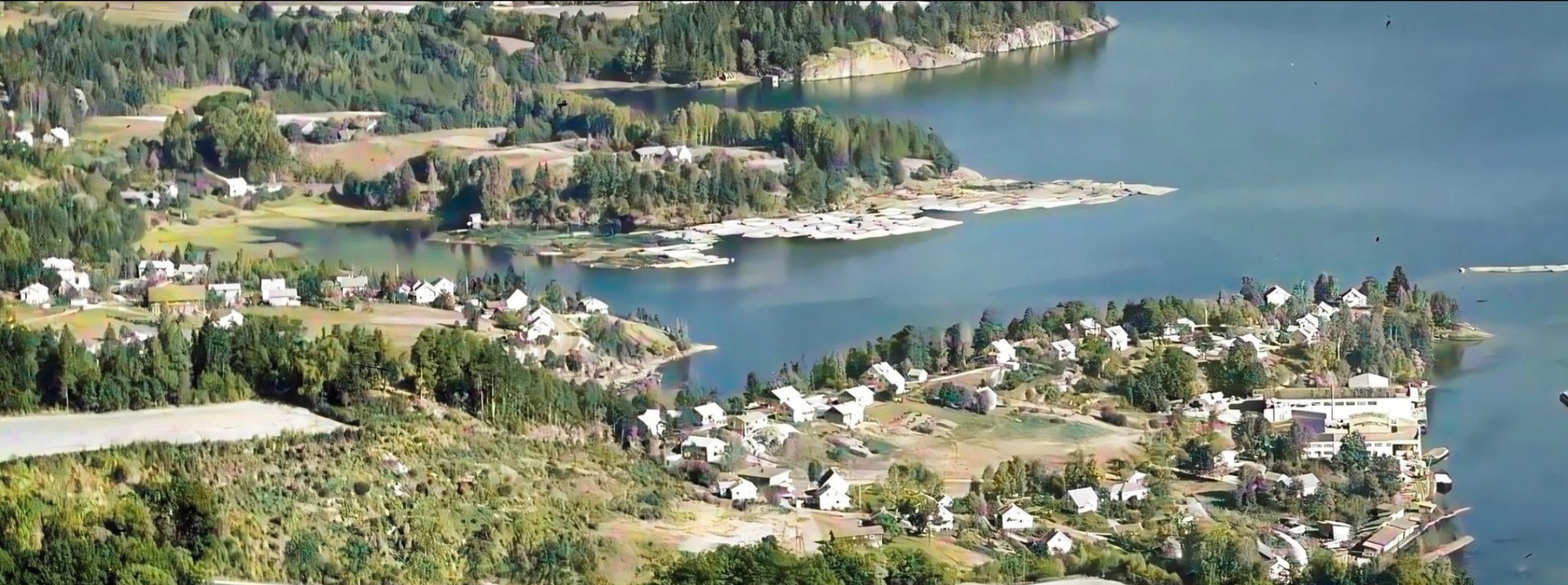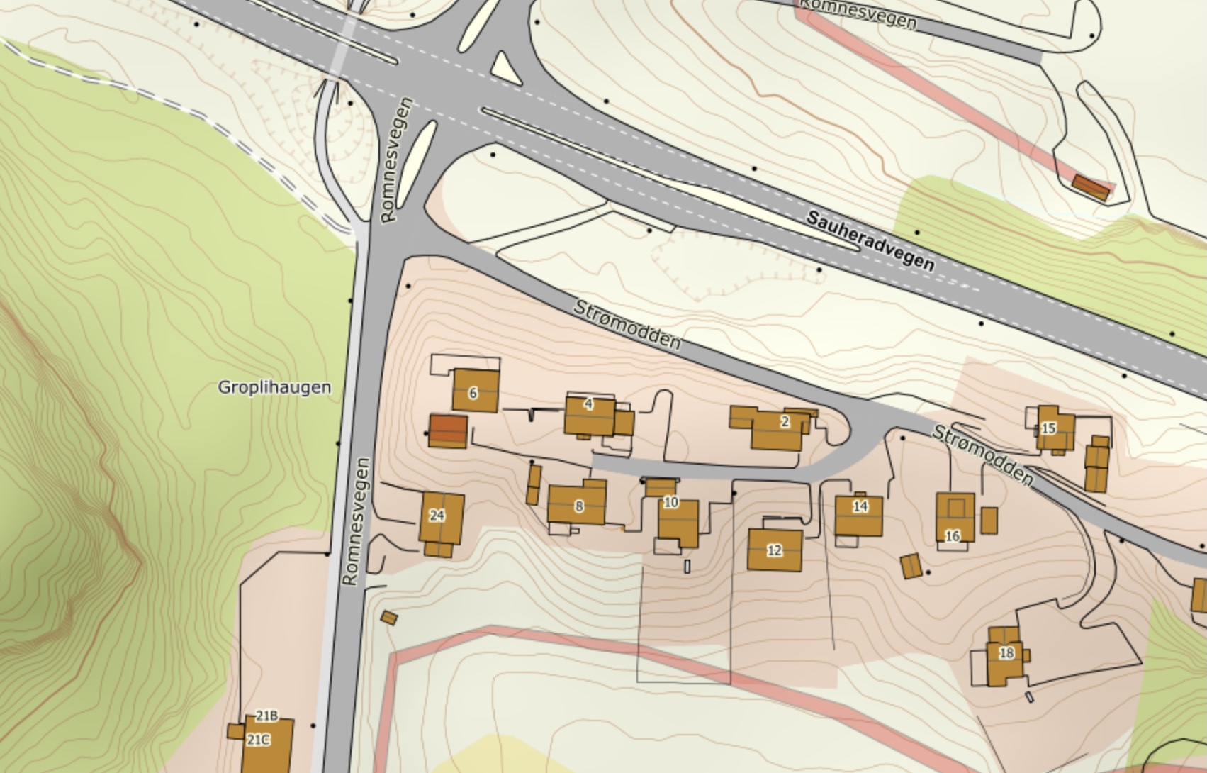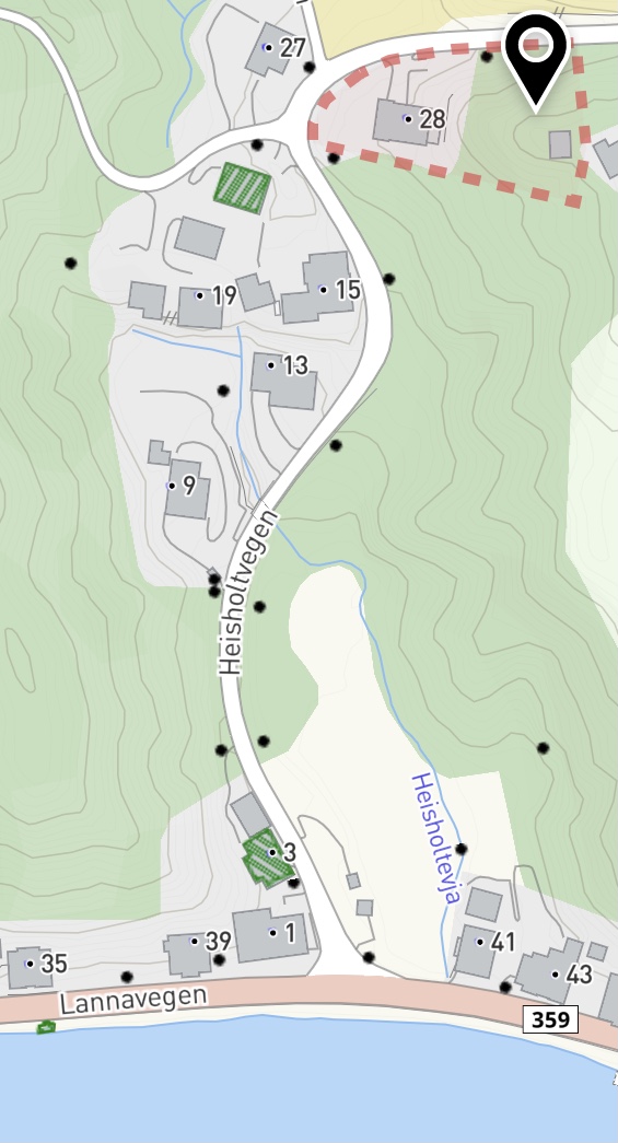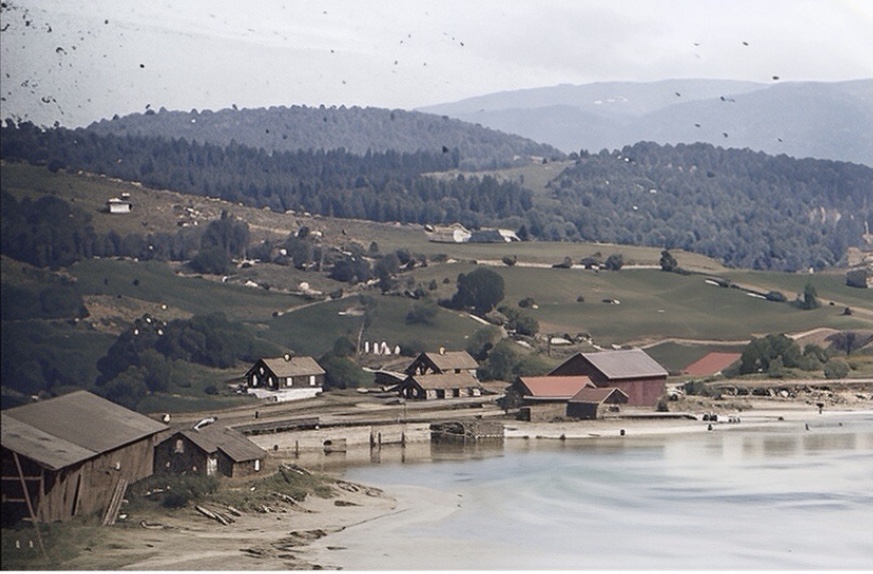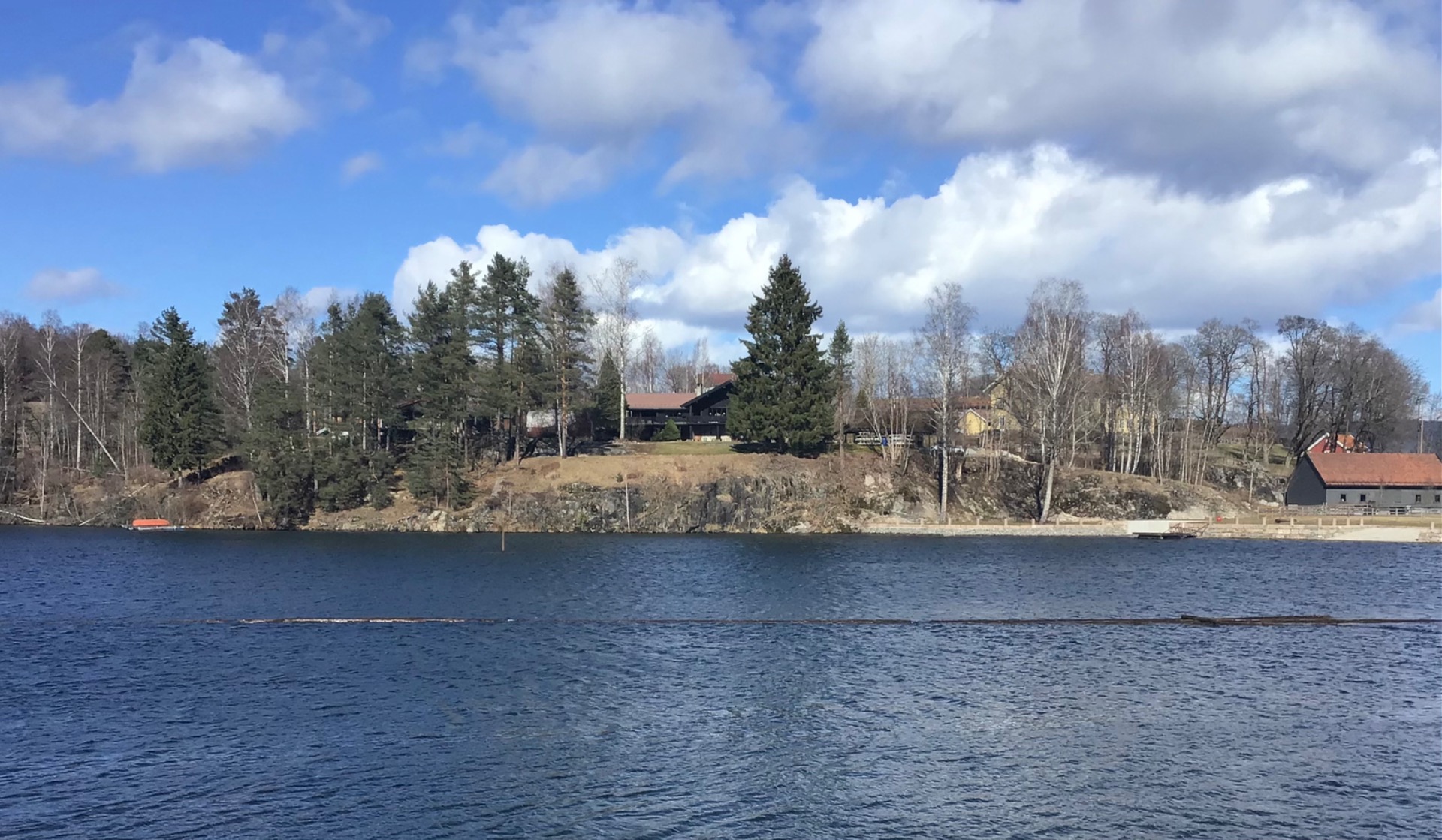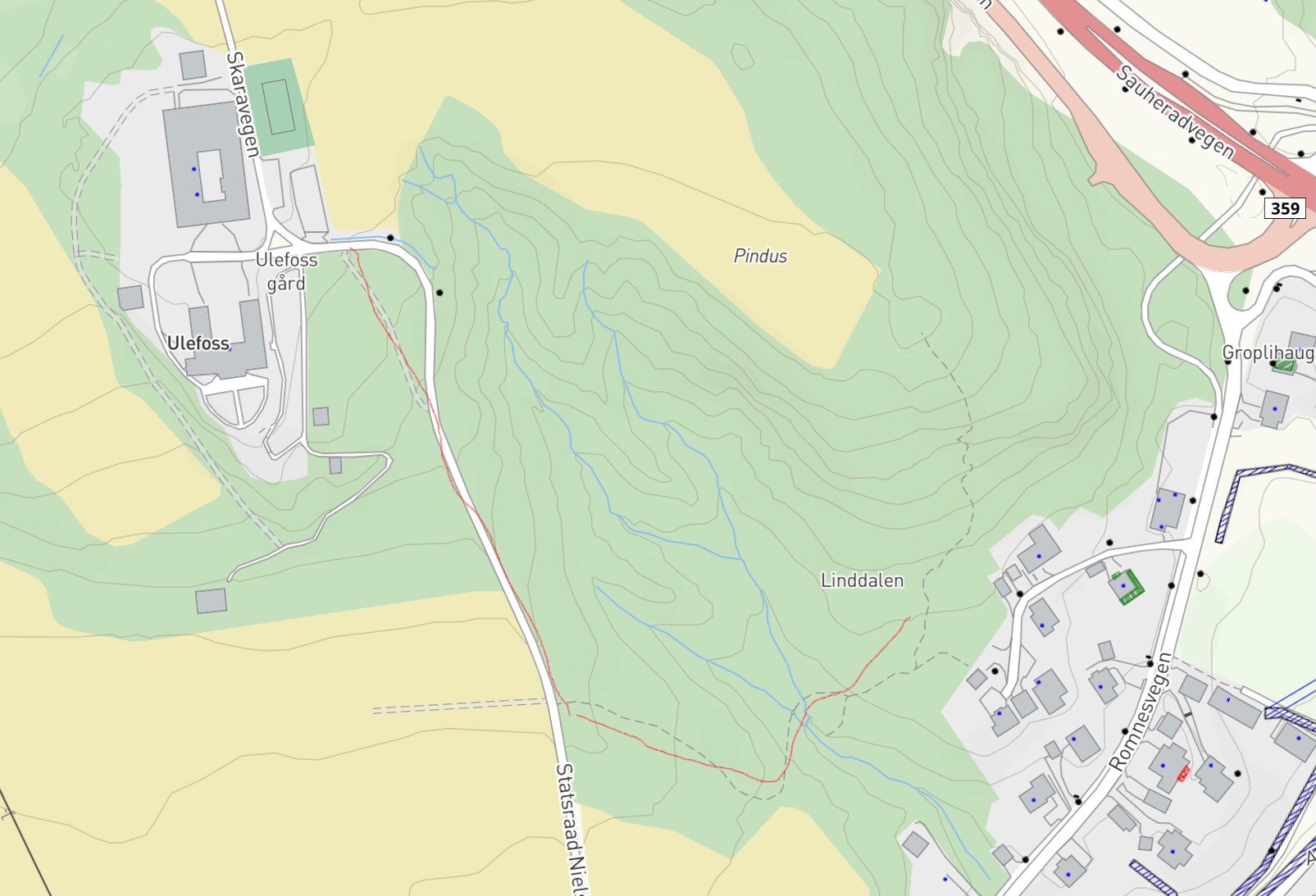 Vi ser tørkeriet te cellulose-massa og vi skimtar ein gammal veistubb som går parallelt med dagens vei. Det røde huset er ein gammal Hølen-plass.