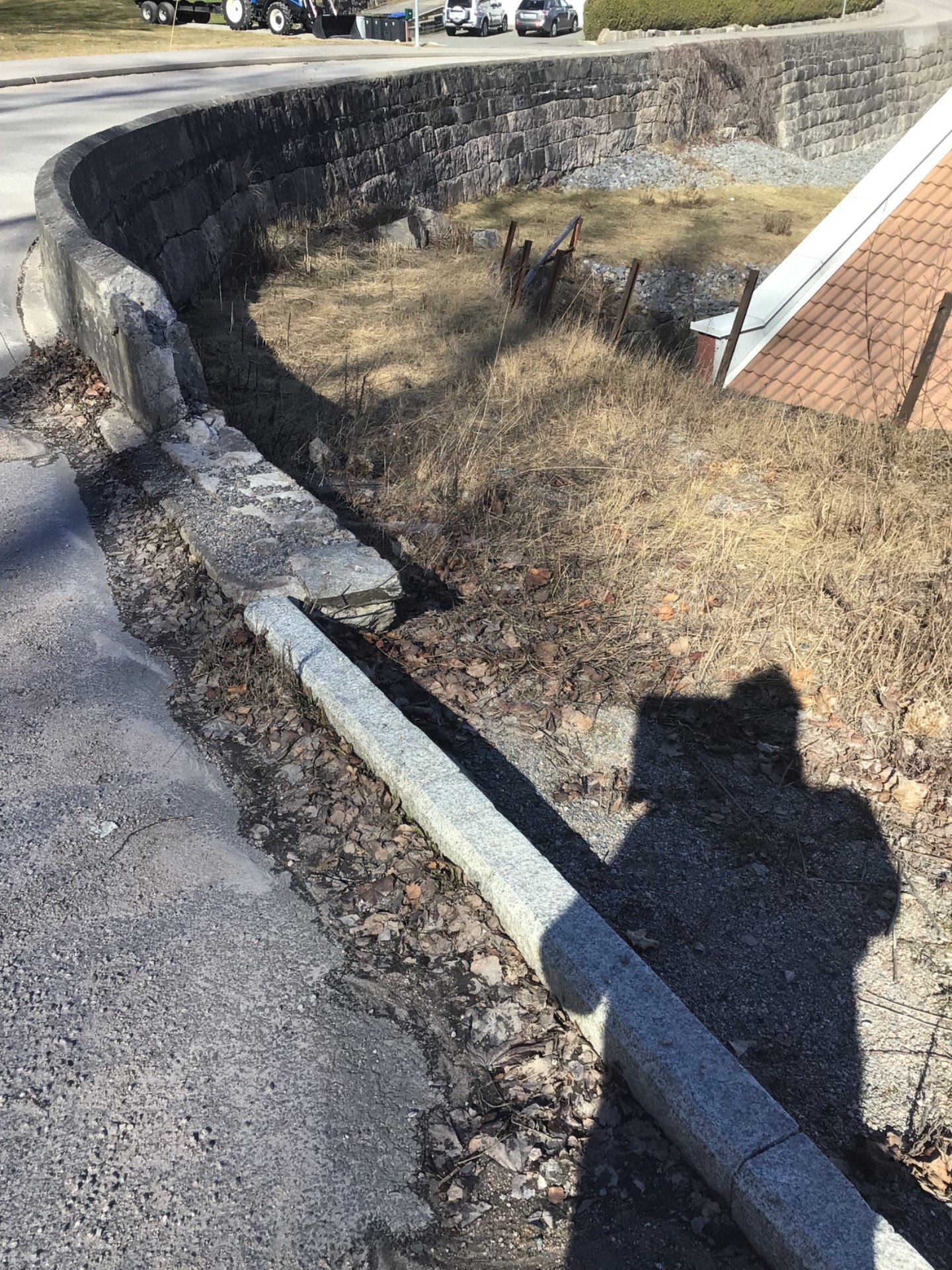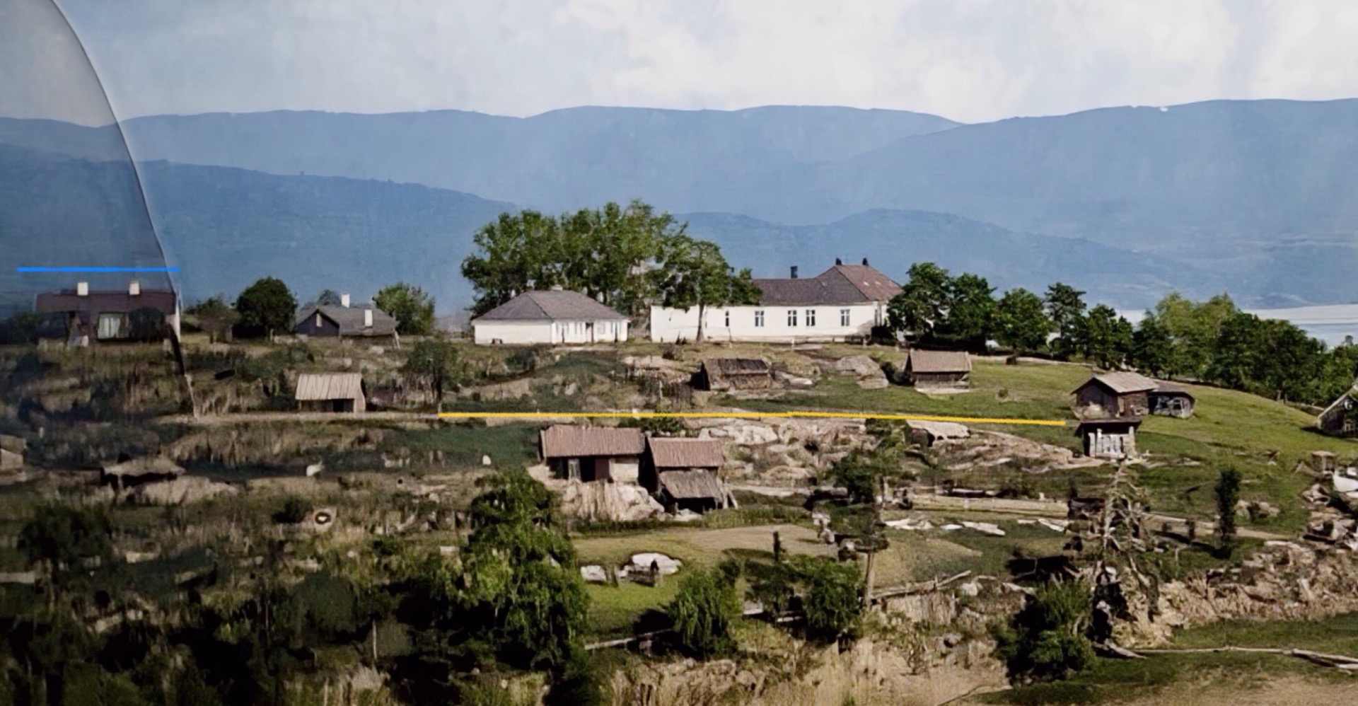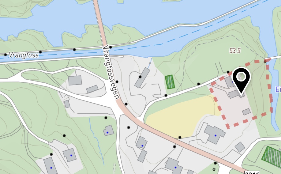 Blå strek i to bilder over: Her ser vi det samma huset som siden blei rivd.