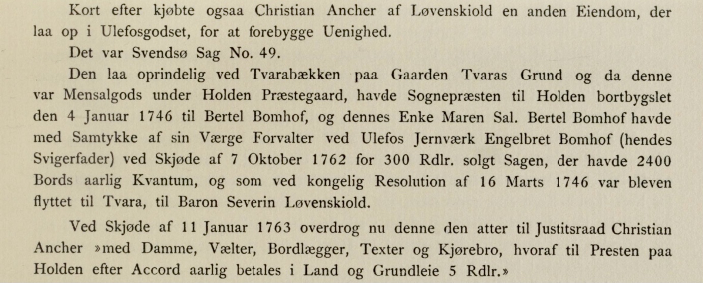 Saga under prestegården hadde liggi på grunnen te Tvara og hette først Svendsø. Den er helst oppkalt etter presten Herr Svend Olsen som dør i 1659. Ska vi tru at presten får prestegårdssaga i gang rundt 1630? Han va prest i Holla mellom 1619 og te han dør. Jeg har undersøkt tvarabekken og saga har liggi på ei lita øy i bekken. Derav navnet. Saga blei rundt 1760 fløtta ned der bekken er striast, nemlig litt før den renner ut i Eidselva. Her skulle Tvara Handelslag siden drive. Under ser du presten Svend si øy i Tvarabekken:
